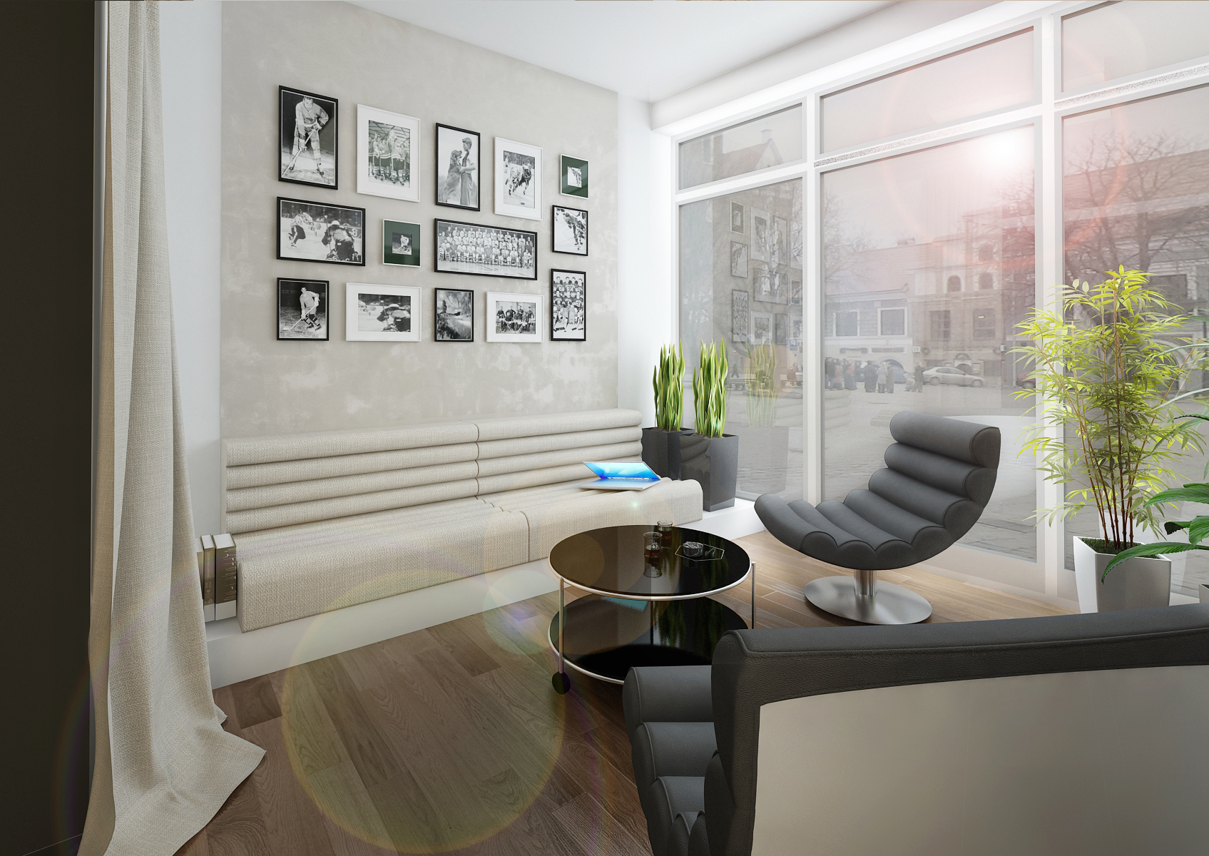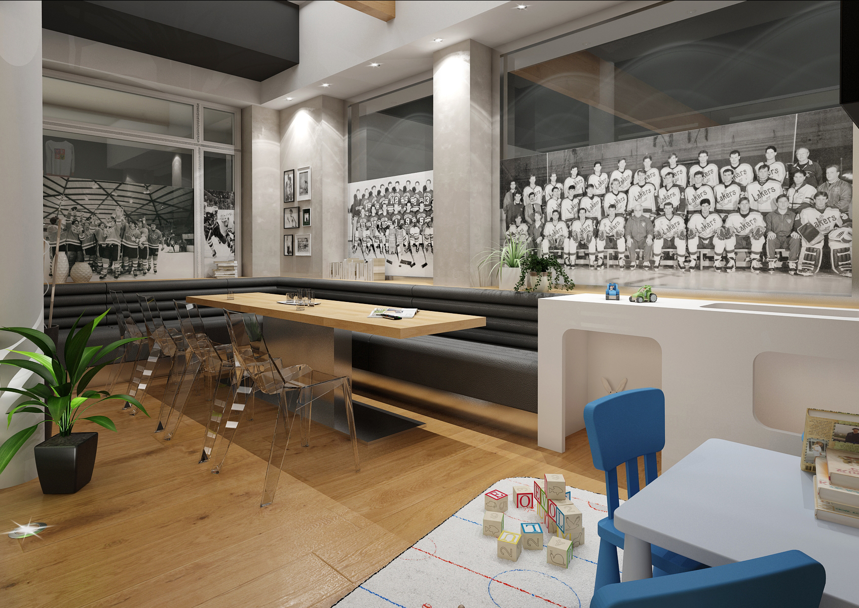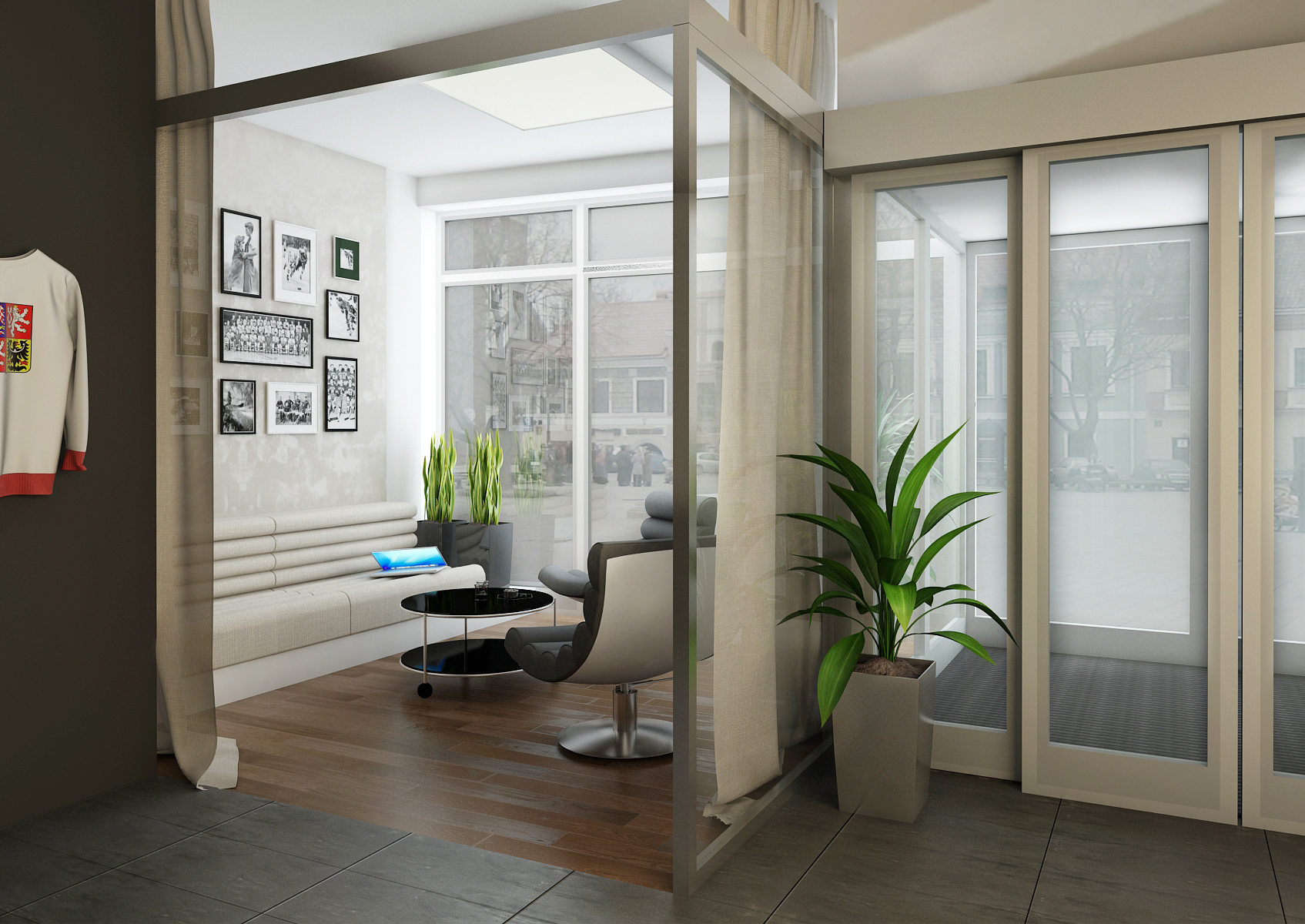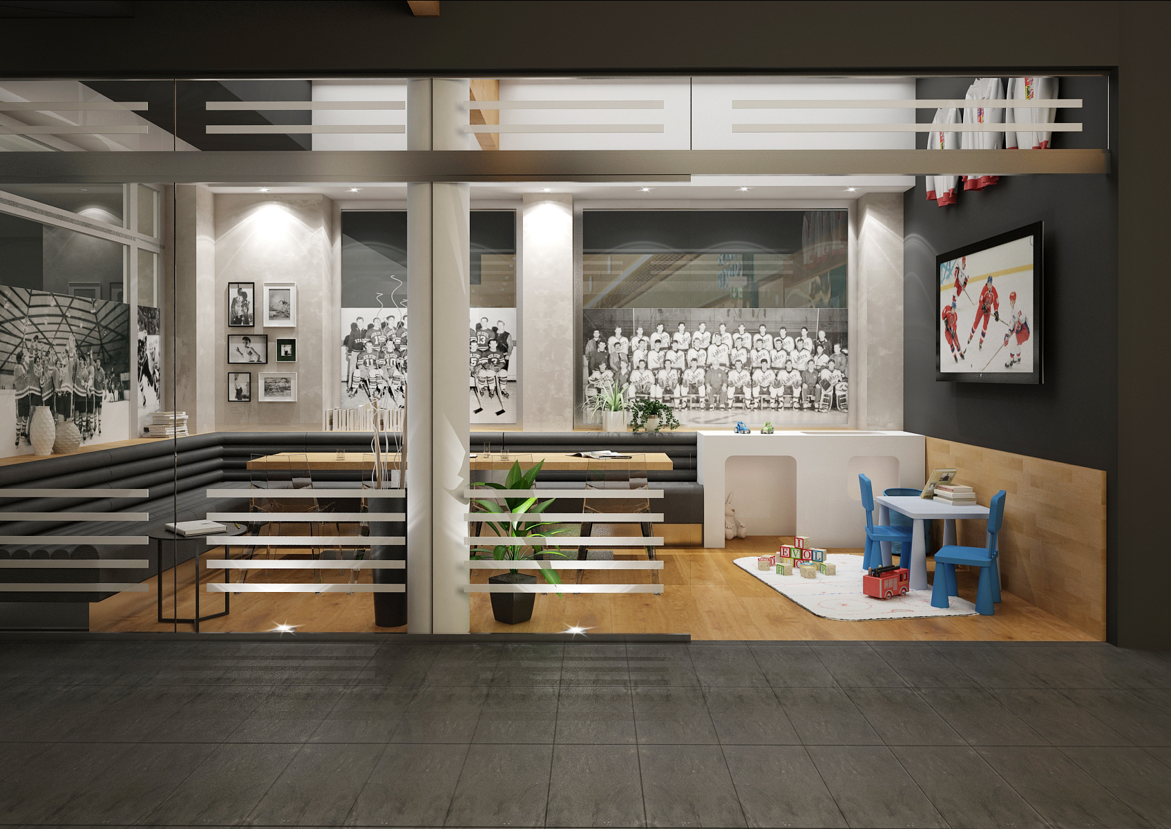 Boxes in the premises of the hotel and relaxation complex Buly Aréna in Kravaře. Designed for informal meetings and smaller celebrations. The decorations are provided by graphics and decorations from the past and present of our hockey team. Thanks to the choice of simple furniture and the combination of colors, the space looks simple. Light colors are underlined by the dark brown floor.