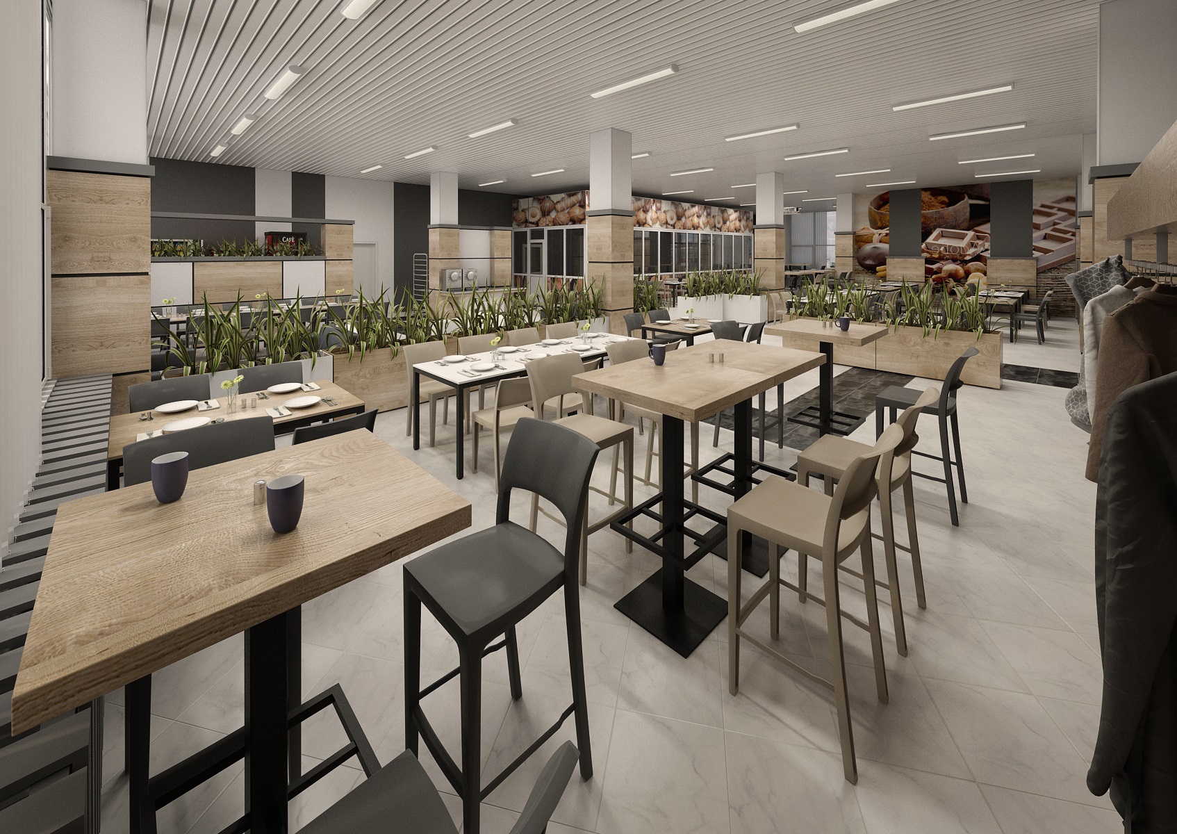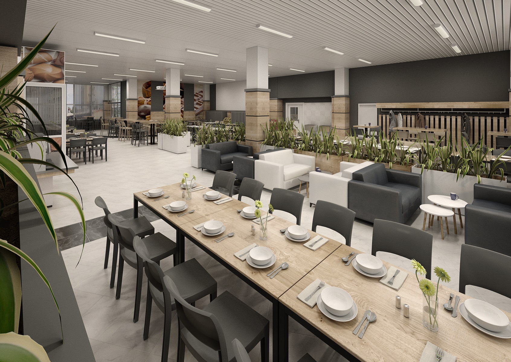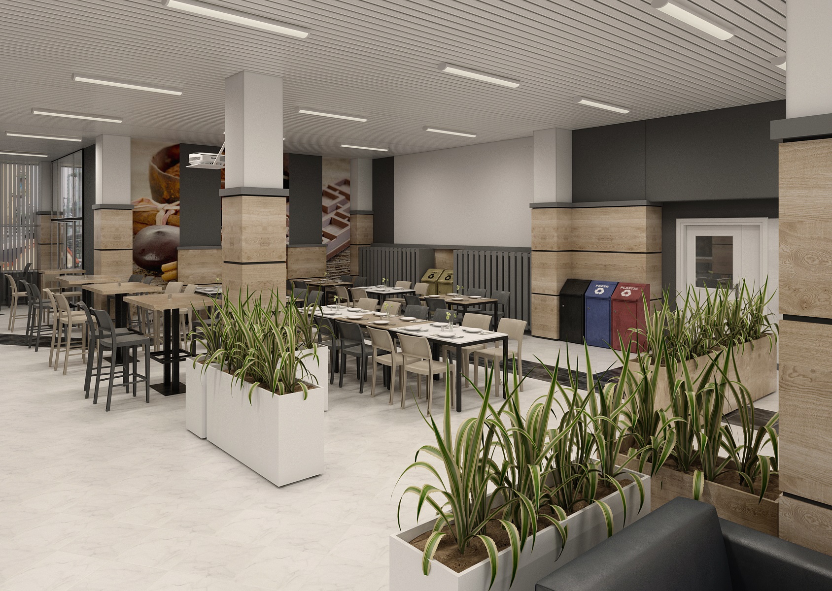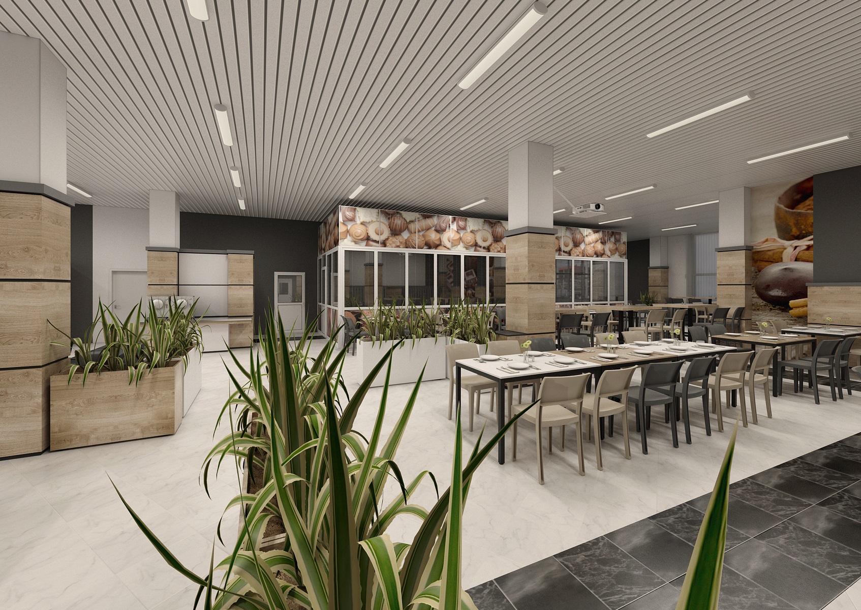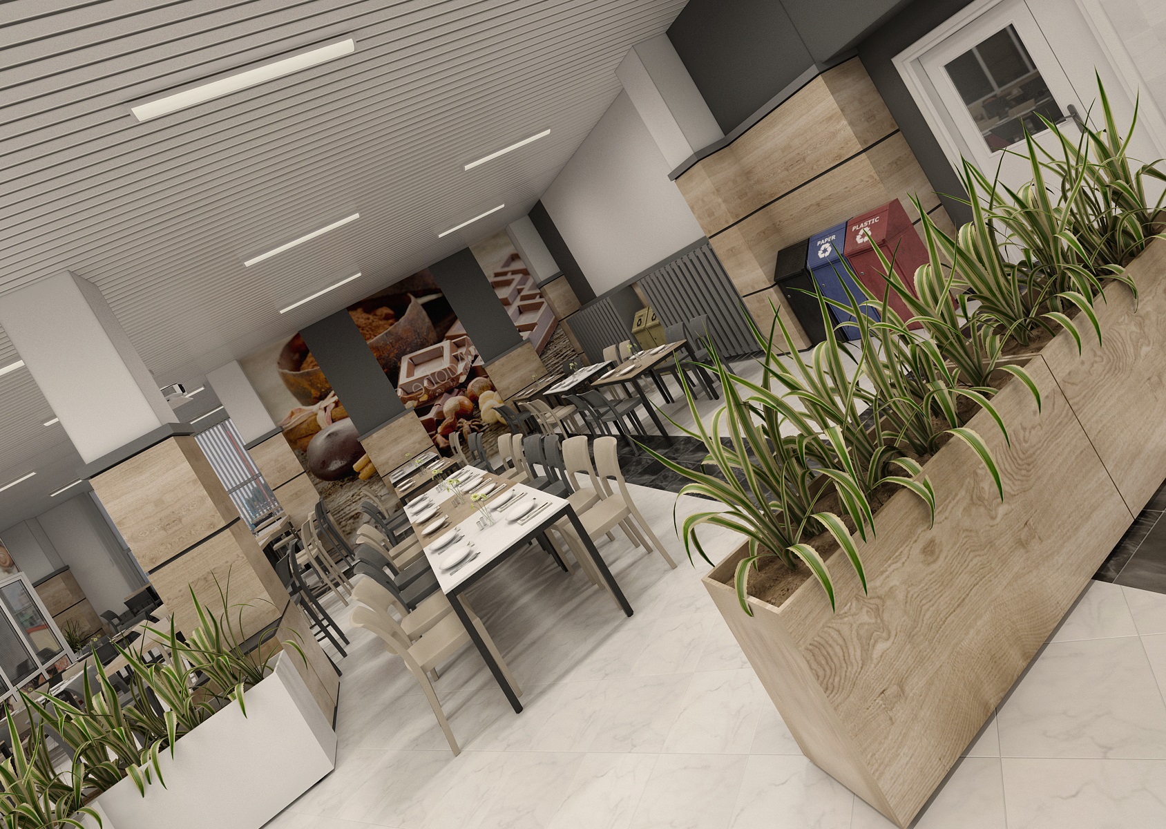 Creating a business cafeteria design for employees is always a pleasant challenge. Nice and functional environment for a lunch break, sitting with a coffee, gaining energy and with a taste for work. The space is decorated in light earthy colors in combination with marble tiles in white, which are intersected here and there by black tiles in various patterns. At the tables, two types of chairs alternate in light and dark material. An interesting element that makes the room modern is the tiling in light wood decor together with white minimalist flower pots. The walls are enriched with company-specific motifs.