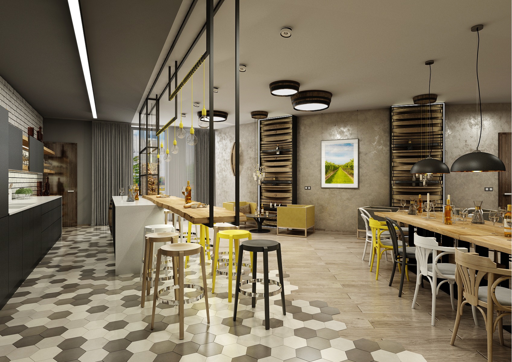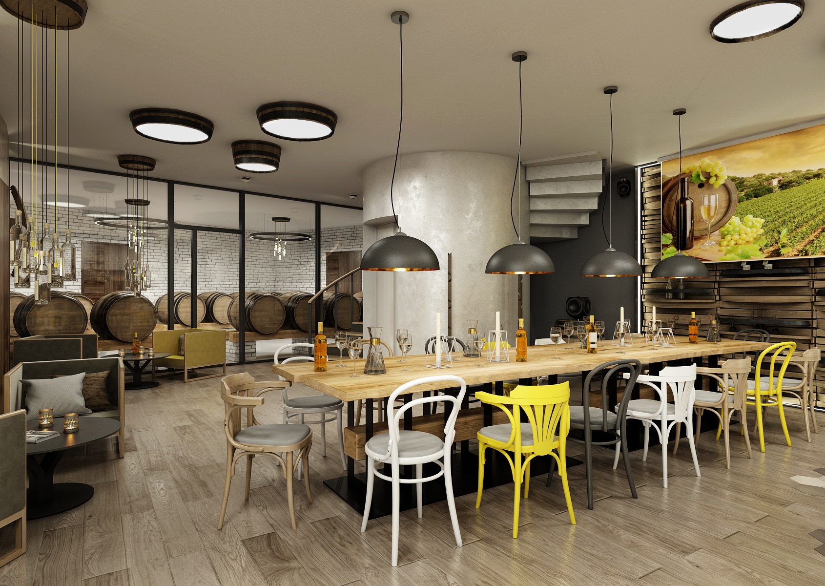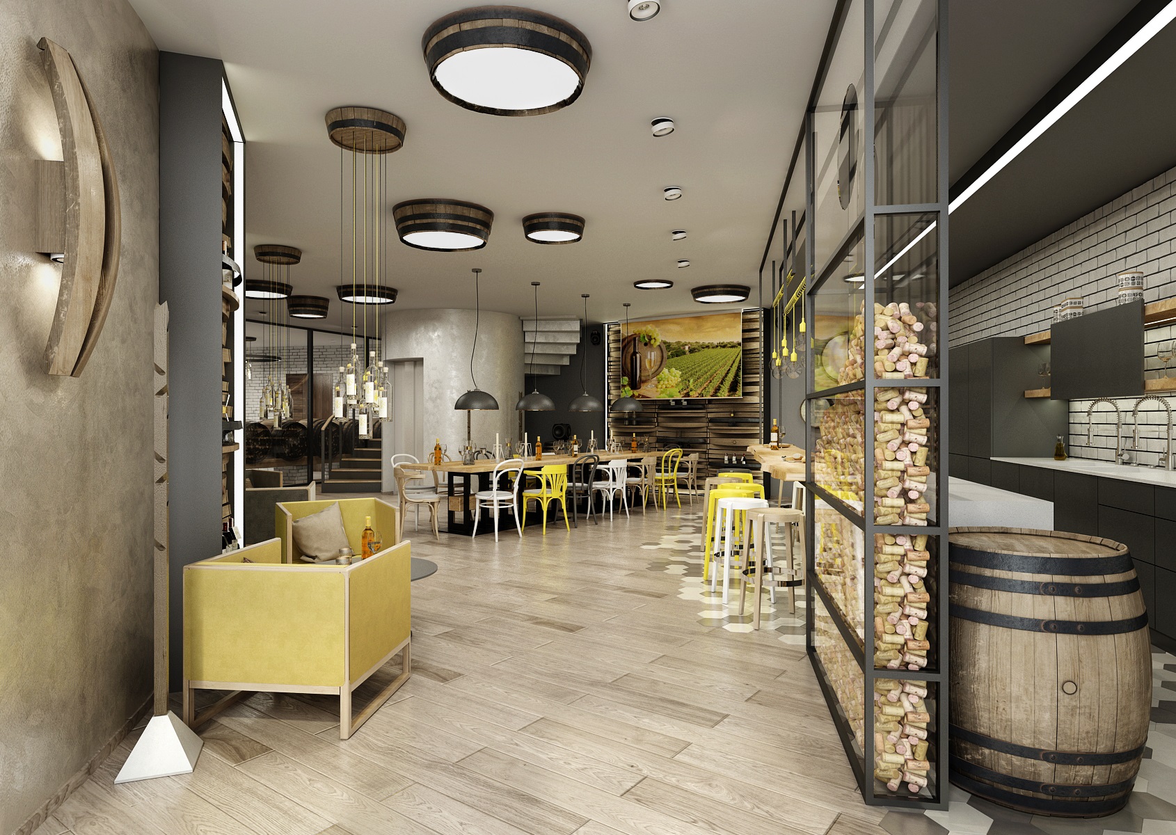 Design of a retro-industrial wine shop with a yellow accent on chairs (color mix of classics TON 14 and 56) or lighting fixtures (Muuto E27). The dominant feature of the space is a large table supported with a central metal base with a solid oak top, a frame metal structure that forms a bar, a service counter and at the same time a partition of the space. From old barrels, we designed ceiling and wall lamps and wall paneling for wine presentation.