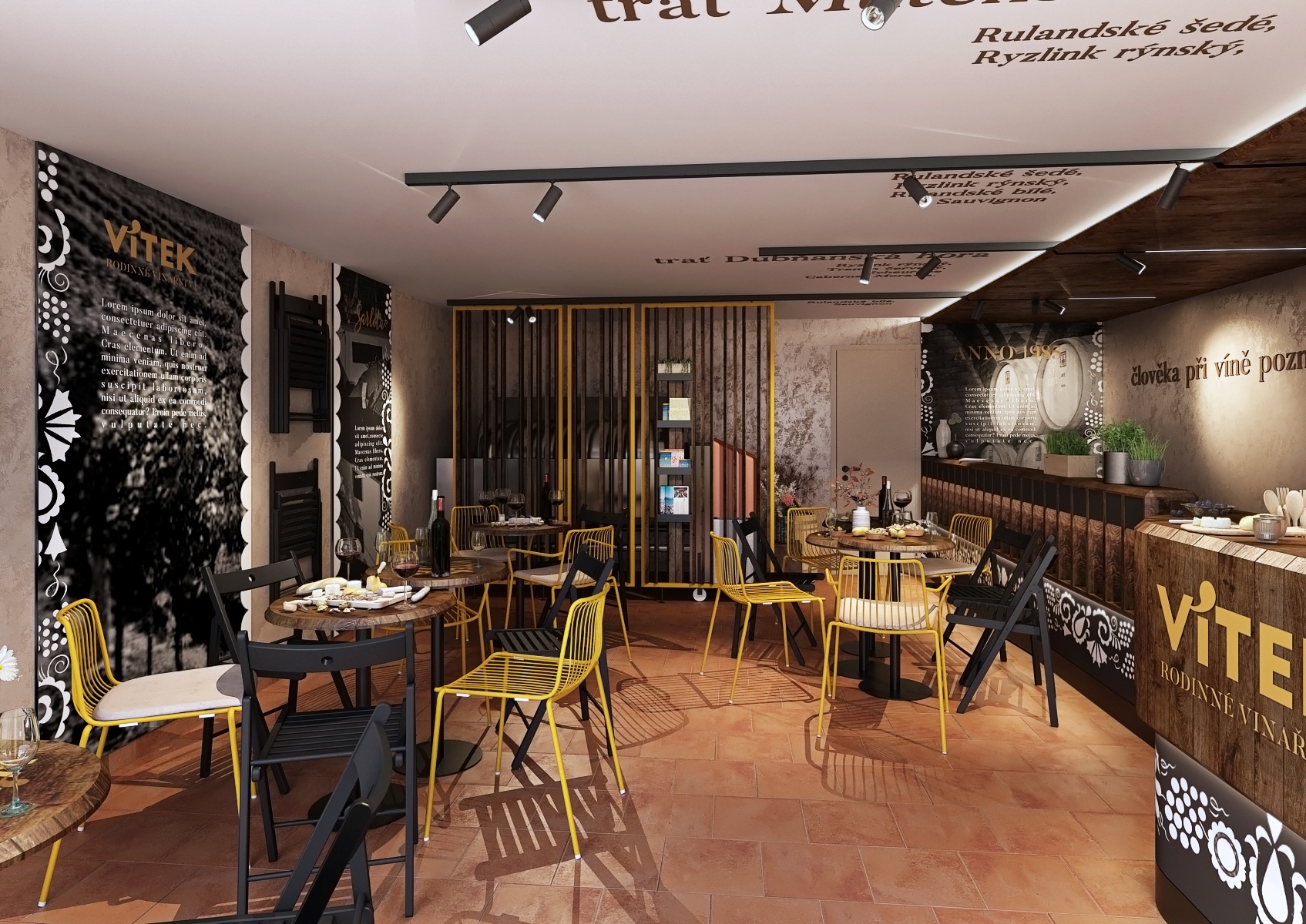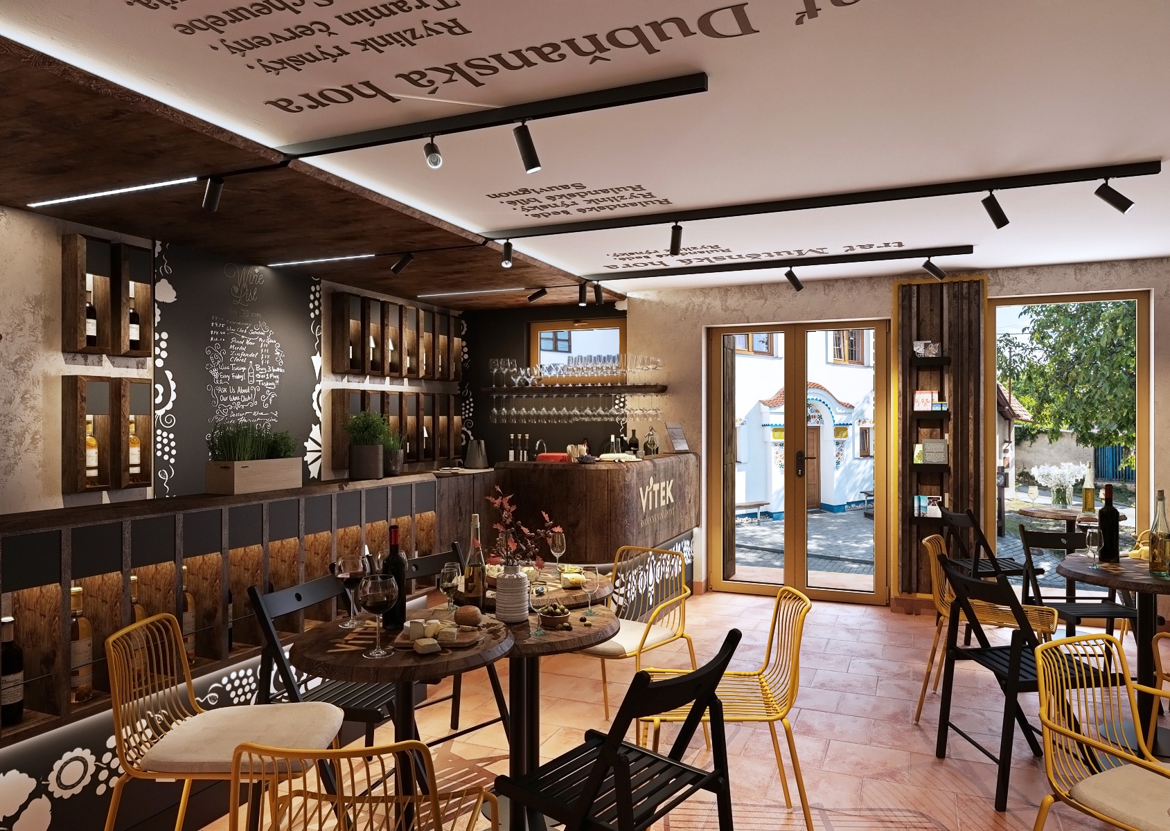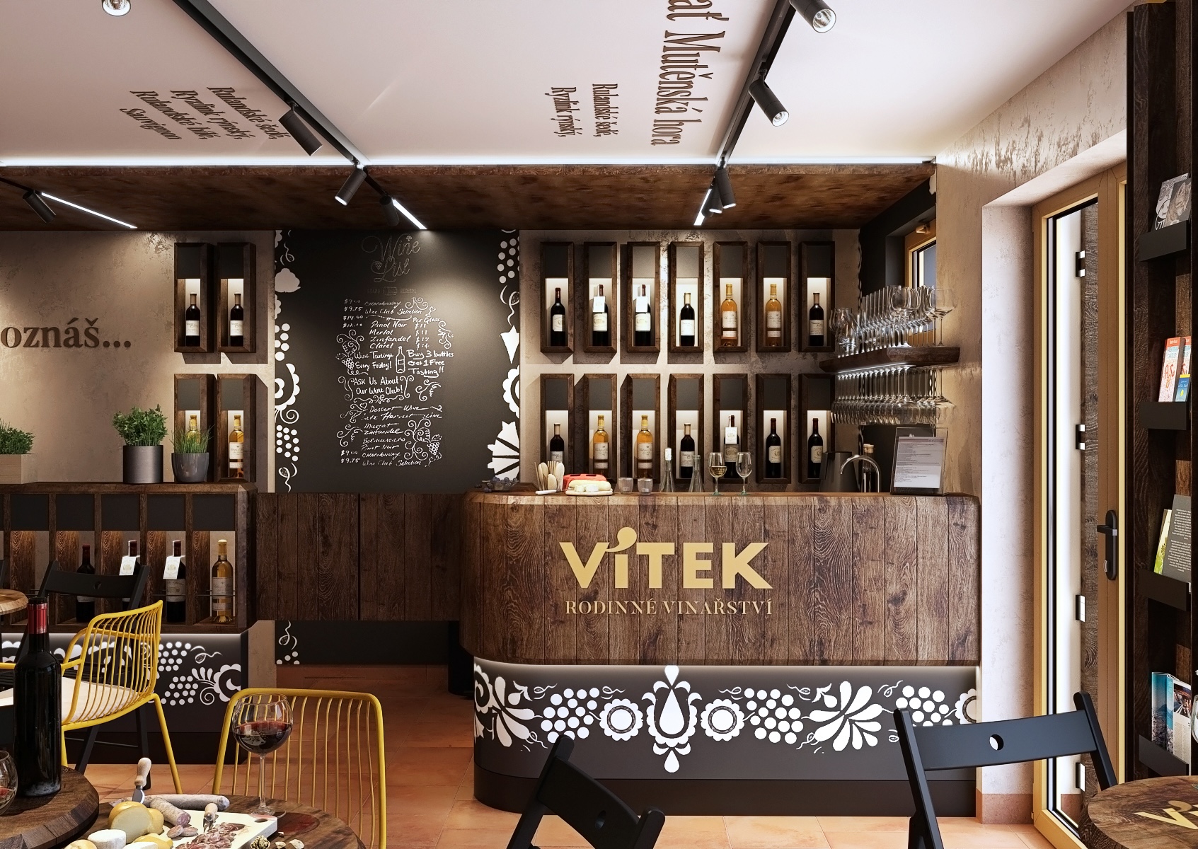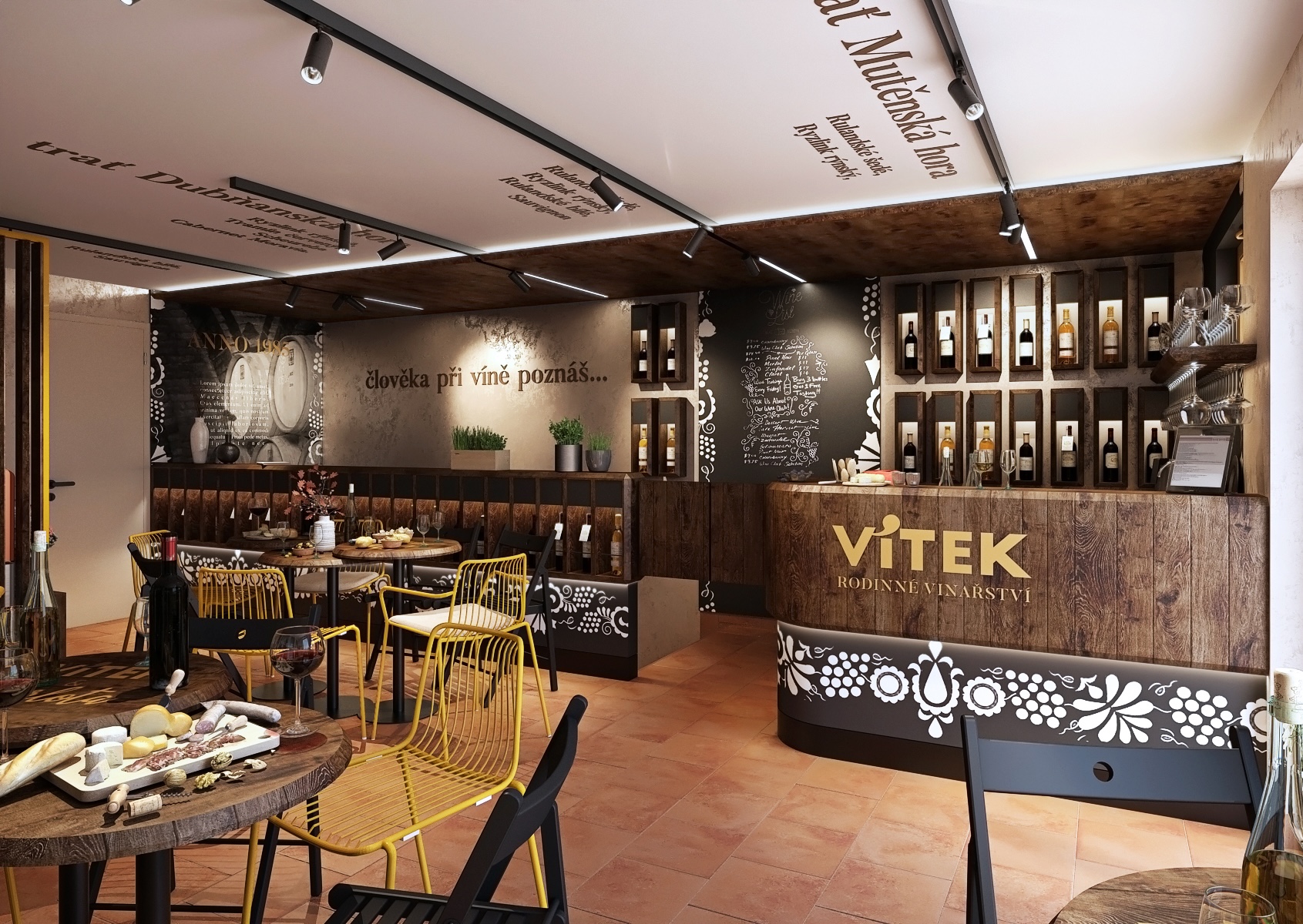 A wooden bar, decorated with an engraved inscription "Vítek - Family Winery," is the focal point of the room, and shelves of wine bottles are cleverly arranged to attract the attention of every visitor. The entire space is decorated with delicate folklore motifs on the walls and ceiling, which refer to the traditional Moravian countryside and bring cultural depth to the interior. On the tables we find a selection of quality wines, fresh pastries and cheese delicacies, which further underlines the atmosphere of comfort and hospitality, where guests can feel at home.