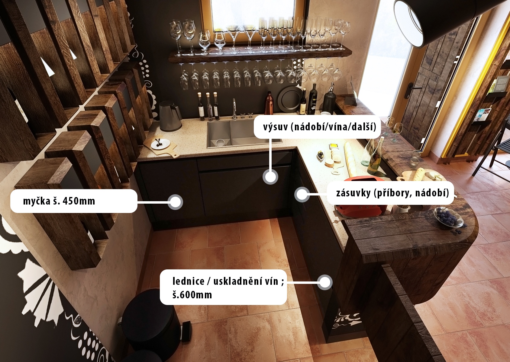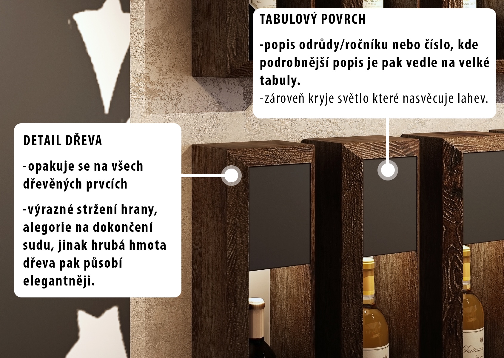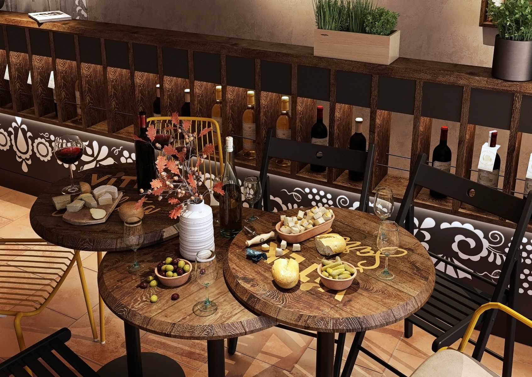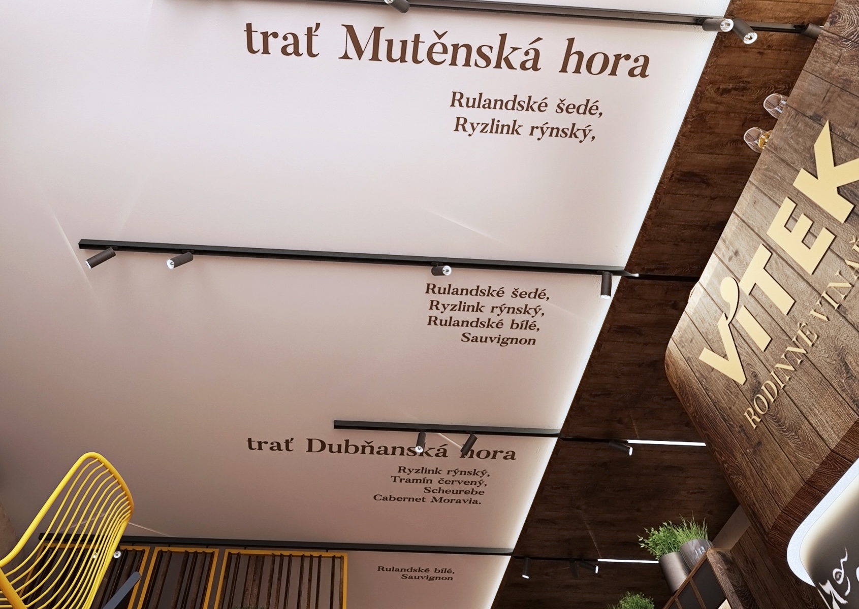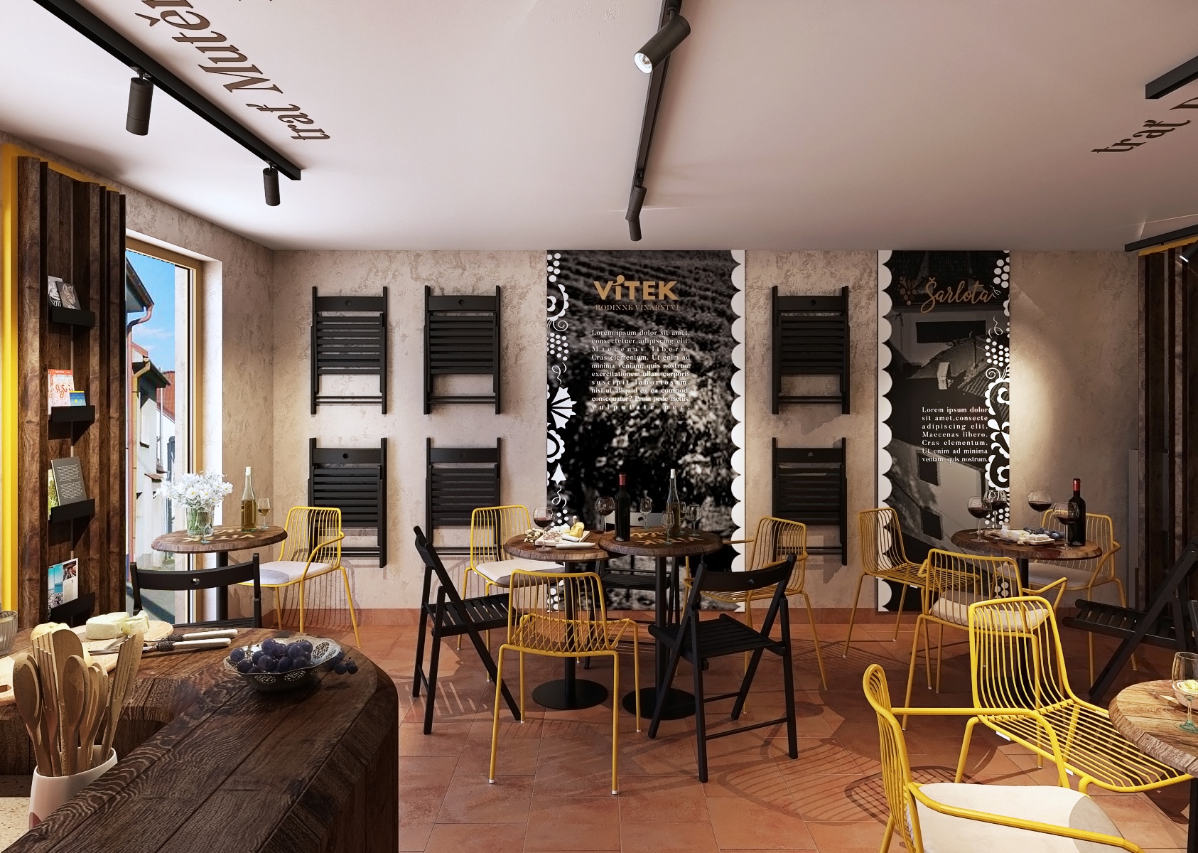 A wooden bar, decorated with an engraved inscription "Vítek - Family Winery," is the focal point of the room, and shelves of wine bottles are cleverly arranged to attract the attention of every visitor. The entire space is decorated with delicate folklore motifs on the walls and ceiling, which refer to the traditional Moravian countryside and bring cultural depth to the interior. On the tables we find a selection of quality wines, fresh pastries and cheese delicacies, which further underlines the atmosphere of comfort and hospitality, where guests can feel at home.