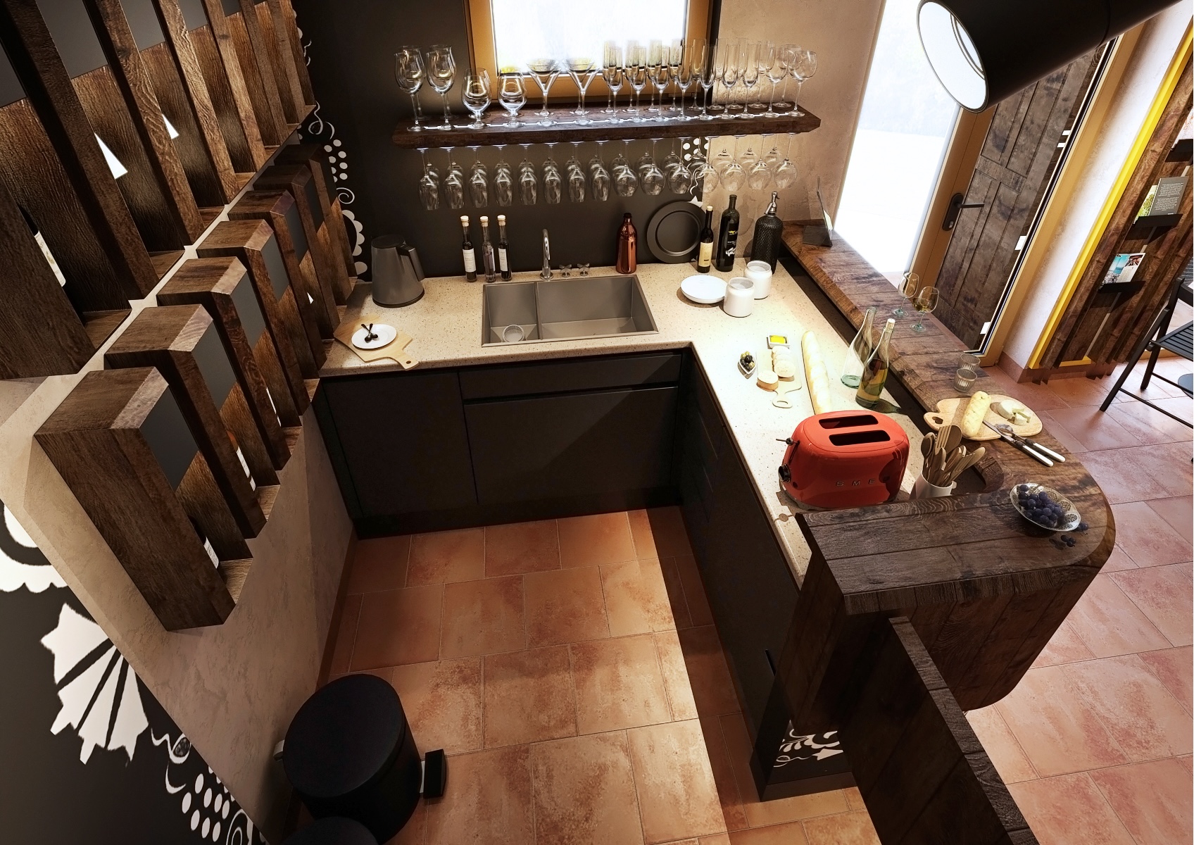Comfortable seating is designed with attention to detail, combining black and yellow chairs that create an interesting contrast and enliven the entire space. The earthy color palette of the floors and walls creates harmony with the modern, yet traditional furniture. Large windows let in natural light that brightens the room while providing views of the peaceful outdoors. The view from the windows reveals traditional country buildings and the surrounding landscape, which perfectly harmonizes with the interior and enhances the impression of connection with nature and the local wine culture.