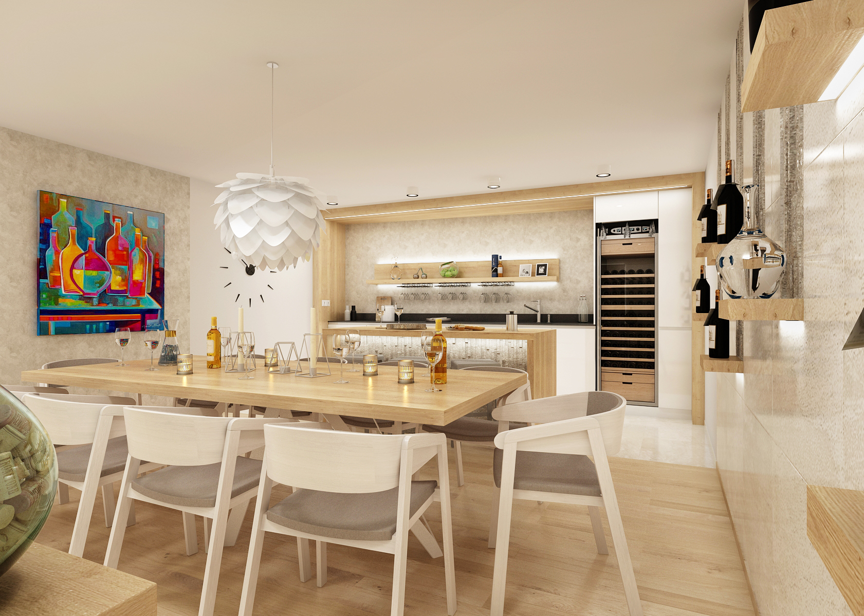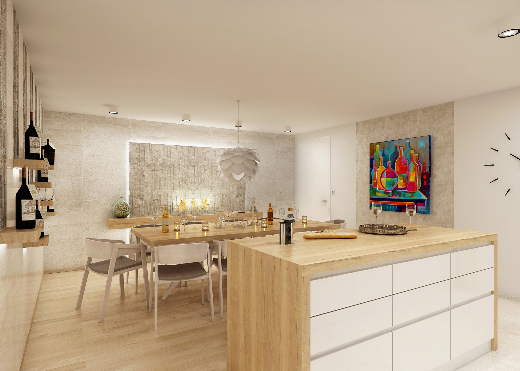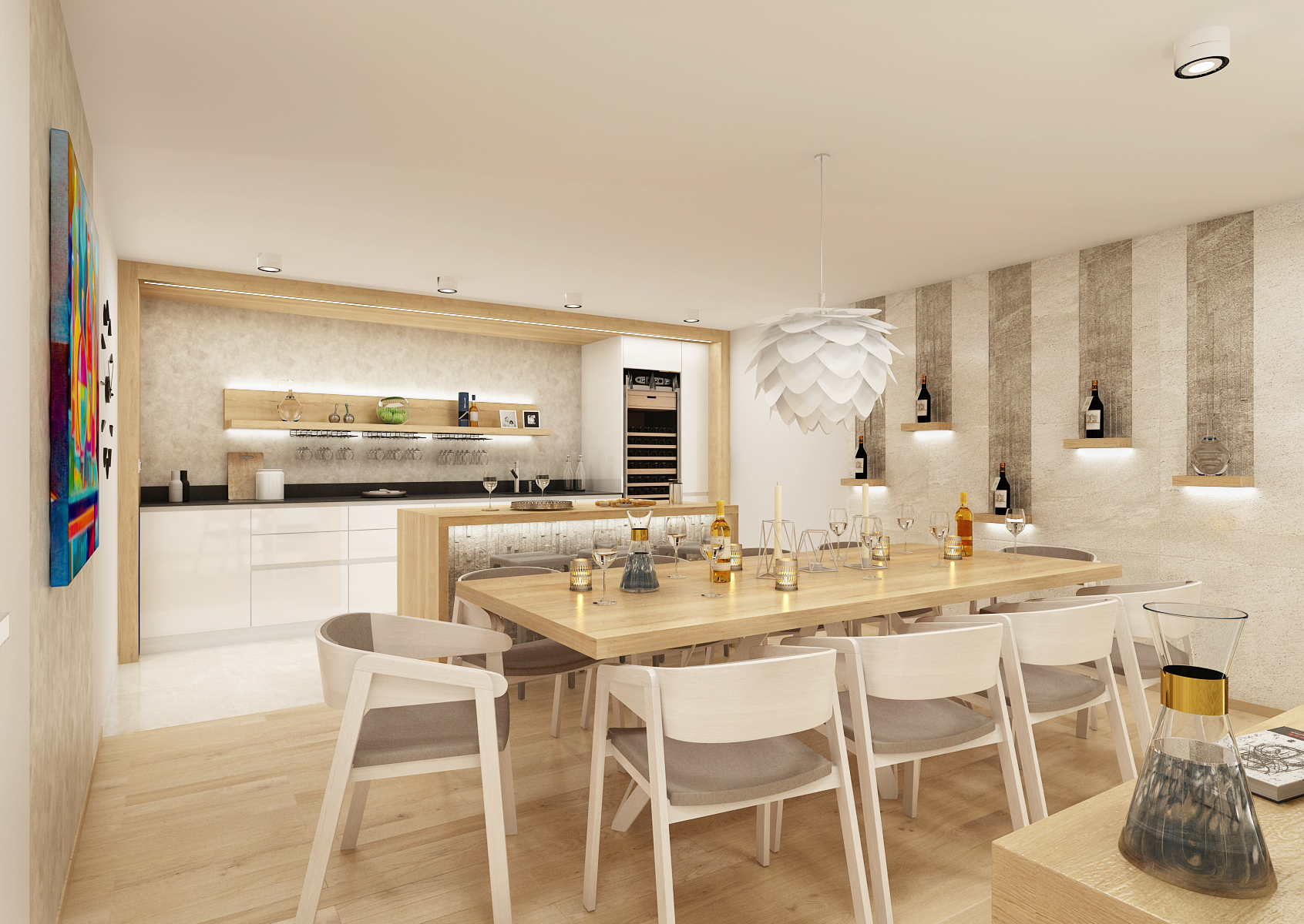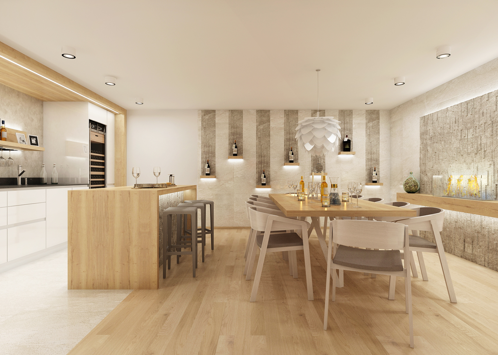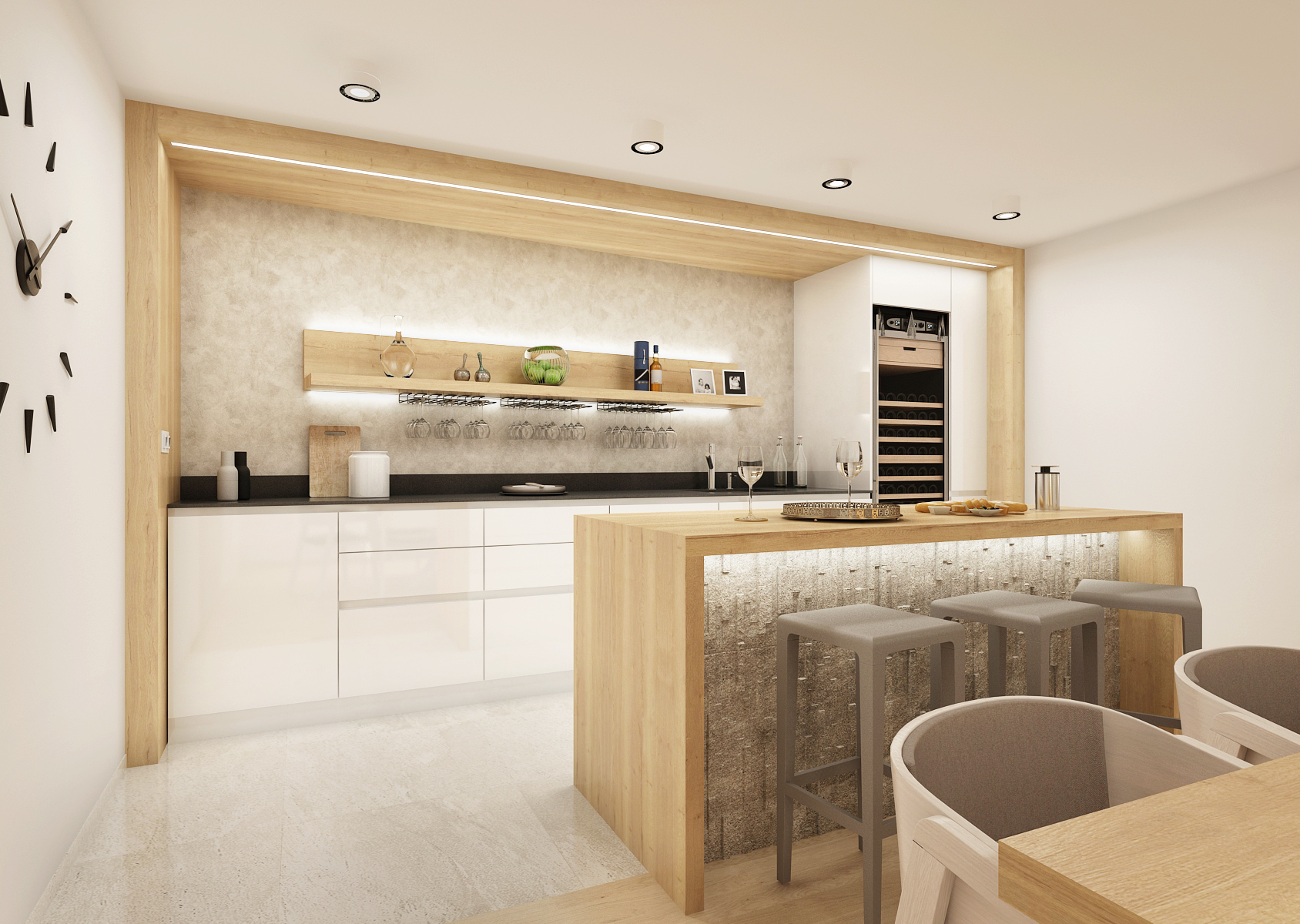The part with the kitchen is visually separated from the rest both by using large-format tiles and oak panels with backlighting around the kitchen unit. Another ambient is located behind a shelf with hooks for hanging wine glasses. A kitchen island with stone cladding, which is also emphasized with LED backlighting.