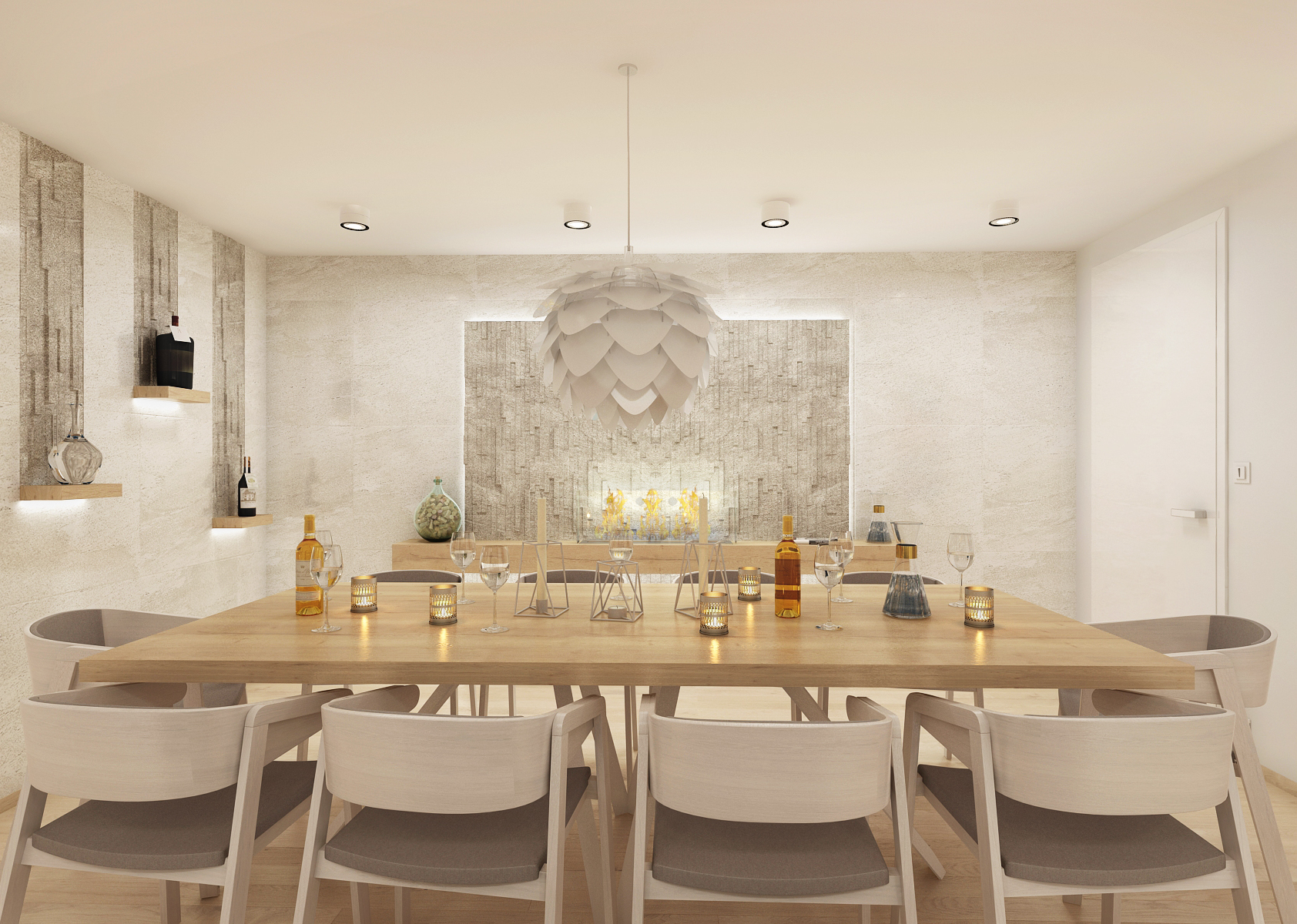 Behind the spacious table, which offers plenty of seating for wine, is a shelf set on a stone panel with backlighting. On the side wall, there are smaller backlit shelves for wine display.