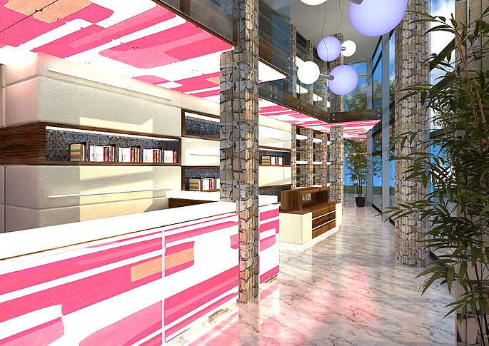 The sales counter of the bookstore in Ostrava is designed in two variants. The dominant feature are non-traditional gabion columns combined with simple shapes of the sales counter and integrated bookshelves in the completion of wenge. Backlit glass with playful graphics is used for greater space dynamics. The first variant is a combination of light materials with colorful graphics. The second version plays with light graphics, which contrast with the choice of dark material that was used to line the section for exhibiting books.