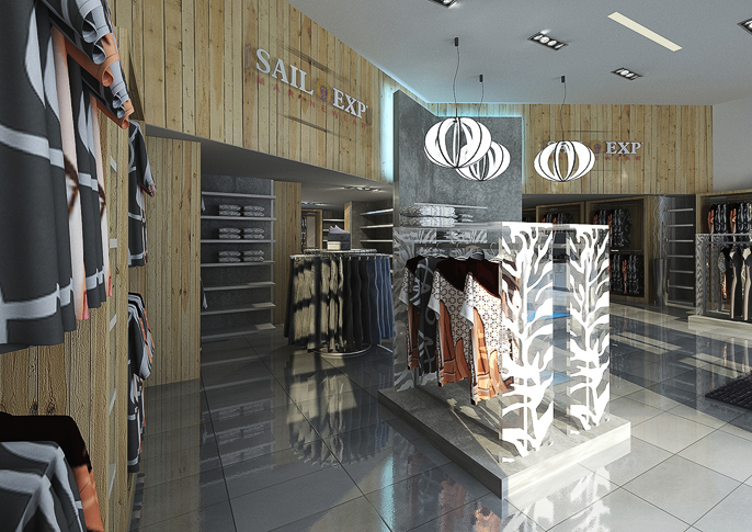 SAIL EXP specializes in yachting clothing, which is adapted to the design of its store. The wooden wall cladding resembles the deck of a ship, gray hangers and the floor sea level or cloudy sky, the blue backlight in the floor is like illuminated waves. The space looks modern thanks to the combination of natural material and gray tiles. An interesting element is the backlight behind the counter.