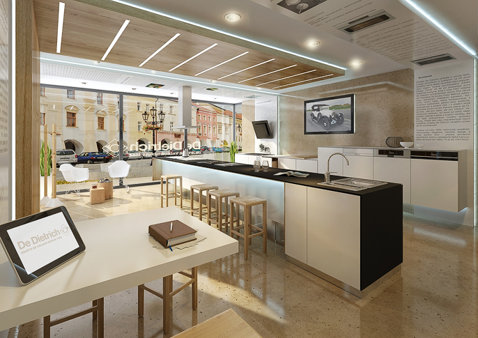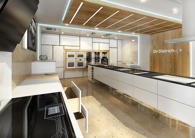 De Dietrich showroom designed interior design interior store kitchen appliances oak cast floor. The interior is colored to the corporate shades of the brand. The displayed appliances clearly stand out, but at the same time they are integrated into the interior in a natural way. The modern impression is created by white elements in combination with natural material. An interesting element is the ceiling backlight.