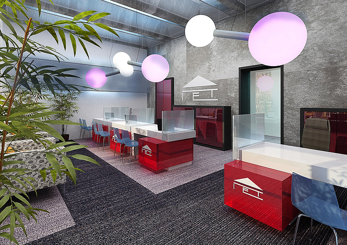 Modern interior with walls with a concrete trowel. In contrast to the dark brindle carpet, white counters with red lacquer boxes stand out. Black corpora of storage spaces interestingly frame the furniture. A significant element in the interior are atypical ceiling lights anchored in the ceiling in the shape of connected spheres, which complement the space with soft purple light. Thanks to the choice of square elements, the space is simple and neat.