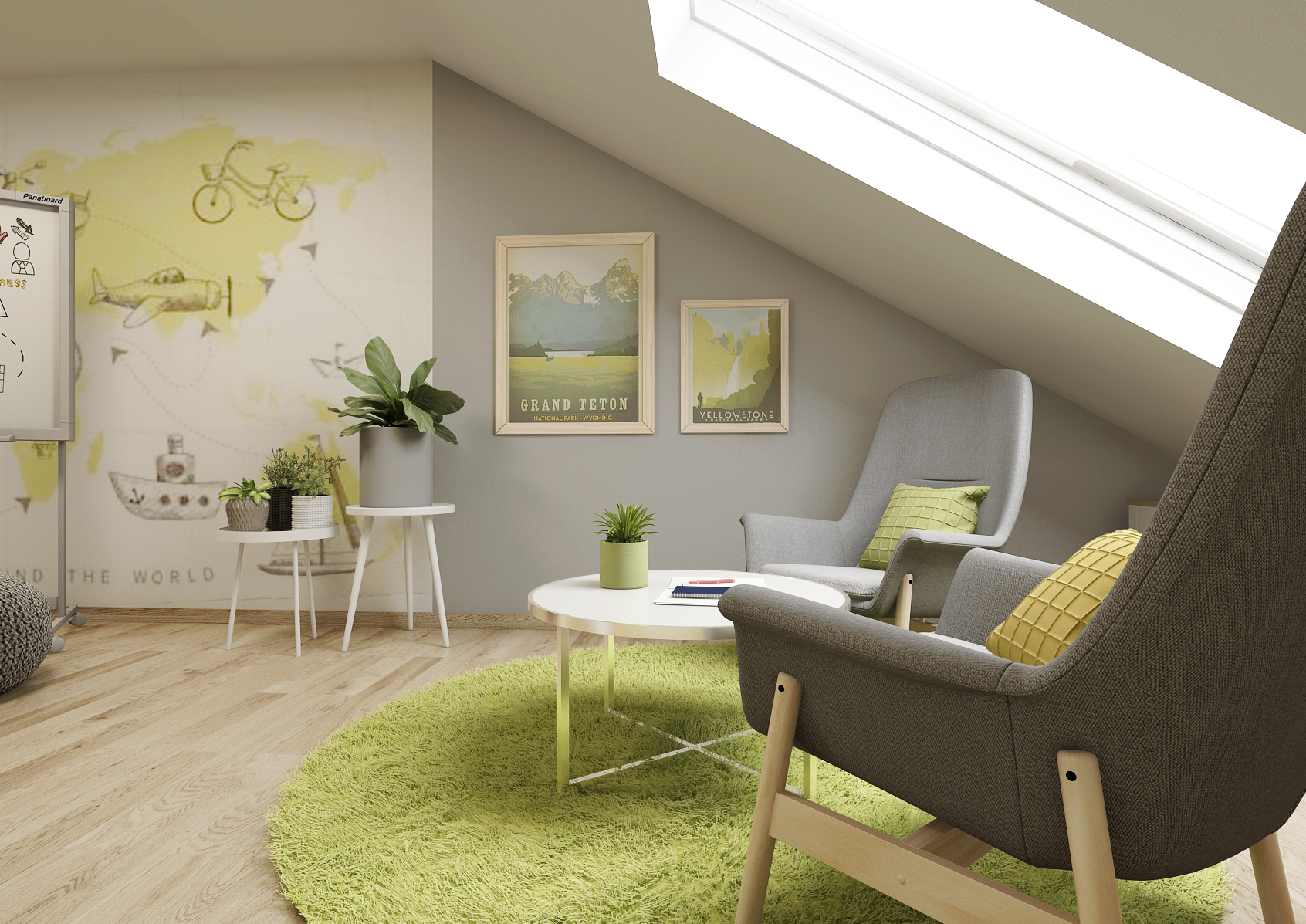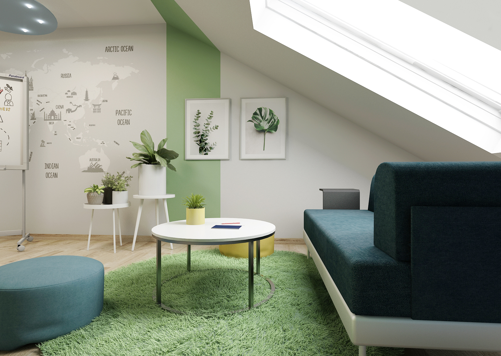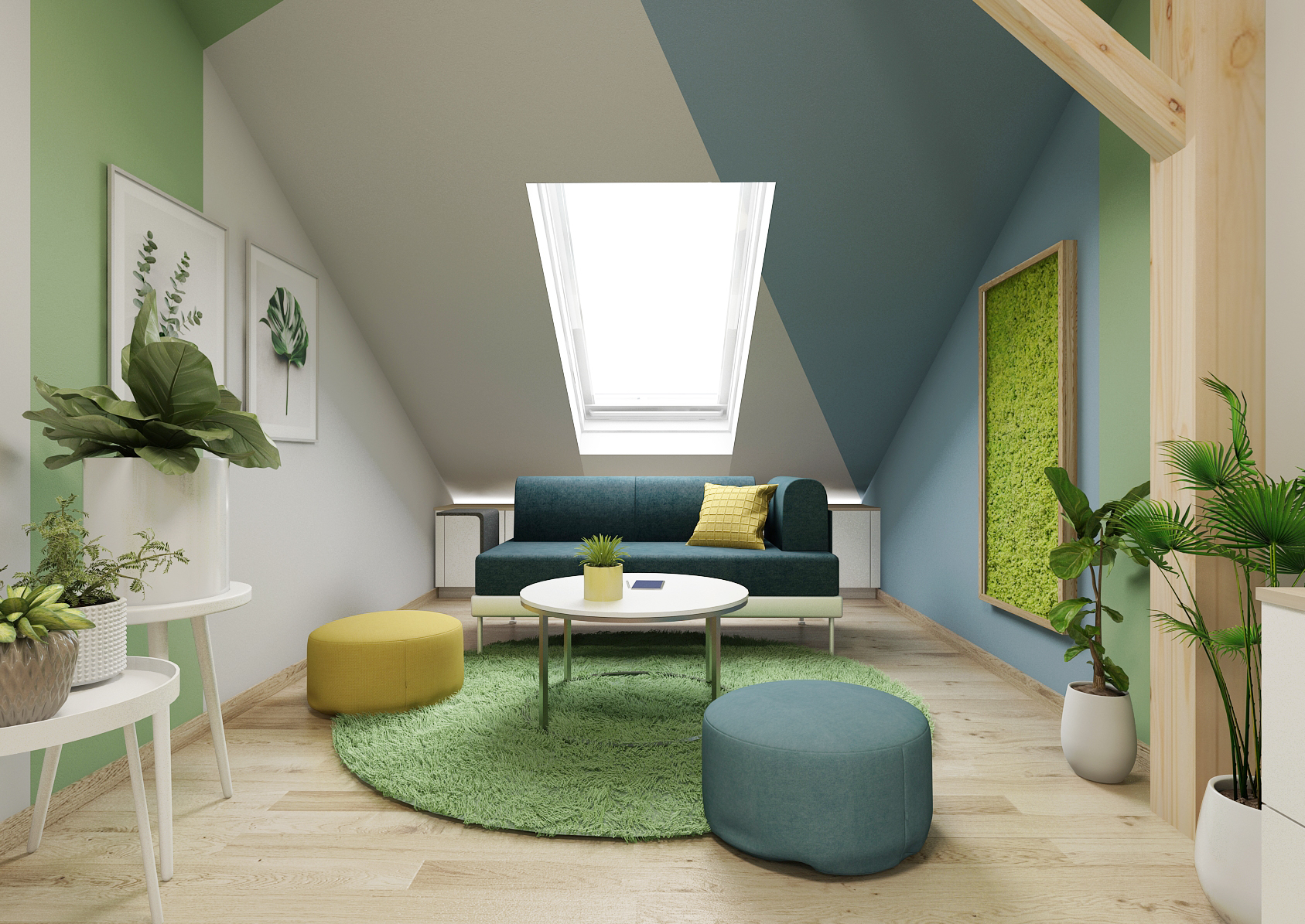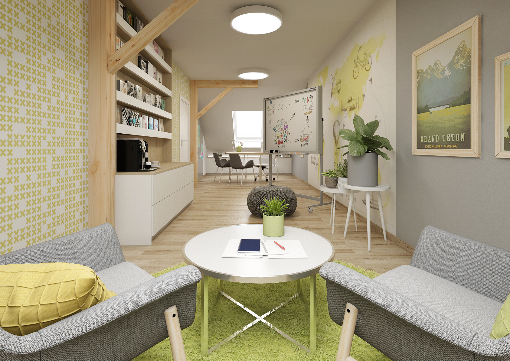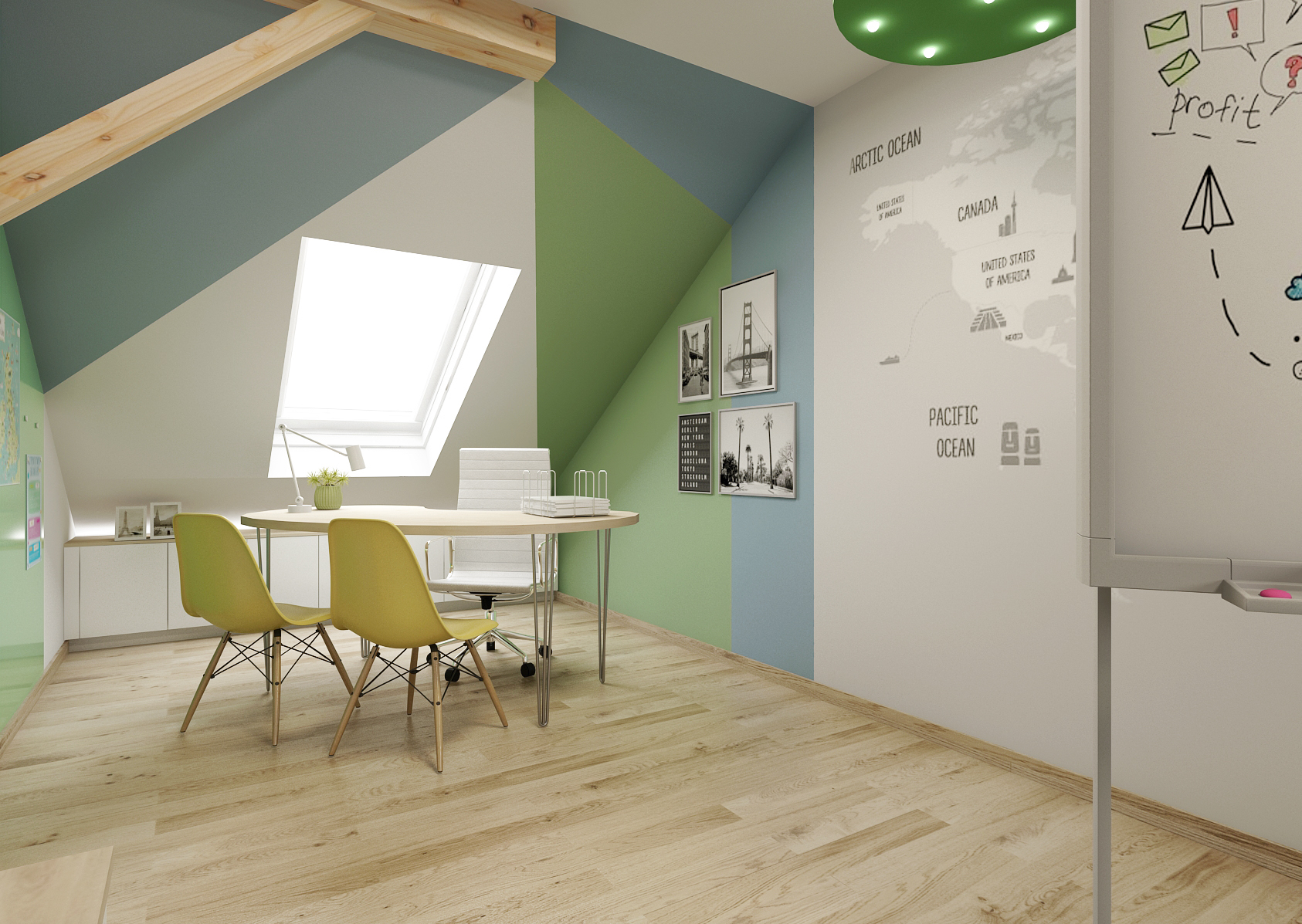 Both the walls and the furniture elements are tuned to green, yellow and gray tones, thus creating a combination of cheerful colors diversifying the studio environment. Armchairs and stools can add to the feeling of comfort. The cozy-looking spaces are complemented by buckling beams.