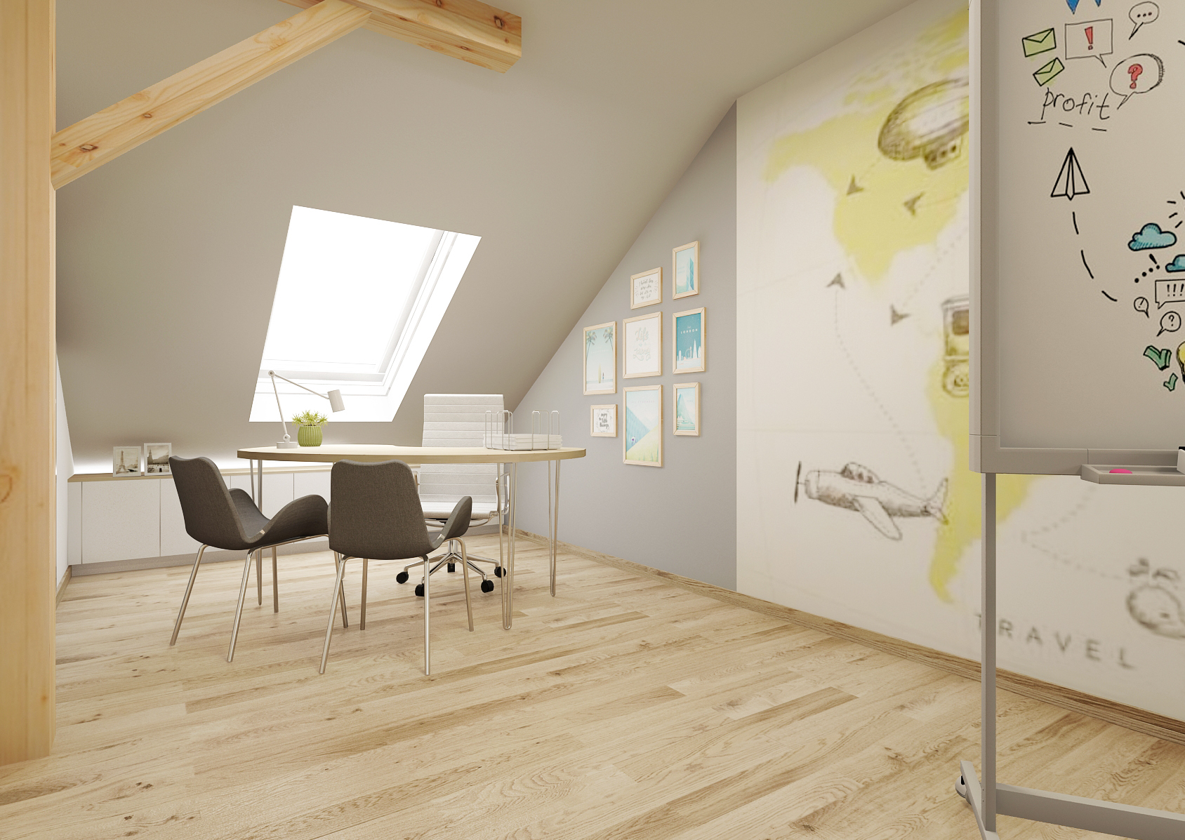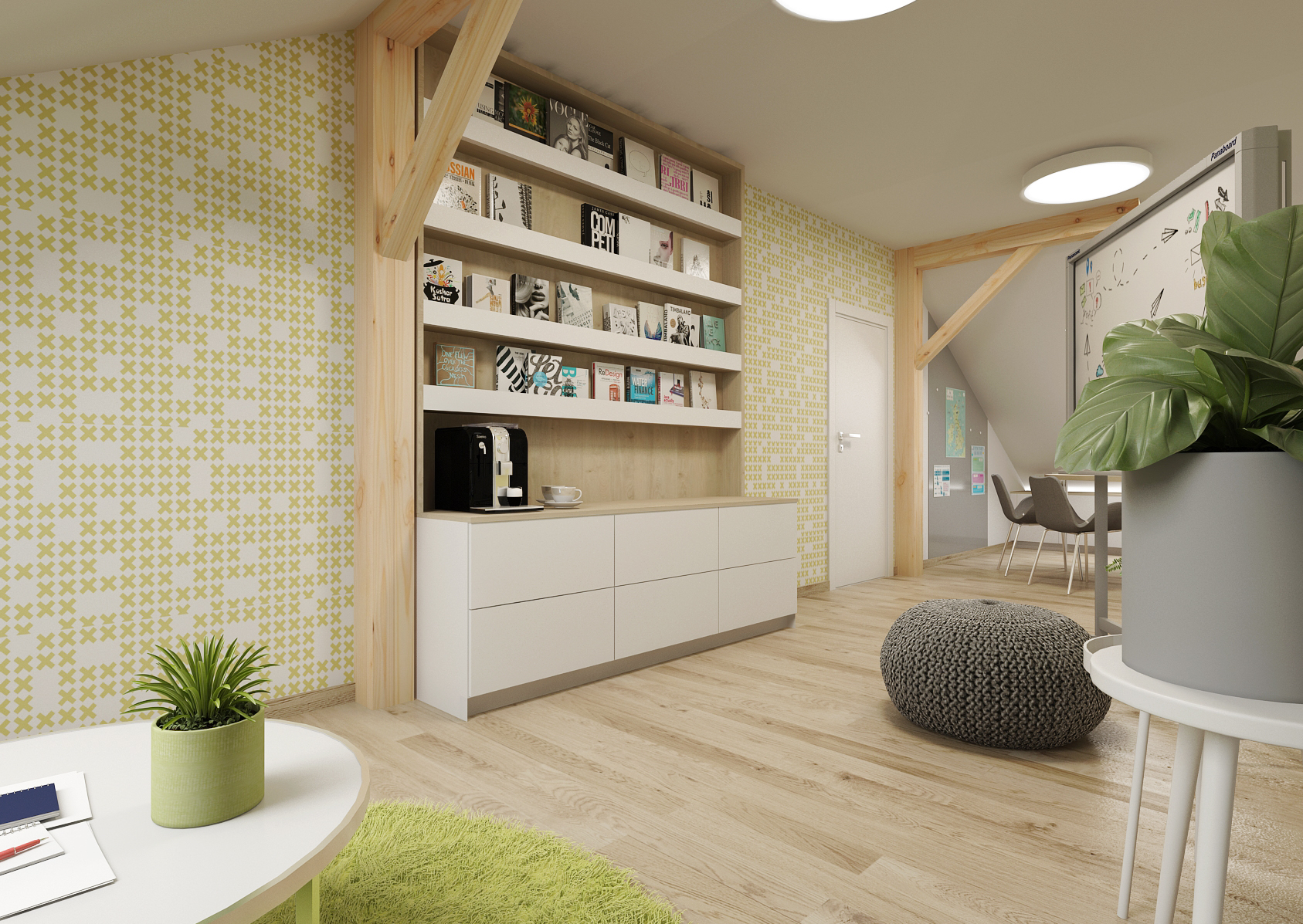 Walls with gray painting or patterned wallpaper also carry various pictures and inscriptions that emphasize the purpose of the interior. It is illuminated by both skylights and two round ceiling lights. There is also a so-called coffee station to make the day more pleasant.