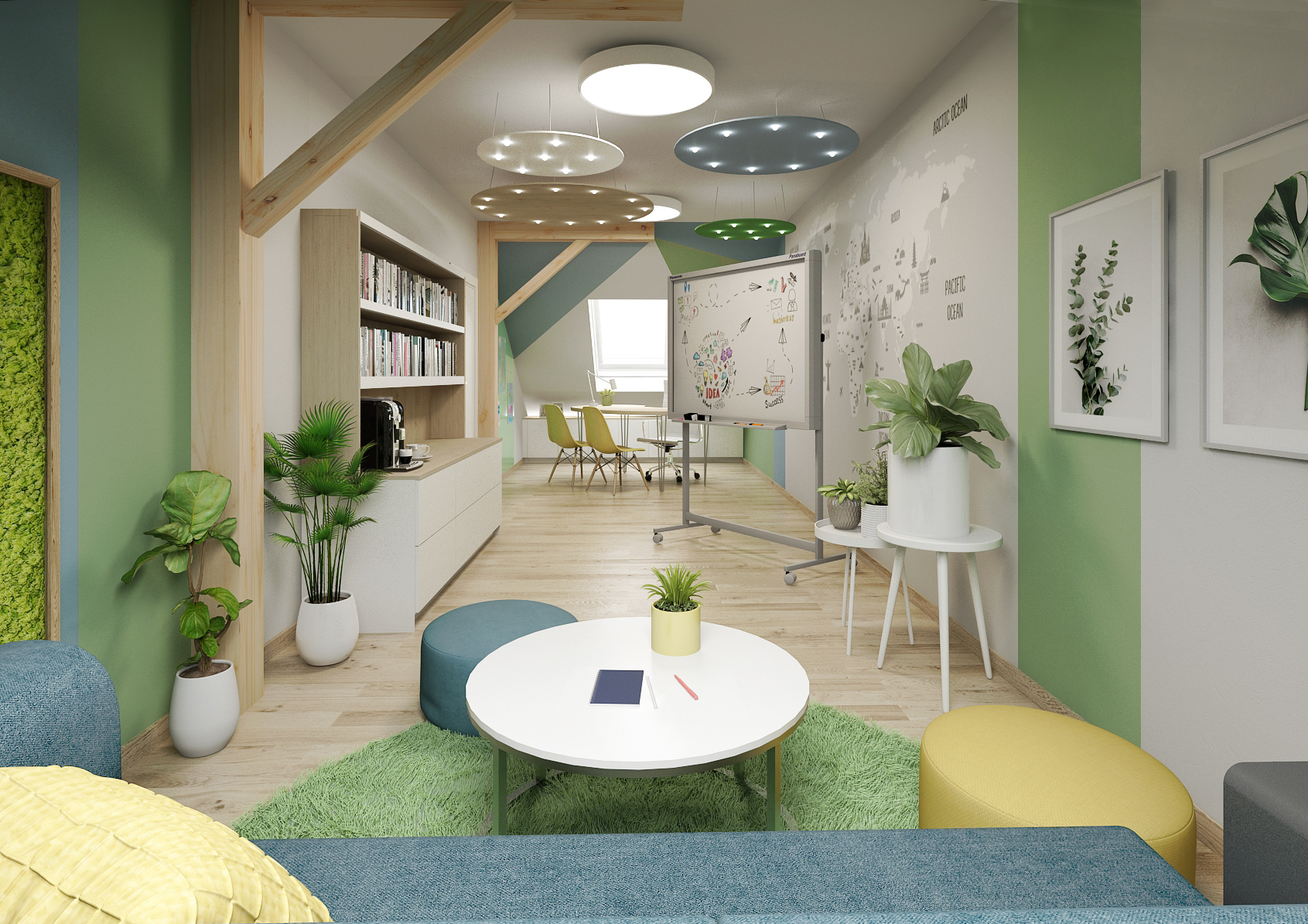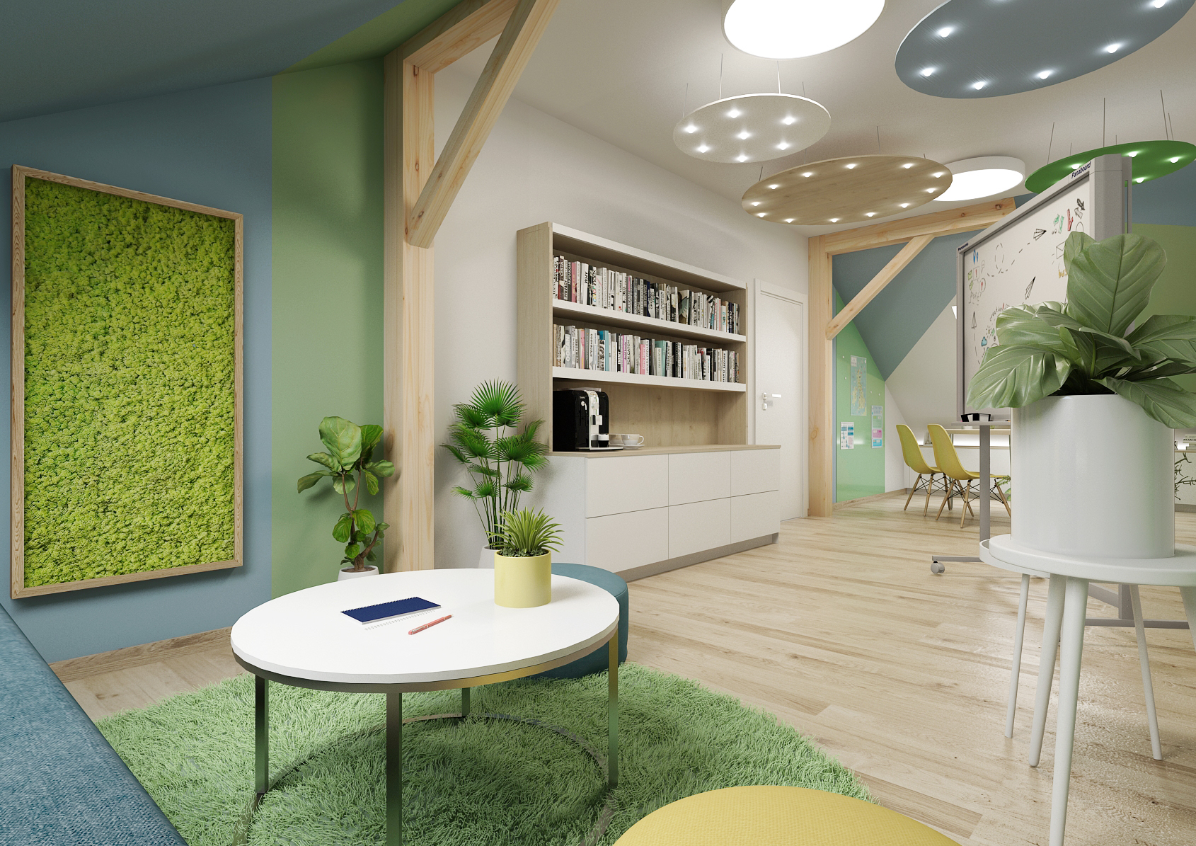 The second version of the design is aimed more at children, where the ceiling lights are complemented by colored circles with spot lighting. The space is more connected with nature also thanks to more pronounced colors and a mossy wall.
