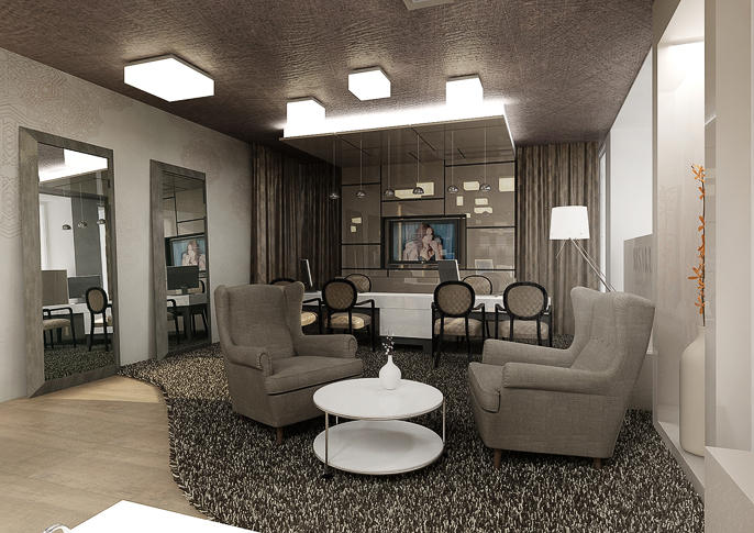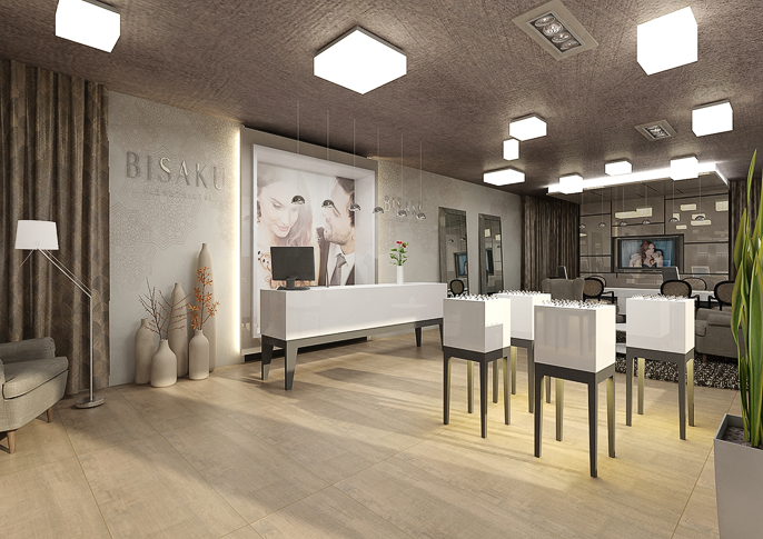 Jewelry store Bisaku in Ostrava. There's a large-format wallpaper on the wall from the company Tres Tintas - Alandalus.The interior is decorated in light earthy colors, thanks to which the space looks tender and elegant. The clean design is underlined by square showcases with wooden bases. An interesting element is the cubic ceiling lights irregularly distributed throughout the ceiling in the room. There is also an elegant seating area with upholstered armchairs.