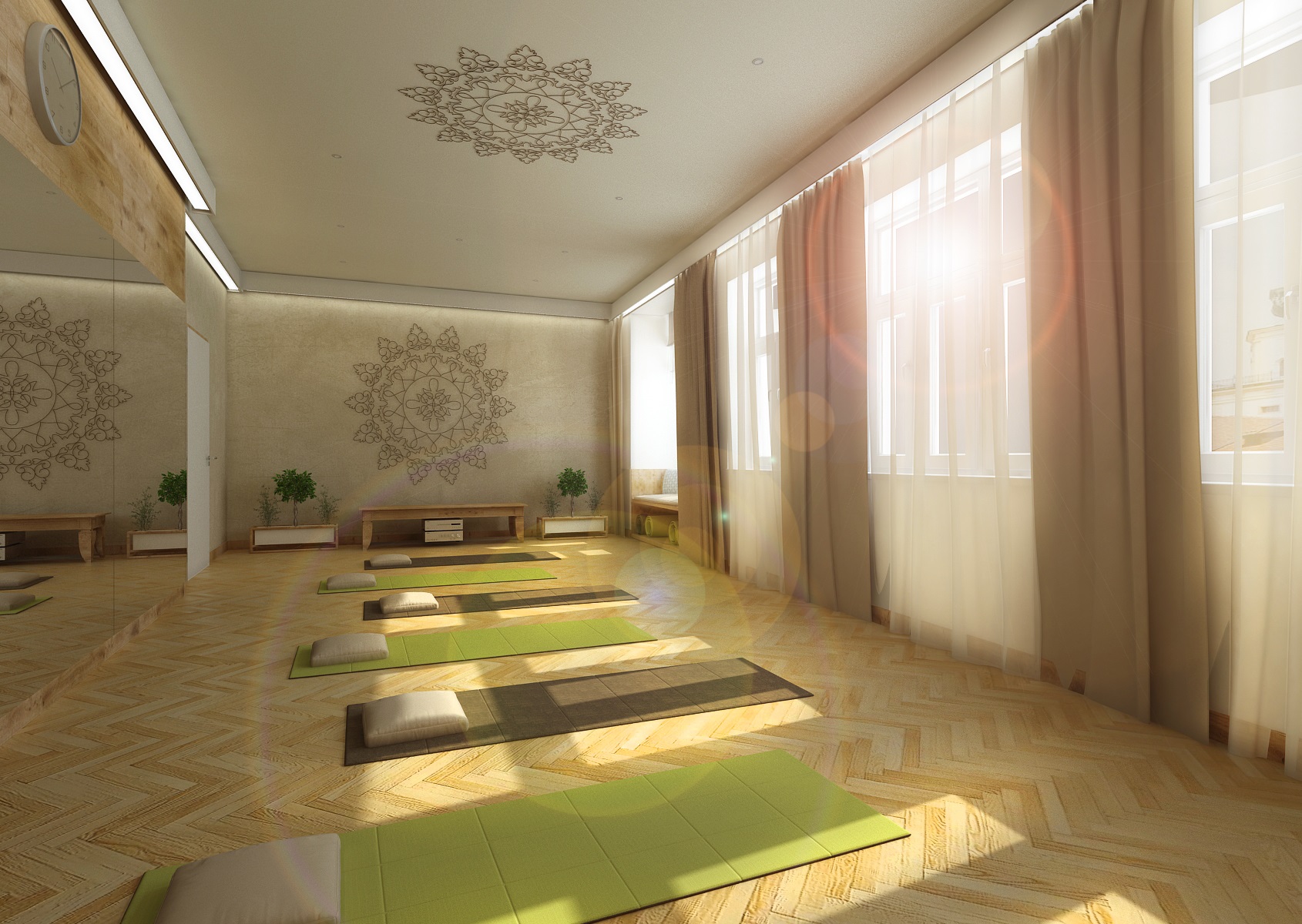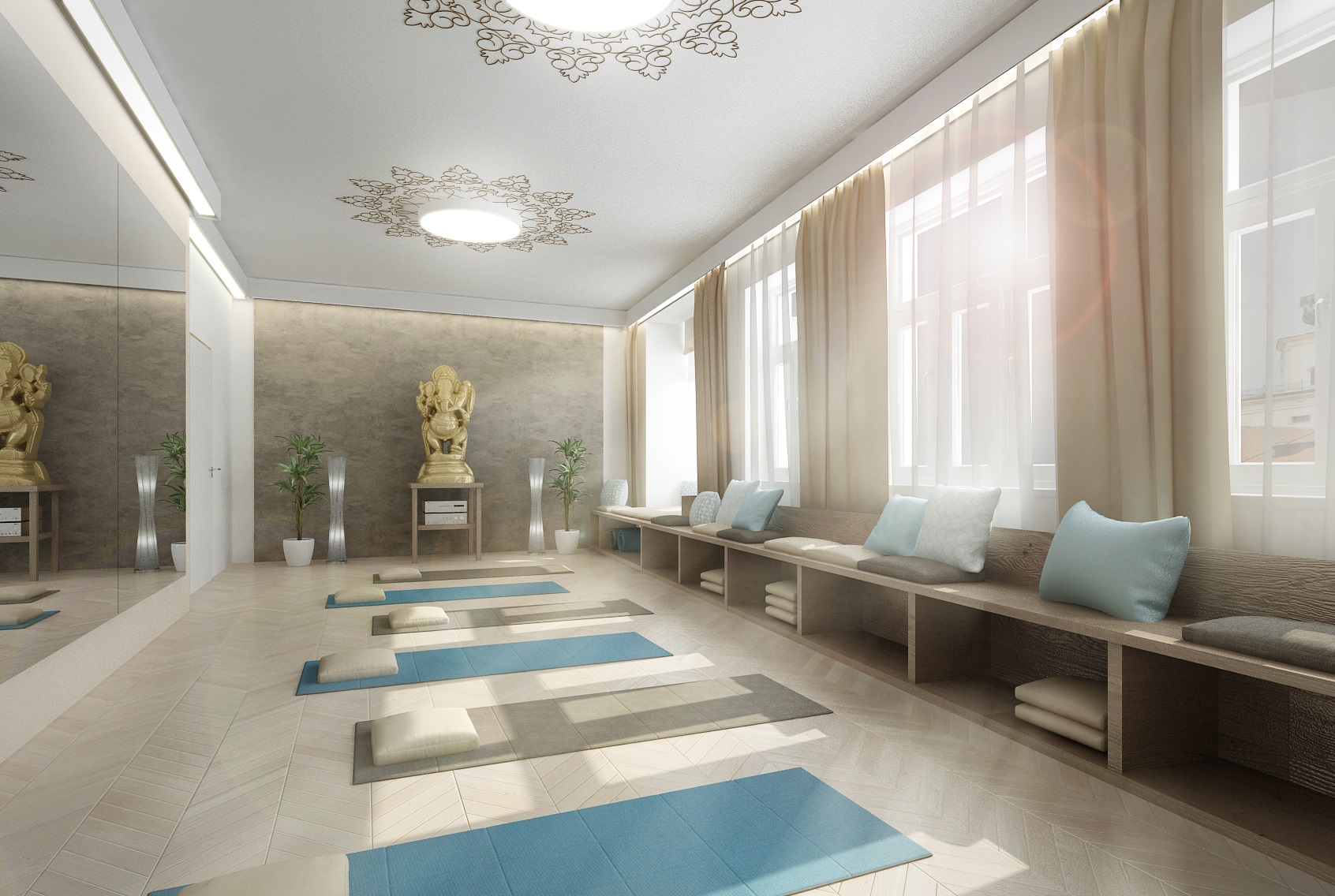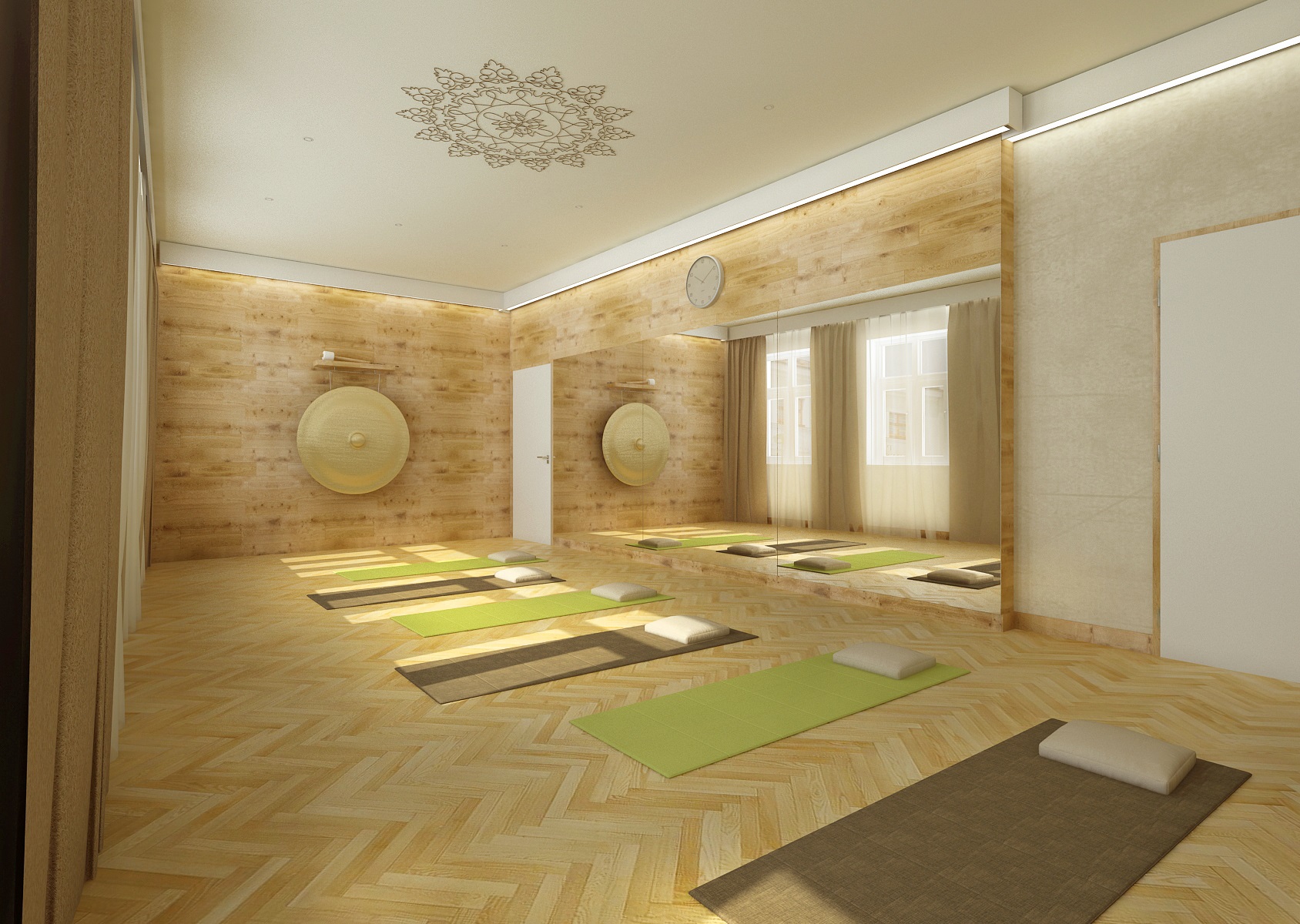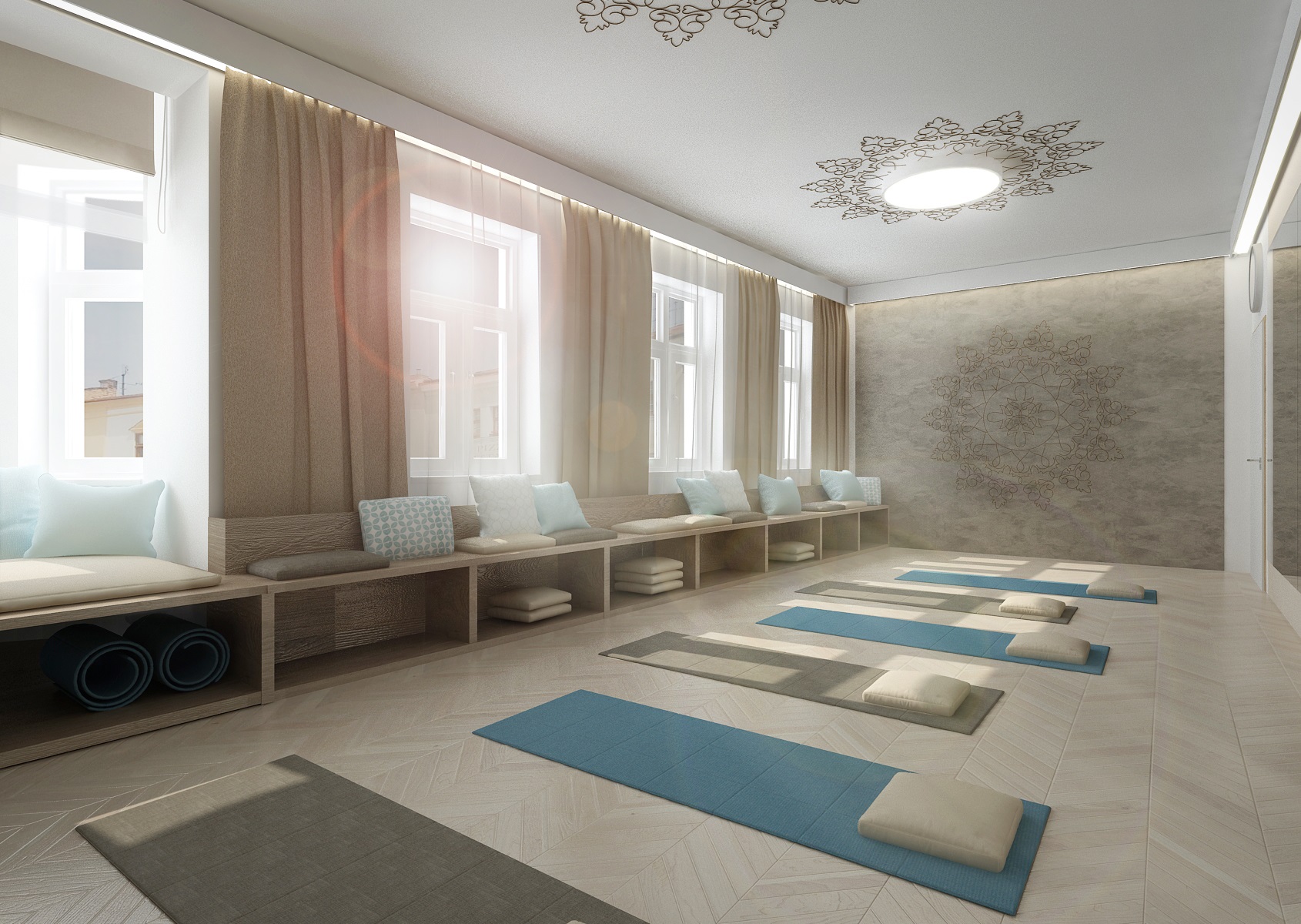 Design of yoga studio Samadhi in Kroměříž. Massage salons and exercise rooms are decorated with a typical mandala on a light brown spatula. Furniture and floors in natural oak (in a variant in mud oak). The benches under the windows cover the heating of the room and large mirrors are also a necessity, which lighten the space and at the same time serve to check the correct execution of exercises.