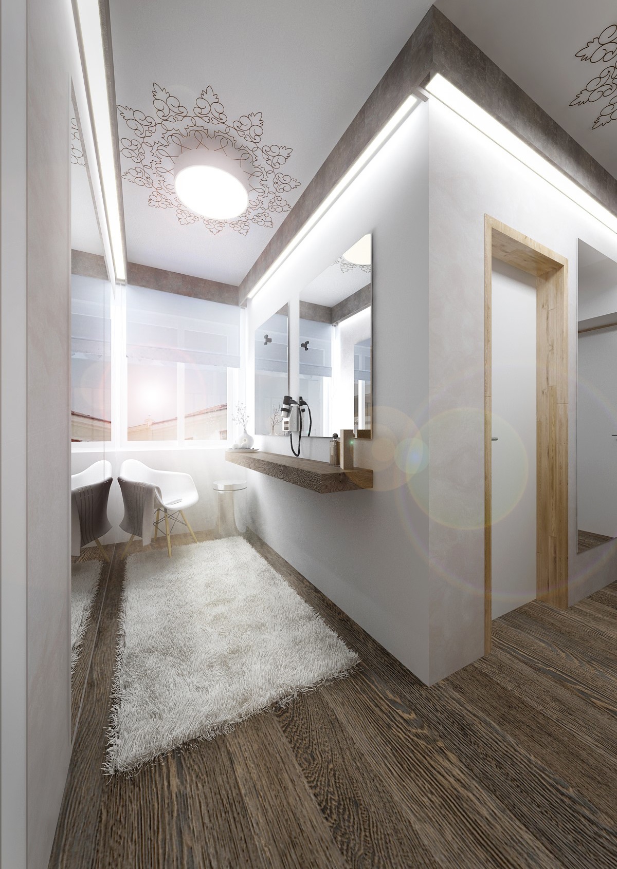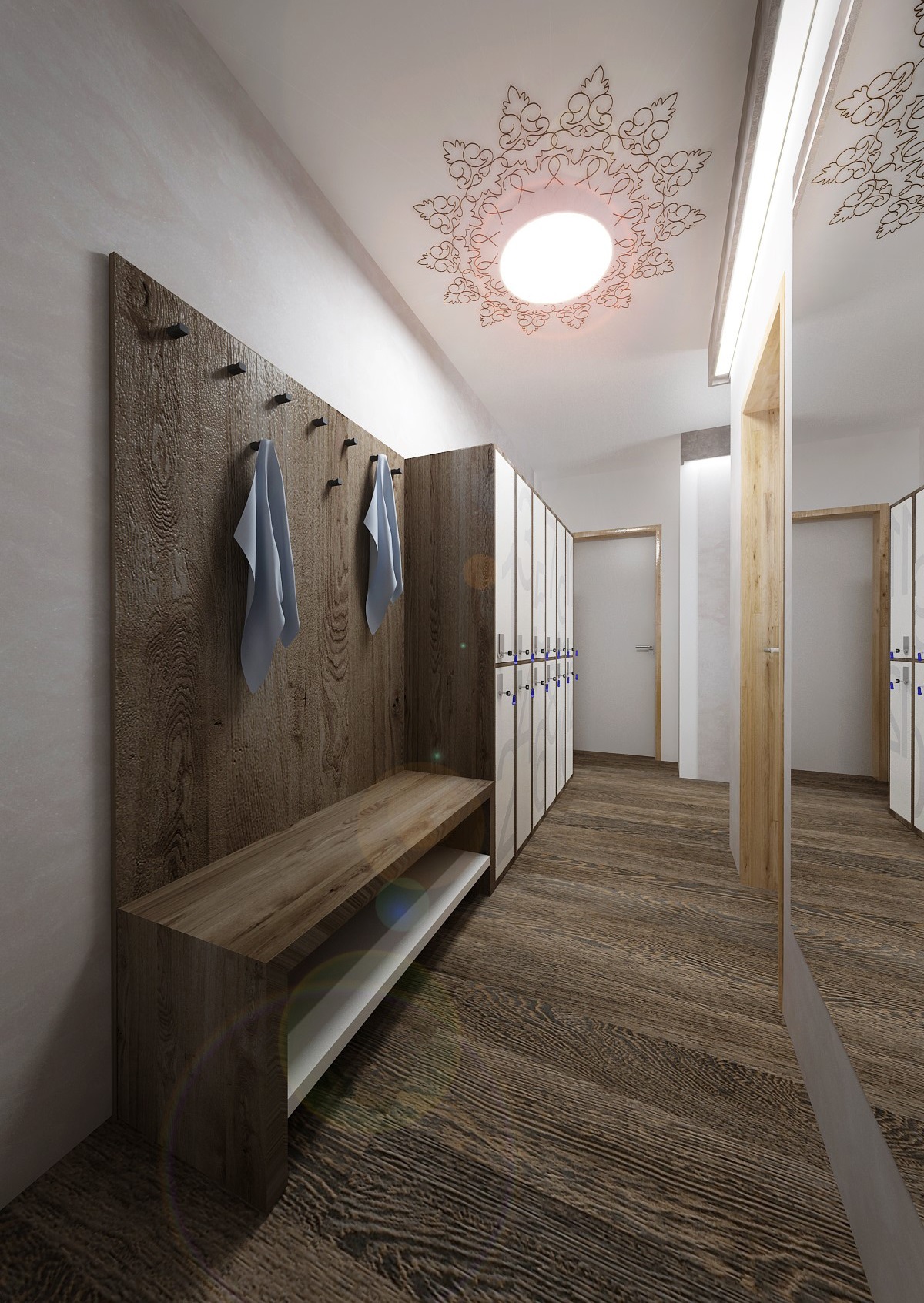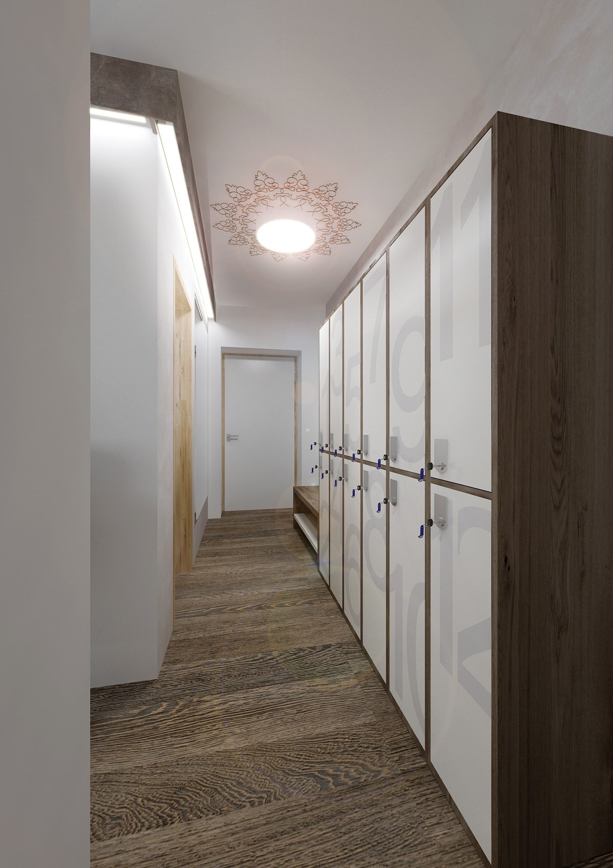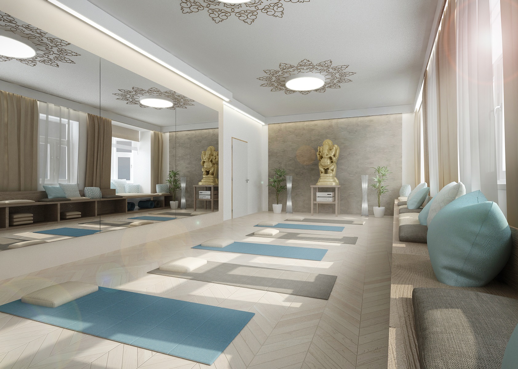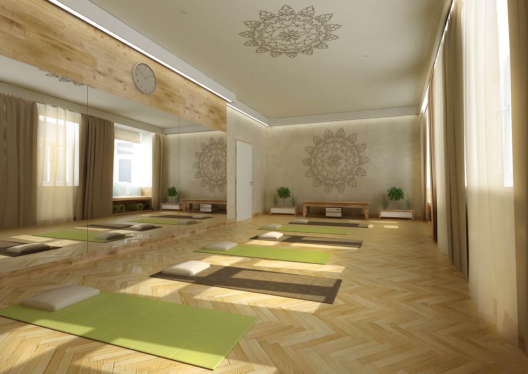 Design of yoga studio Samadhi in Kroměříž. Massage salons and exercise rooms are decorated with a typical mandala on a light brown spatula. Furniture and floors in natural oak (in a variant in mud oak). The benches under the windows cover the heating of the room and large mirrors are also a necessity, which lighten the space and at the same time serve to check the correct execution of exercises.