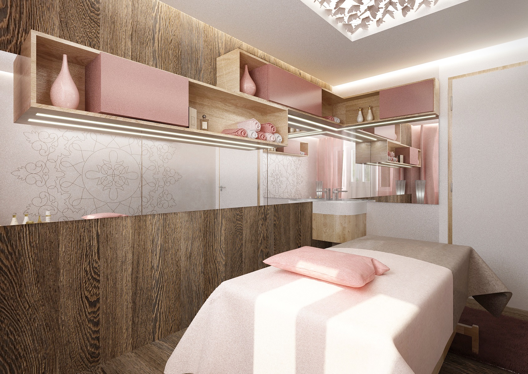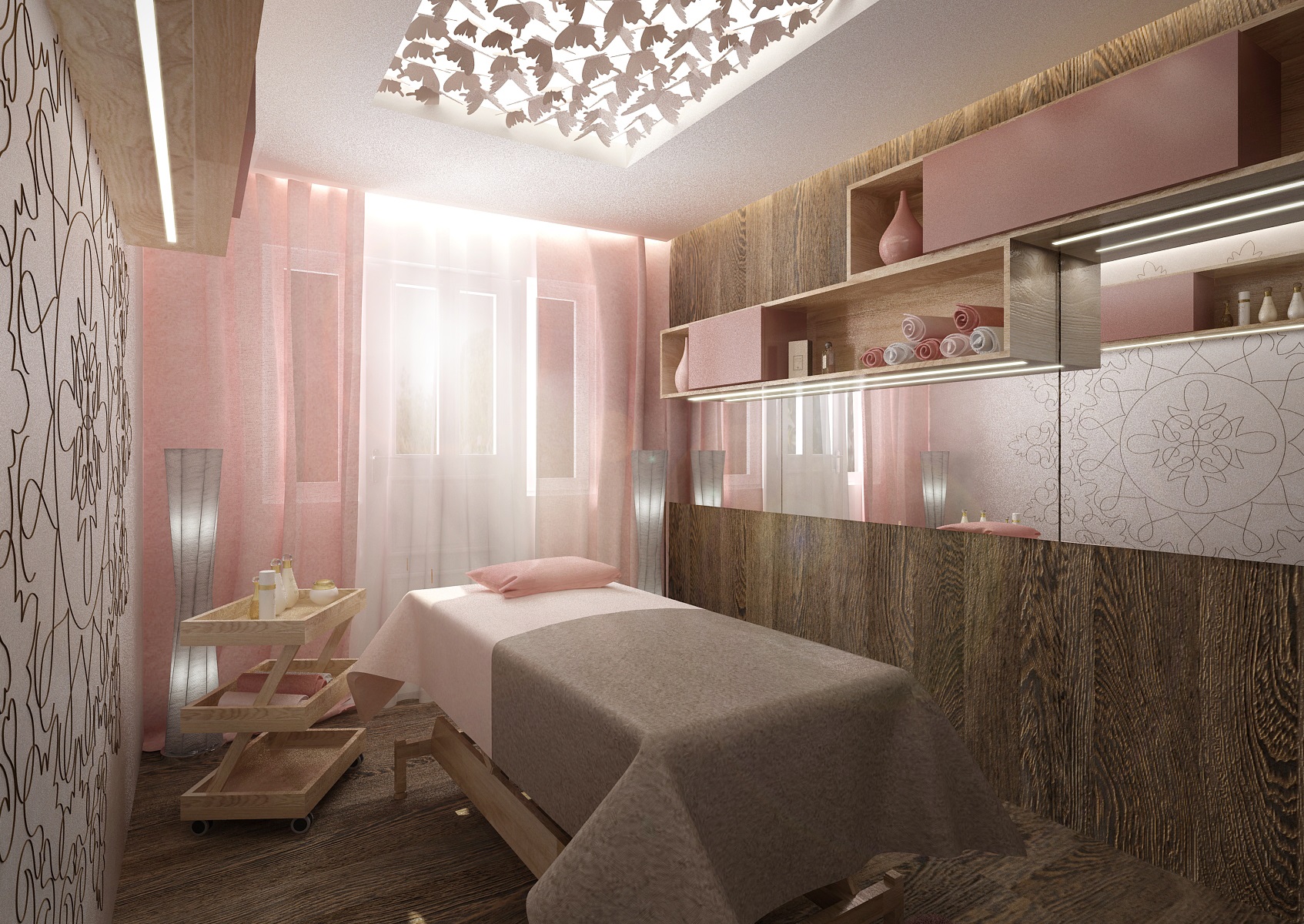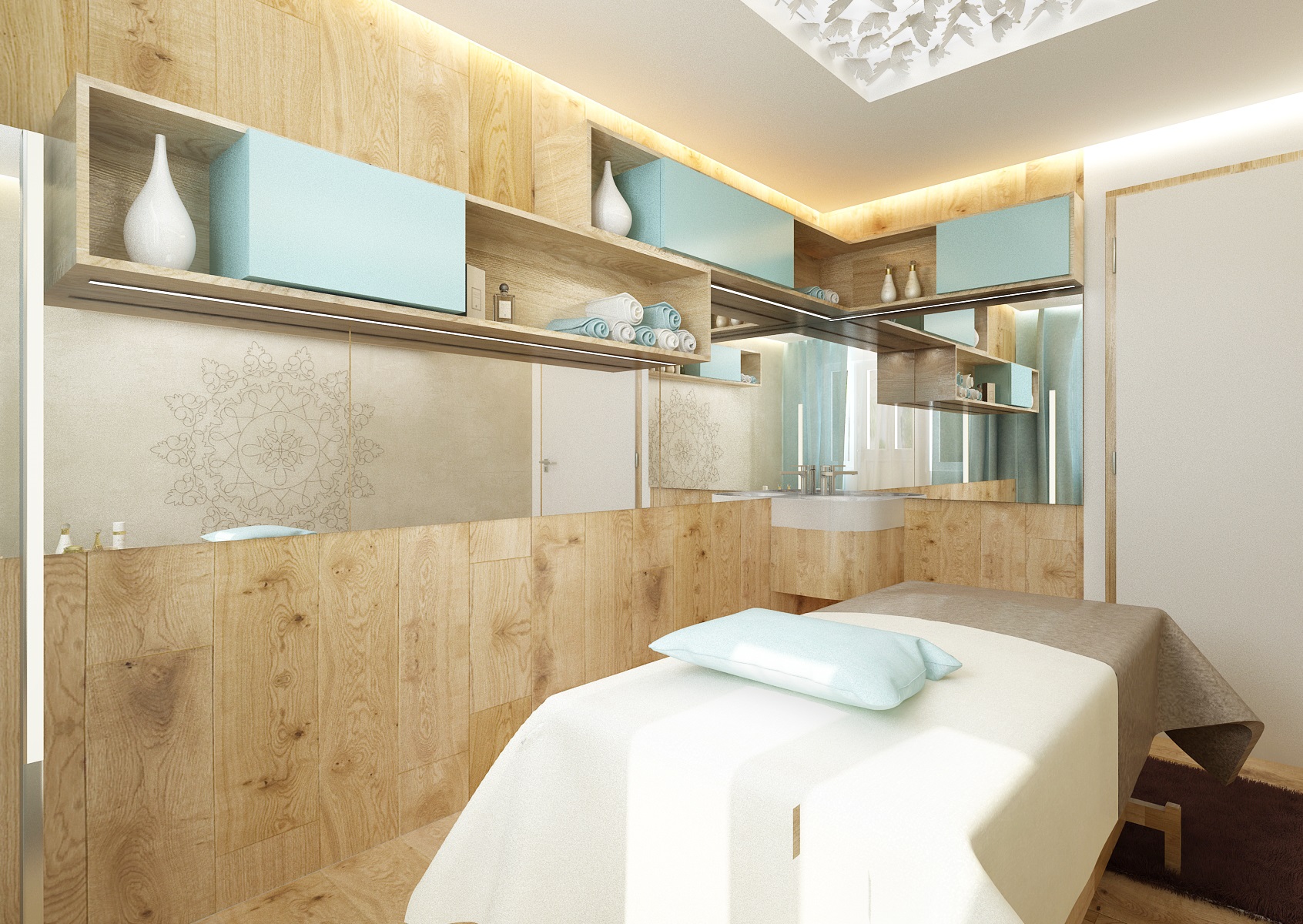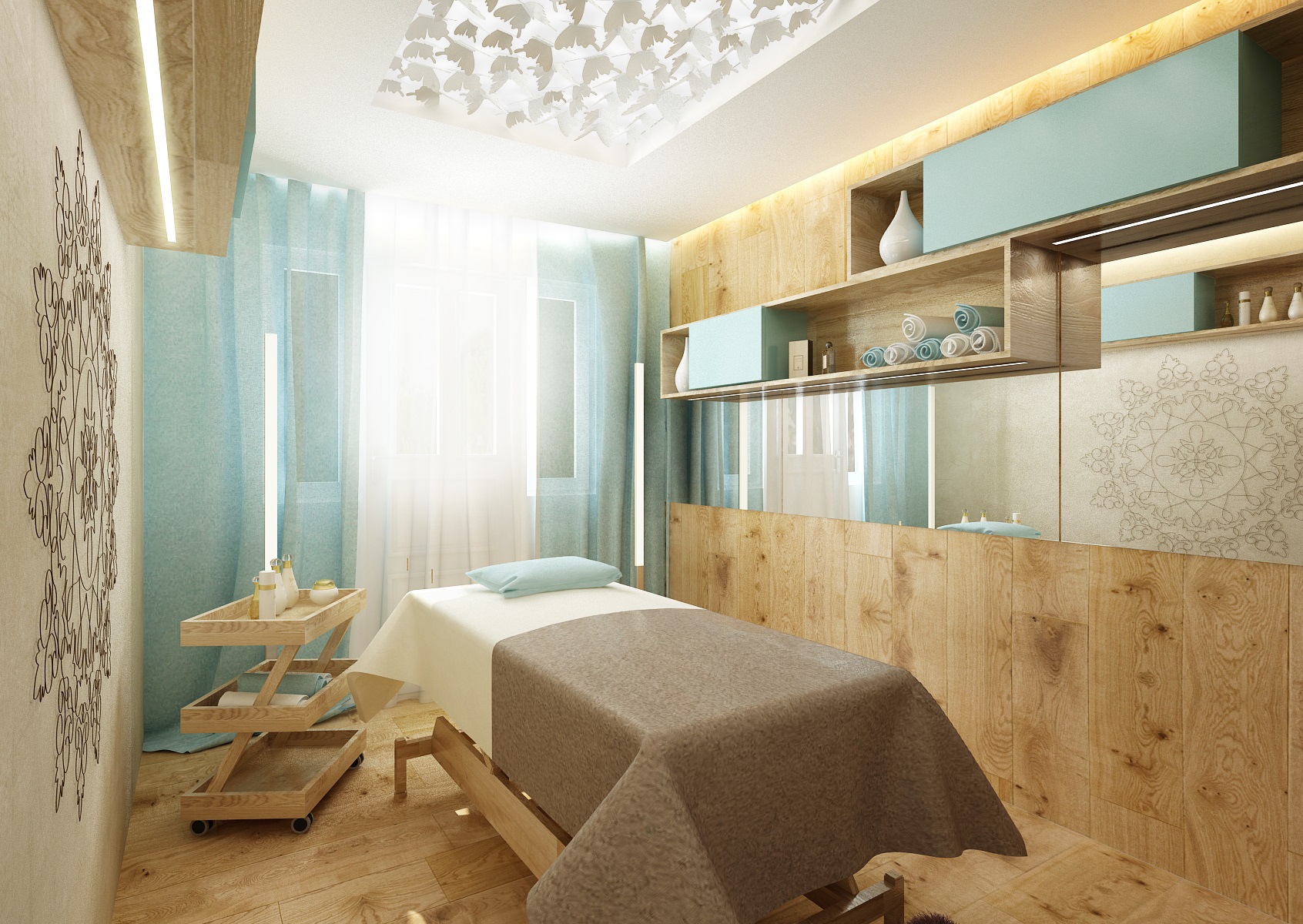 Design of yoga studio Samadhi in Kroměříž. Massage salons and exercise rooms are decorated with a typical mandala on a light brown spatula. Furniture and floors in natural oak (in a variant in mud oak). The benches under the windows cover the heating of the room and large mirrors are also a necessity, which lighten the space and at the same time serve to check the correct execution of exercises.