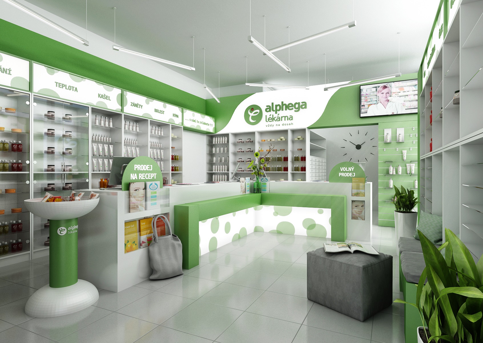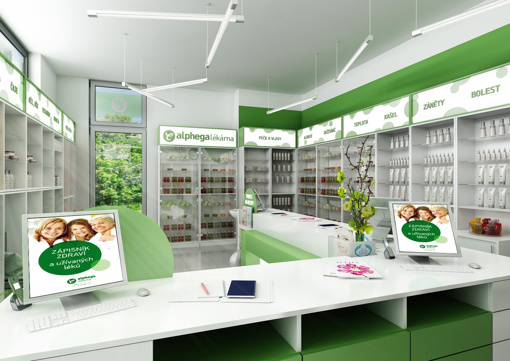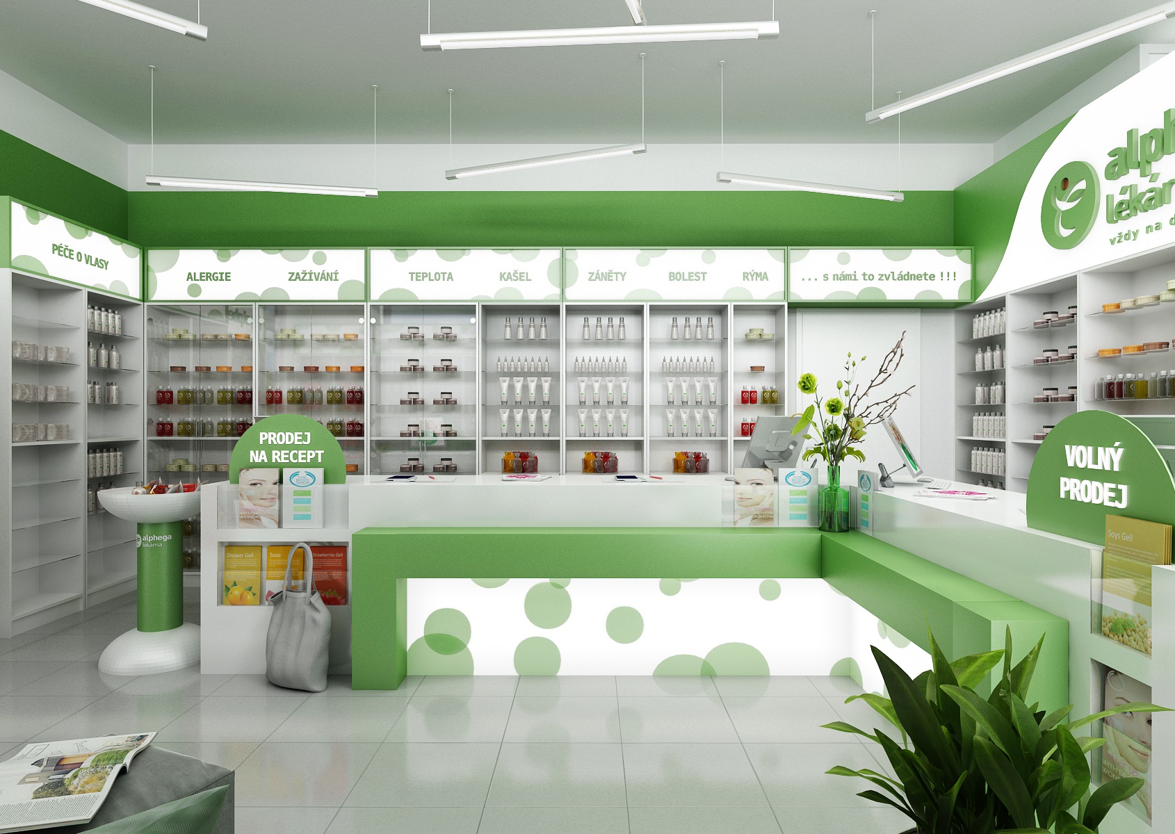 Renovation of the interior of the Alphega pharmacy in Prague based on the company's design manual. As usual, pharmacies are also decorated in white with the green elements on both the shelves and the sales counter. The white backlit background is decorated with green circles that overlap. The room looks clean and simple.