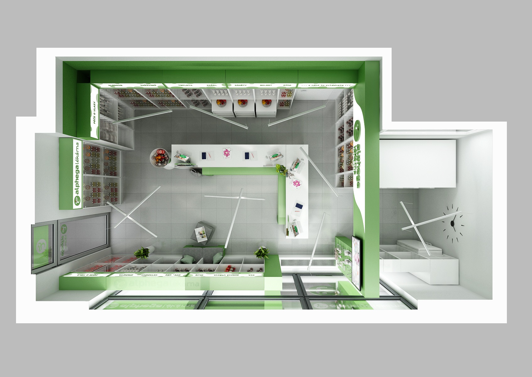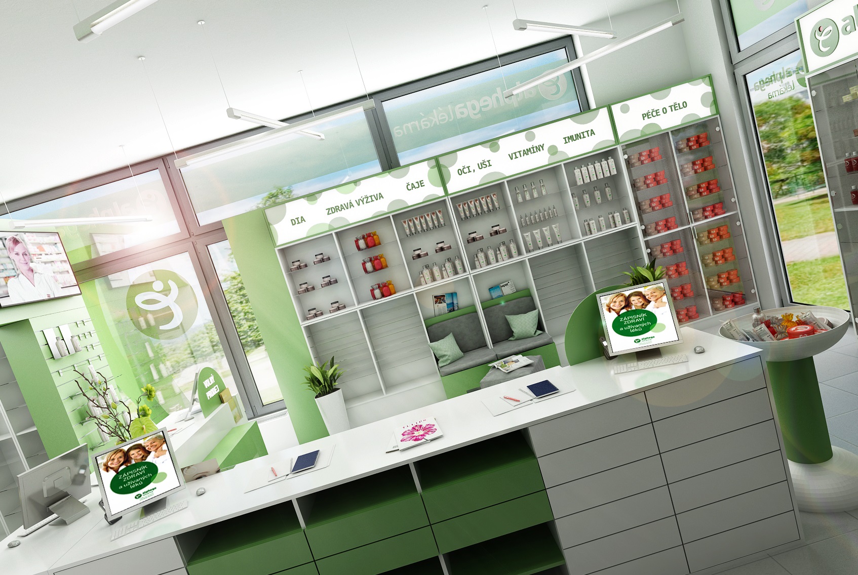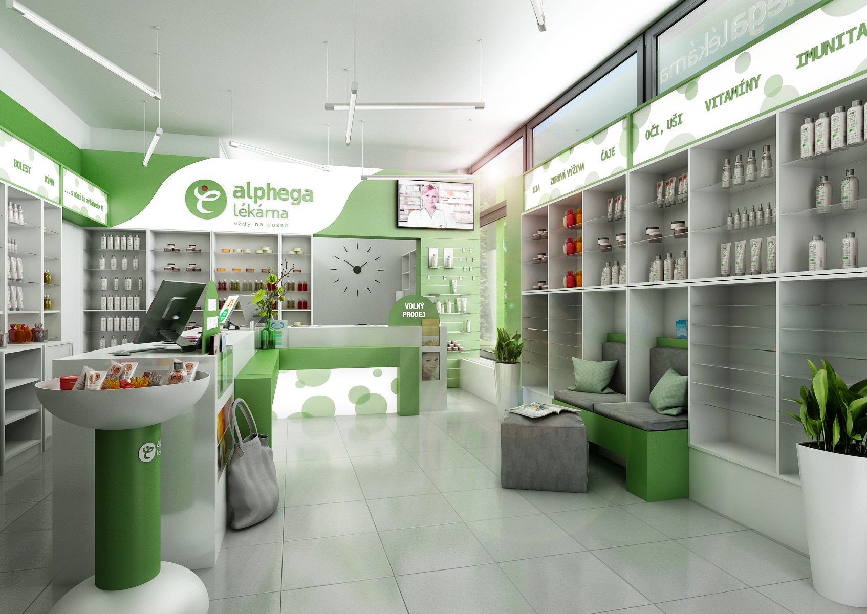 Renovation of the interior of the Alphega pharmacy in Prague based on the company's design manual. As usual, pharmacies are also decorated in white with the green elements on both the shelves and the sales counter. The white backlit background is decorated with green circles that overlap. The room looks clean and simple.