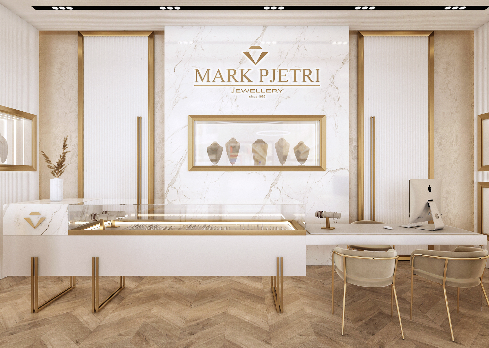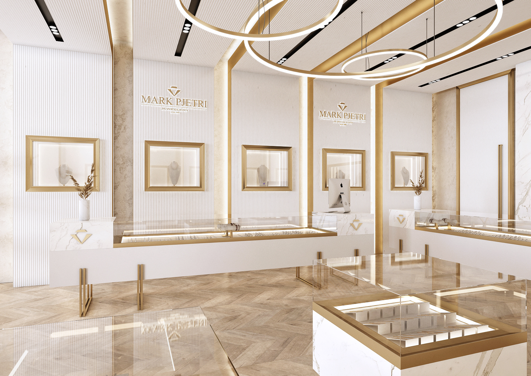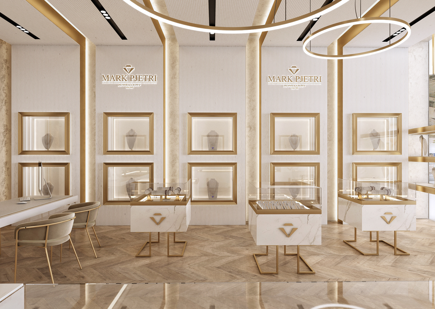 The interior of the Mark Pjetri jewelry store is designed in an elegant style dominated by white marble and gold accessories.
