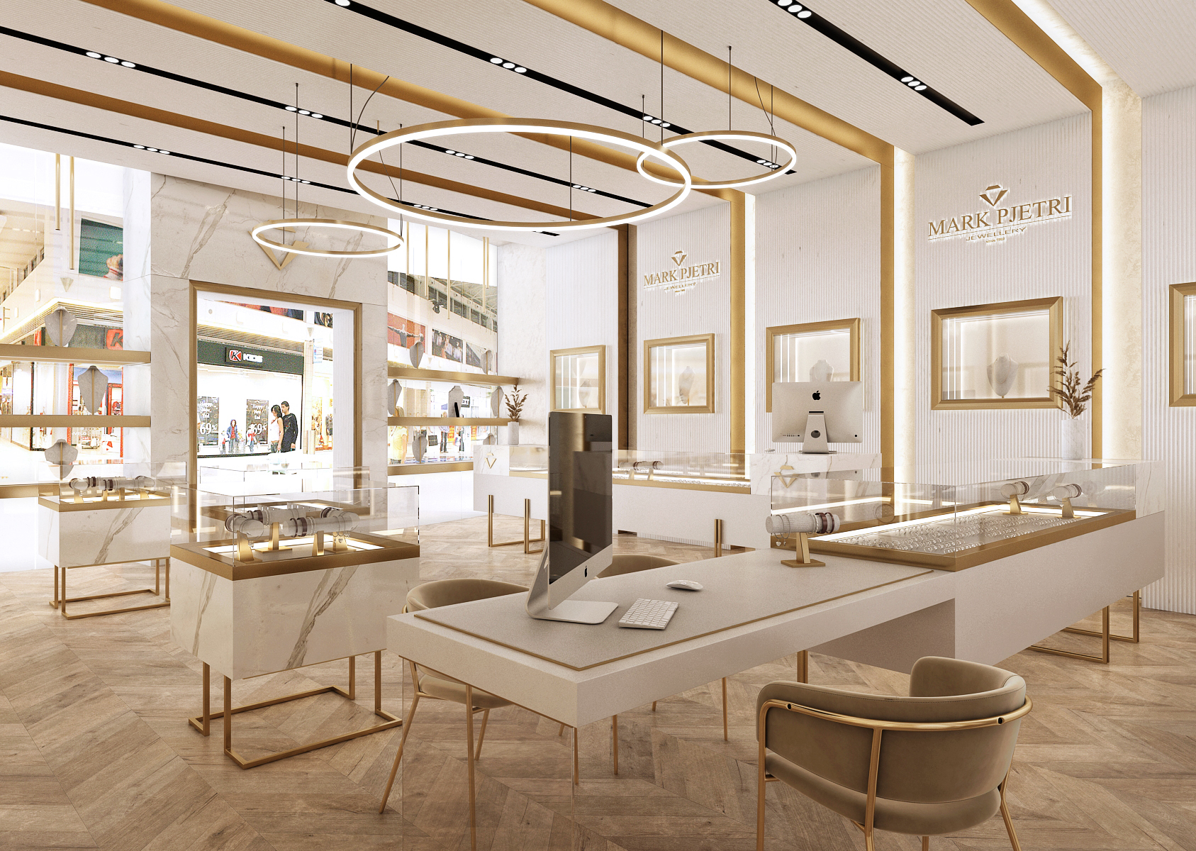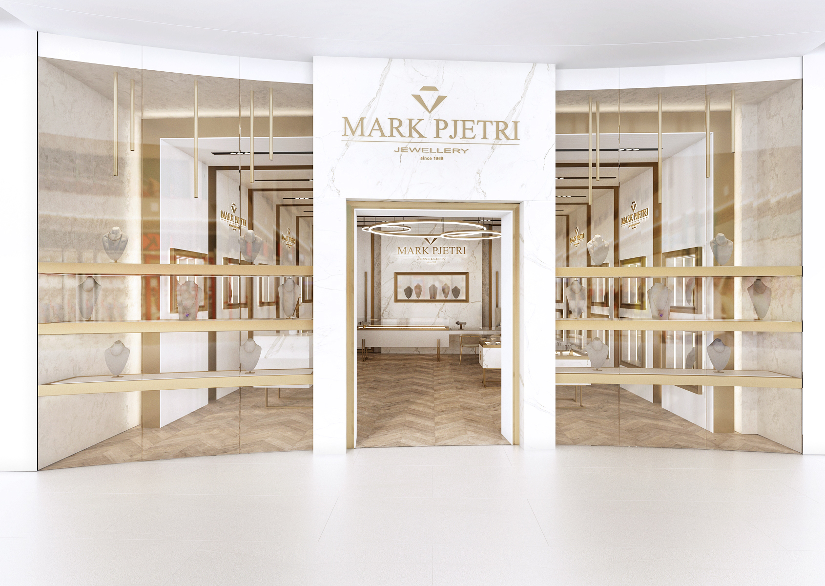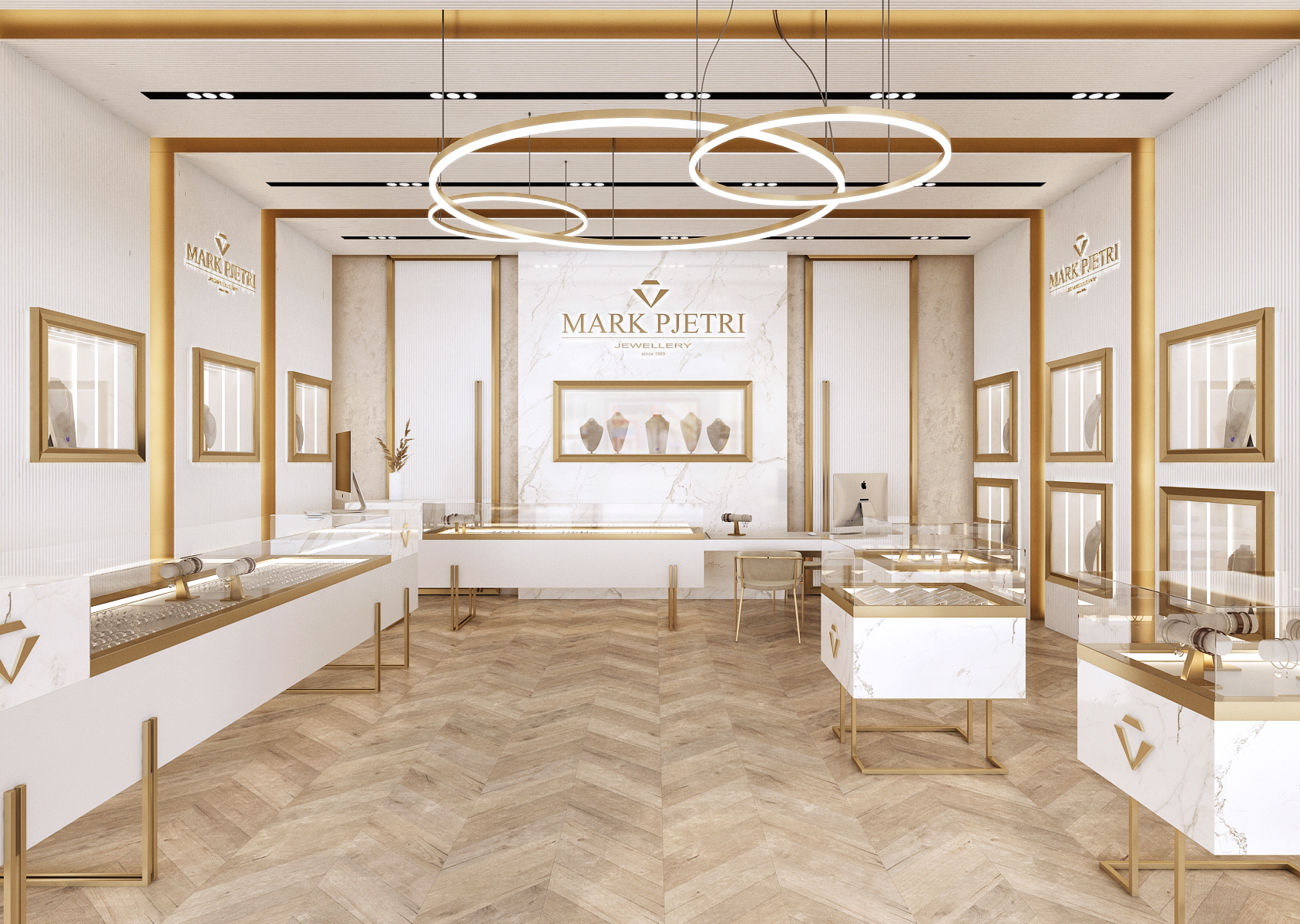 The interior of the Mark Pjetri jewelry store is designed in an elegant style dominated by white marble and gold accessories.