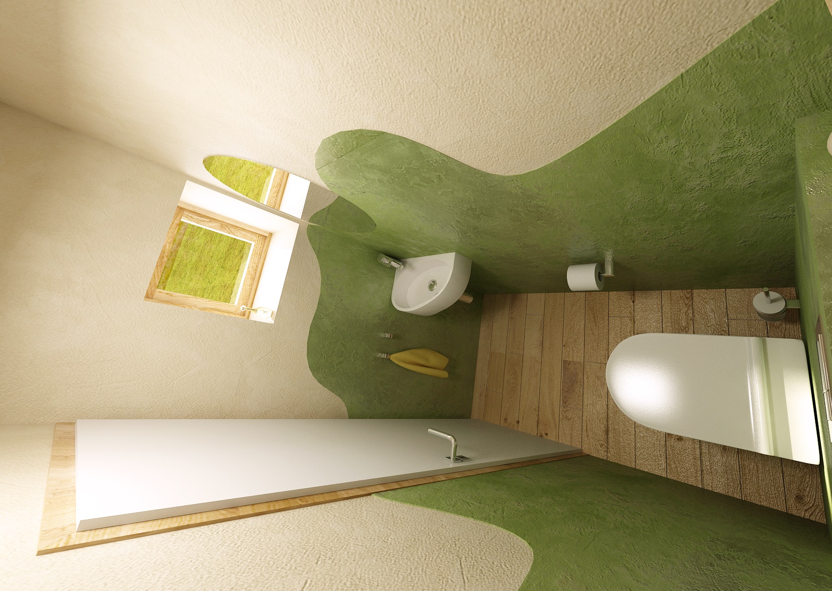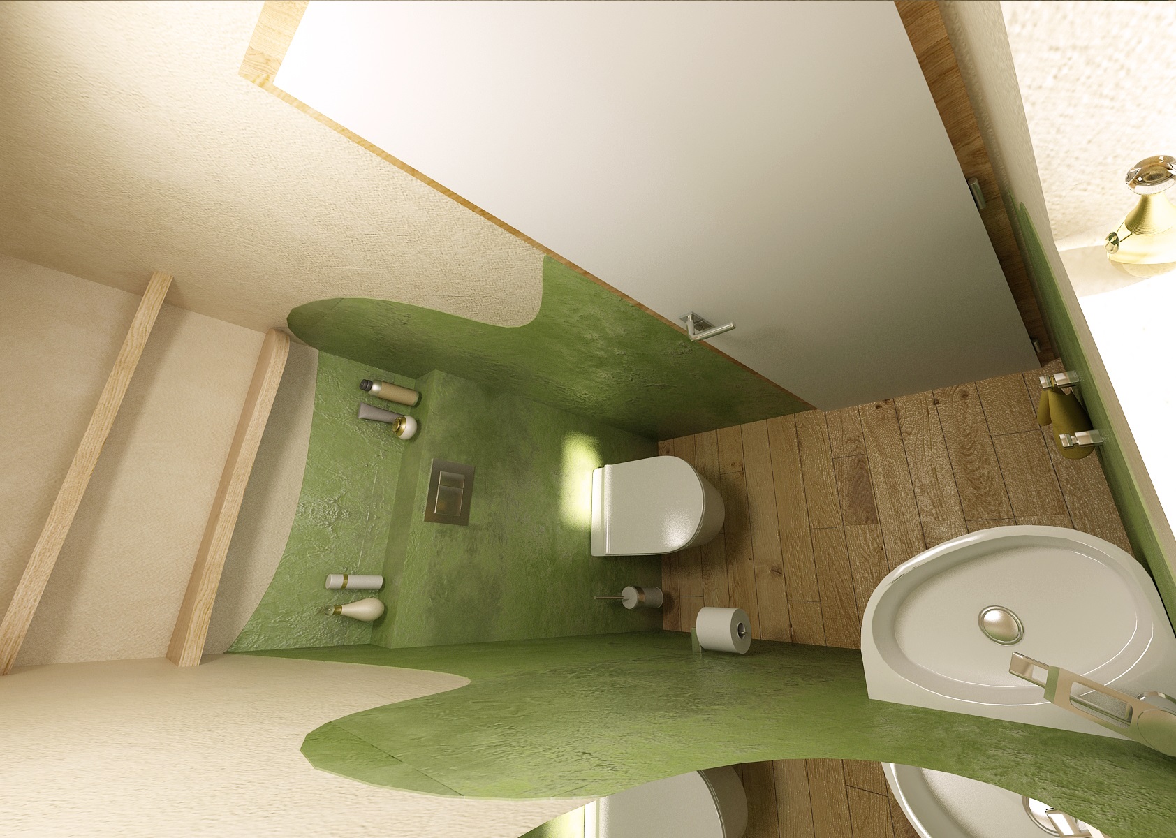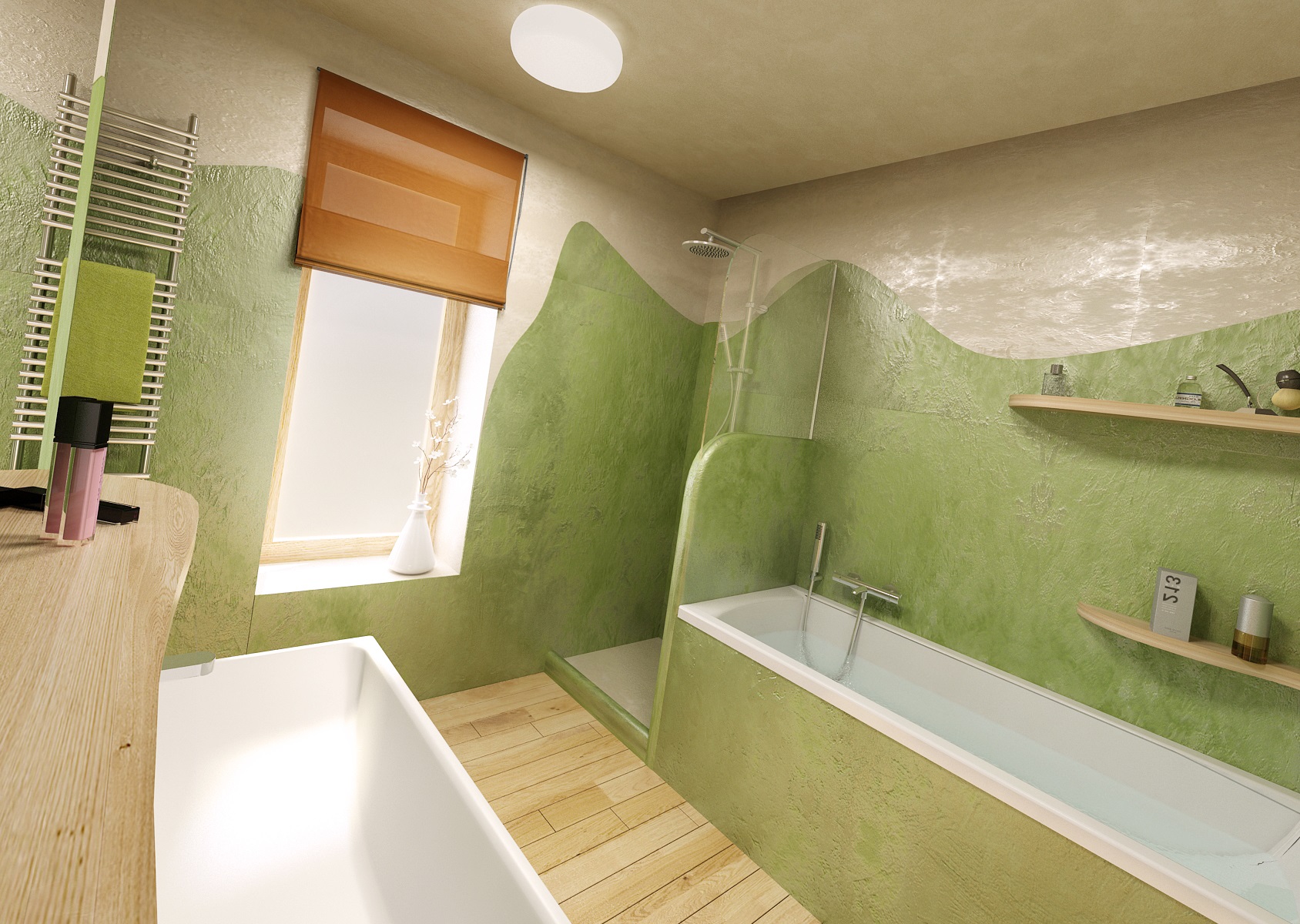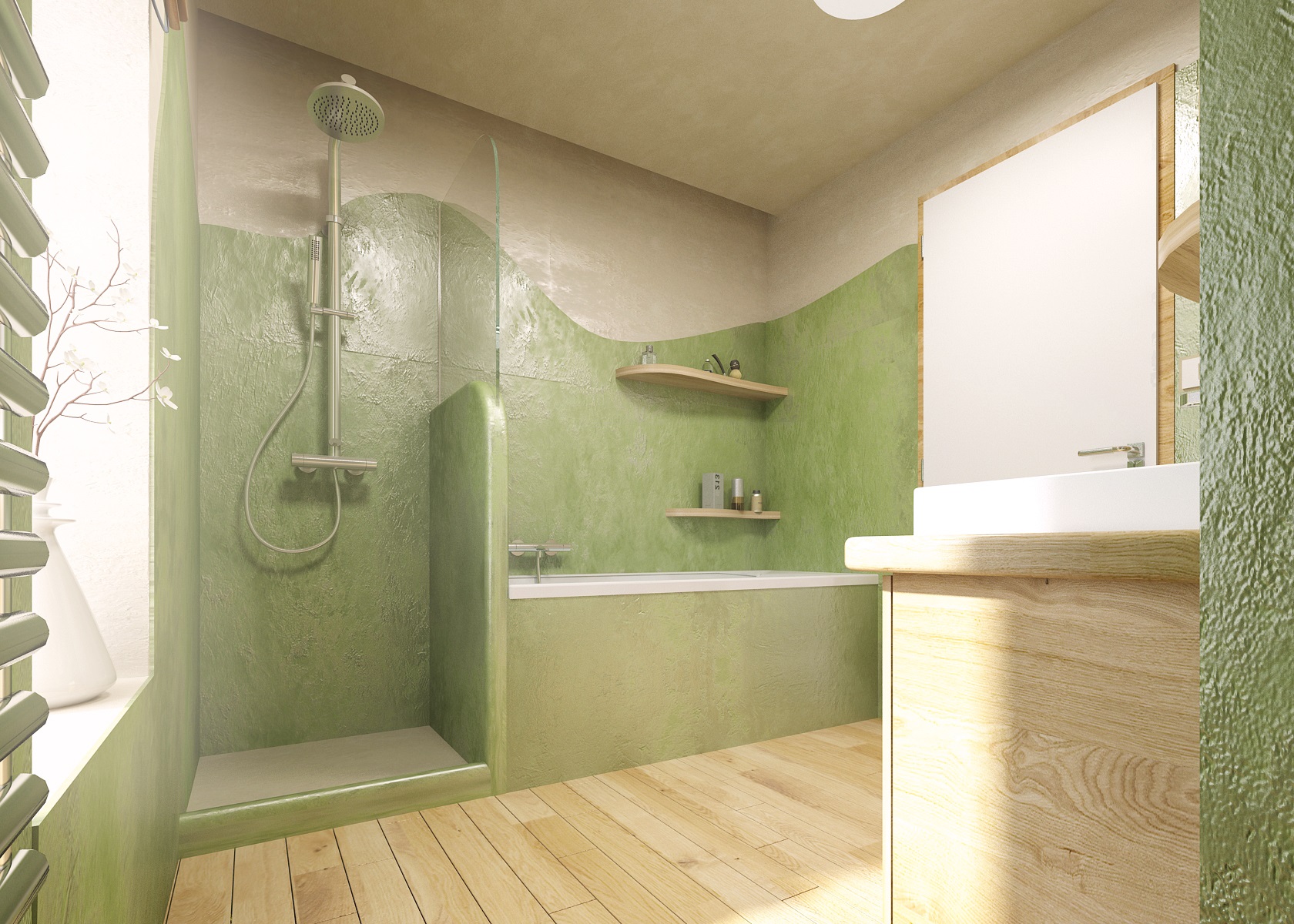 The bathroom does not always have to be just ceramic tiles. In this case, the customer wanted, in his natural wooden building, a bathroom using Moroccan stucco and solid natural oak used on the furniture and planks on the floor. The bathroom is decorated in shades of green in combination with light wooden floors.