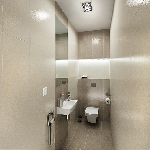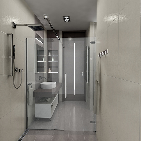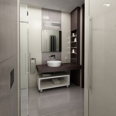 This project is focused on the simple and modern design of smaller bathroom spaces. The bathrooms are decorated in beige and gray tones. The purpose of the bright tiles is to optically enlarge the room. Ceiling lights in the form of reflectors ensure sufficient lighting of the room. The angular design of the furniture elements looks clean and elegant.