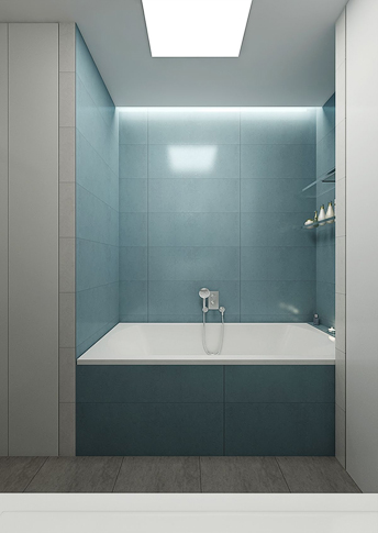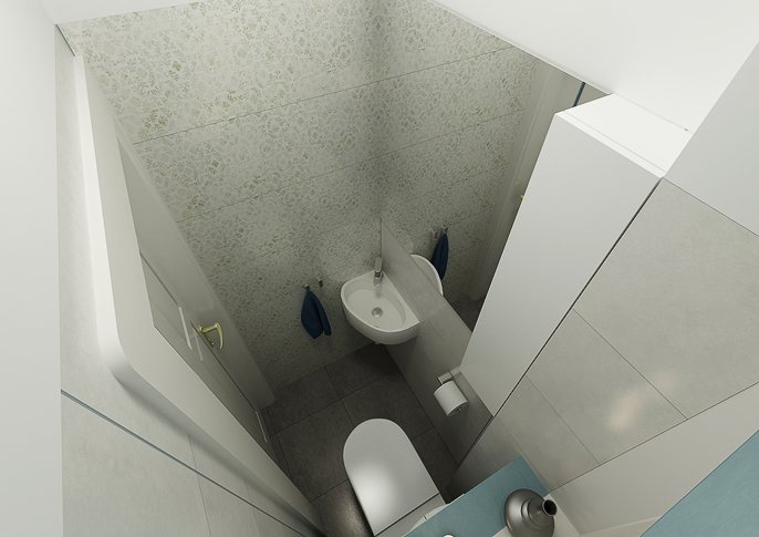 Demonstration of the use of a small space for a bathroom. The bathroom is decorated in light colors, which have the task of optically enlarging the space. White tiling is combined with pastel blue. The room thus looks soft and clean. Thanks to the choice of simple elements, the bathroom is modern.