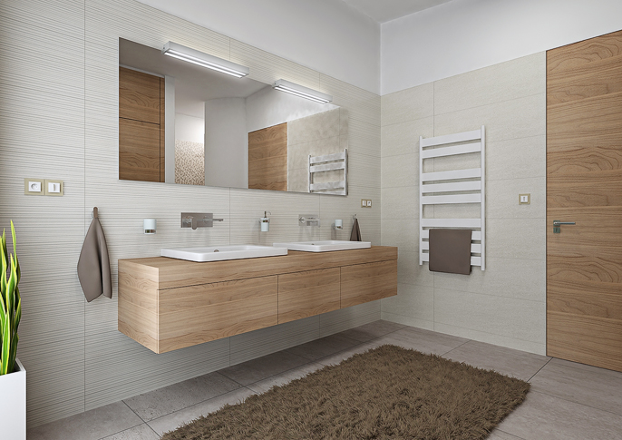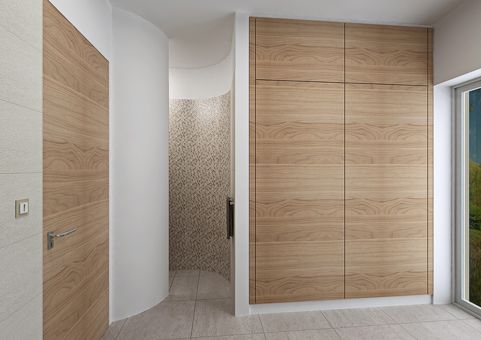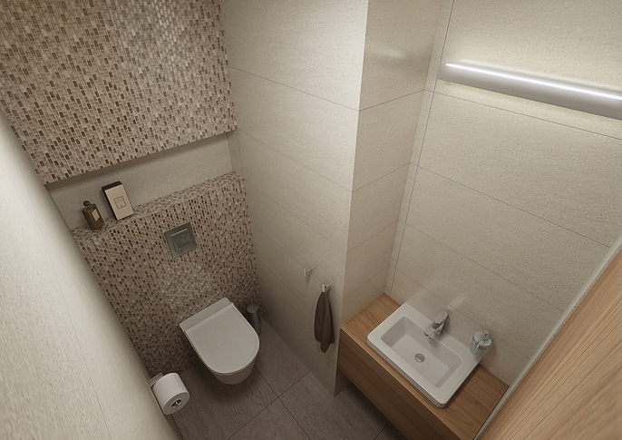 Bathroom with oval shower with mosaic in cream colors. The space looks simple and modern. Thanks to the absence of handles, the interior looks clean and neat, which is also helped by the rounding at the shower enclosure. There is also a large mirror, which magnifies the room optically. Large windows provide plenty of natural light.