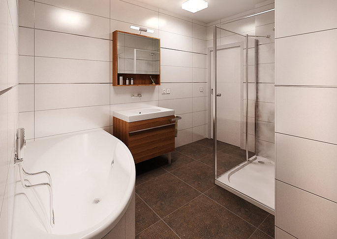 Two bathroom designs with corner bath. The first variant is combined with dark tiles, which contrast with the white elements of the furniture, which is complemented by dark wood decor. A spacious glass shower optically enlarges the room. The white tiling brightens the room sufficiently.