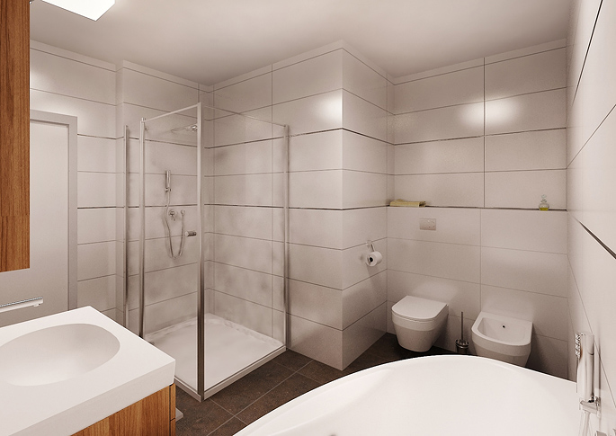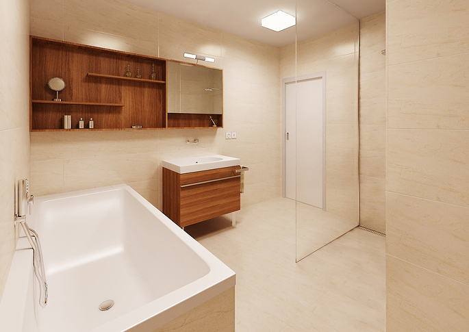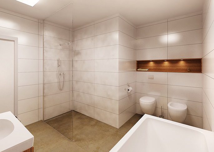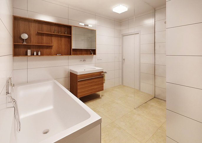 The second variant is in combination with light tiles, which help the white tiling to illuminate the room. There is a larger storage space with a mirror and a glass screen.