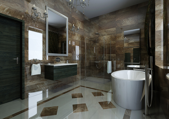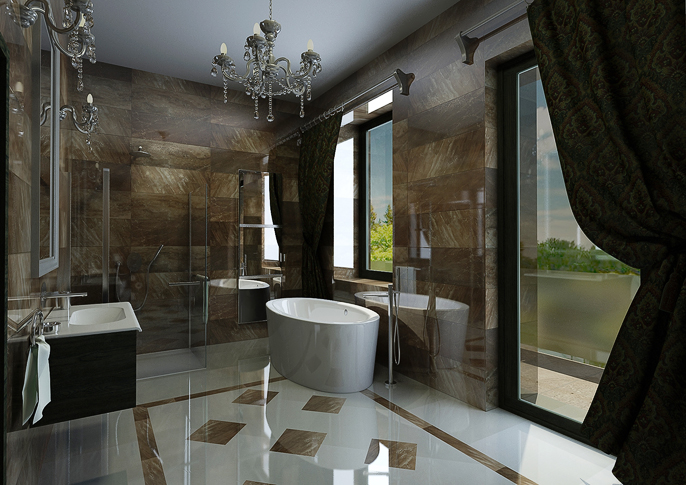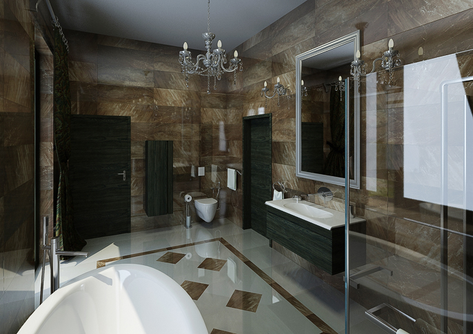 The modern bathroom with historic accessories is equipped with luxurious polished tiles on the floor creating an interesting composition. In addition to modern sanitary ware from the Design Bath company, the interior of the bathroom is complemented by crystal lights and a historic large mirror.