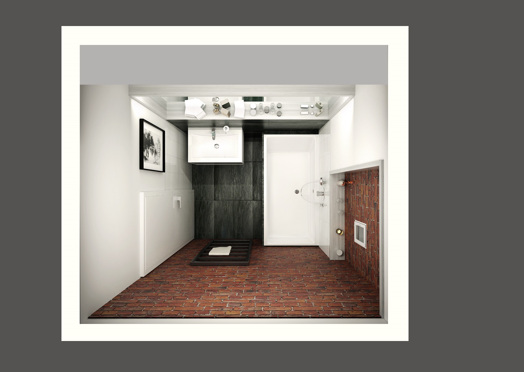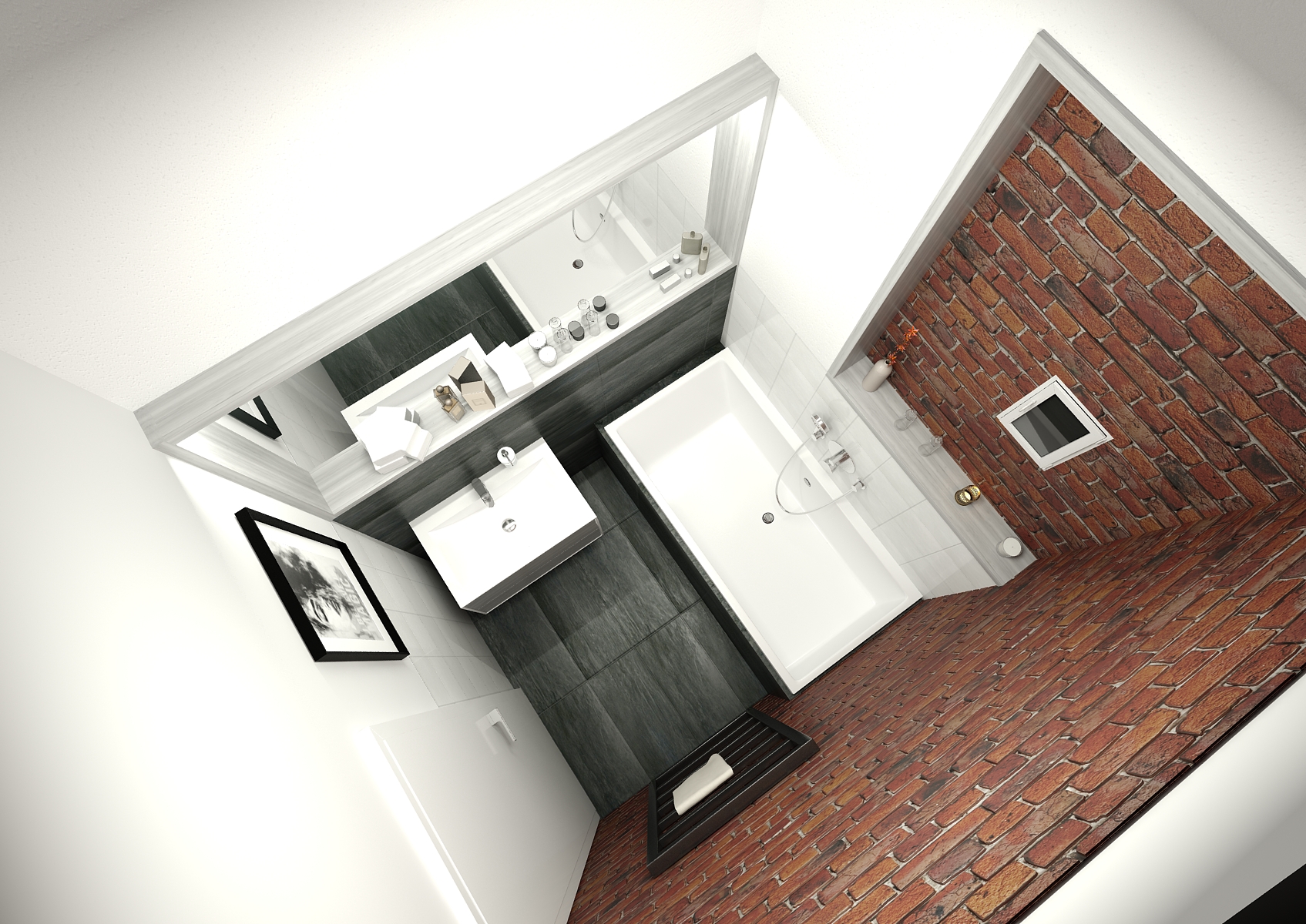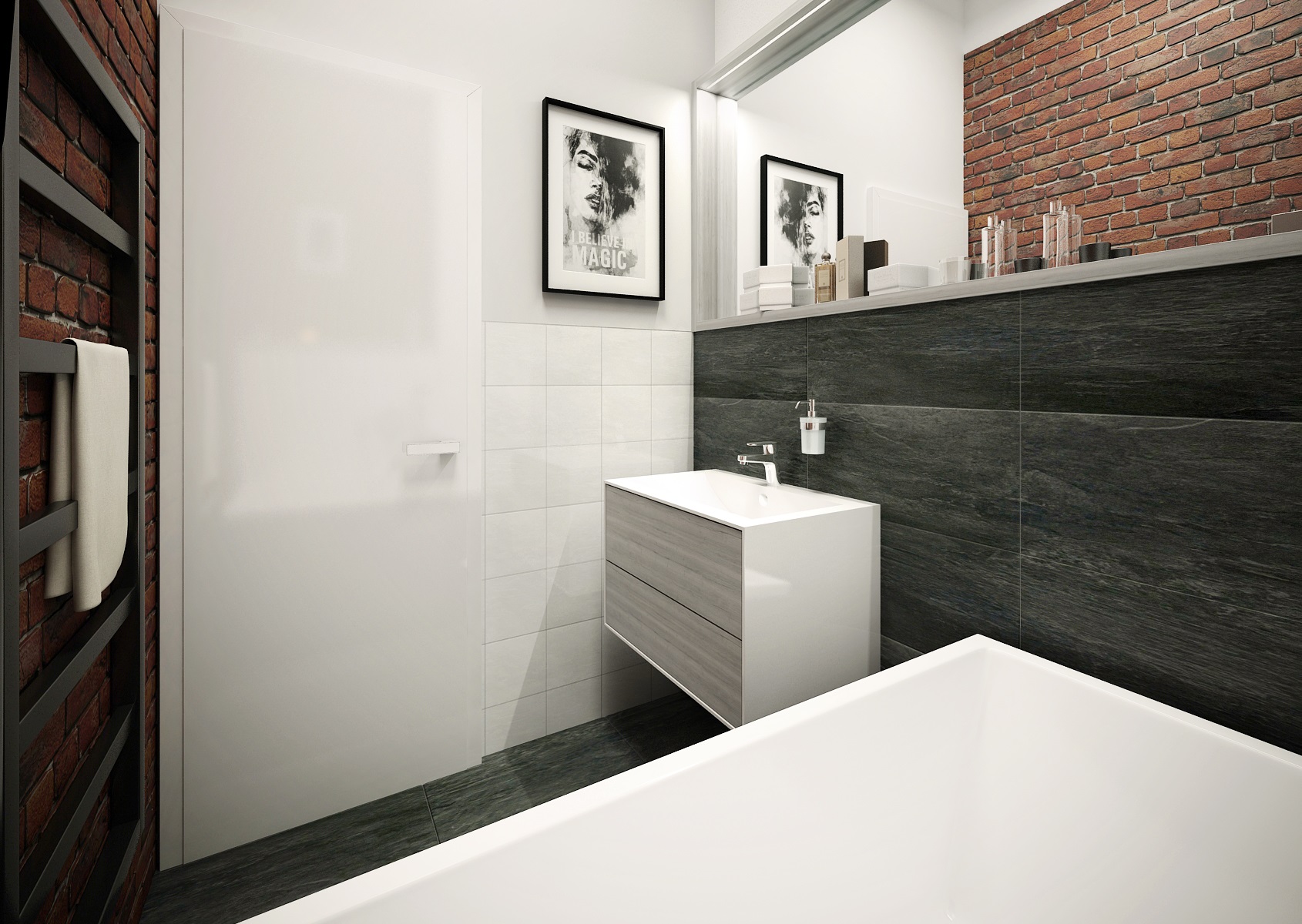 Thanks to Klinker brick tiles, the small bathroom with an industrial touch is proof that even in small spaces, interesting solutions can be devised. Elements in white brighten the room with the contrast of bricks and dark gray tiles, which turn into tiling on the wall under the mirror. A large mirror optically enlarges the room and makes it airy. Thanks to the square shape of the equipment, the space looks modern and clean.