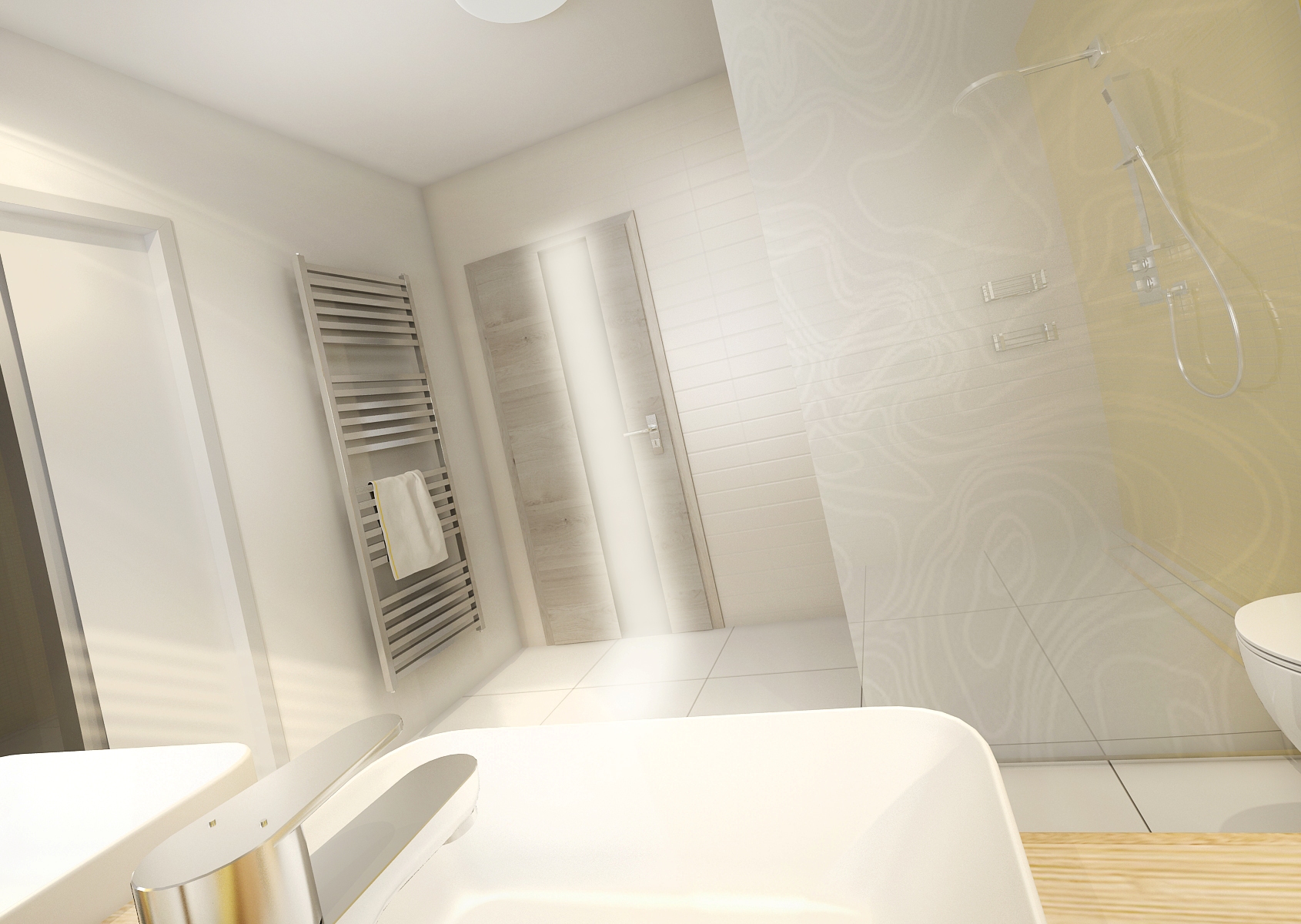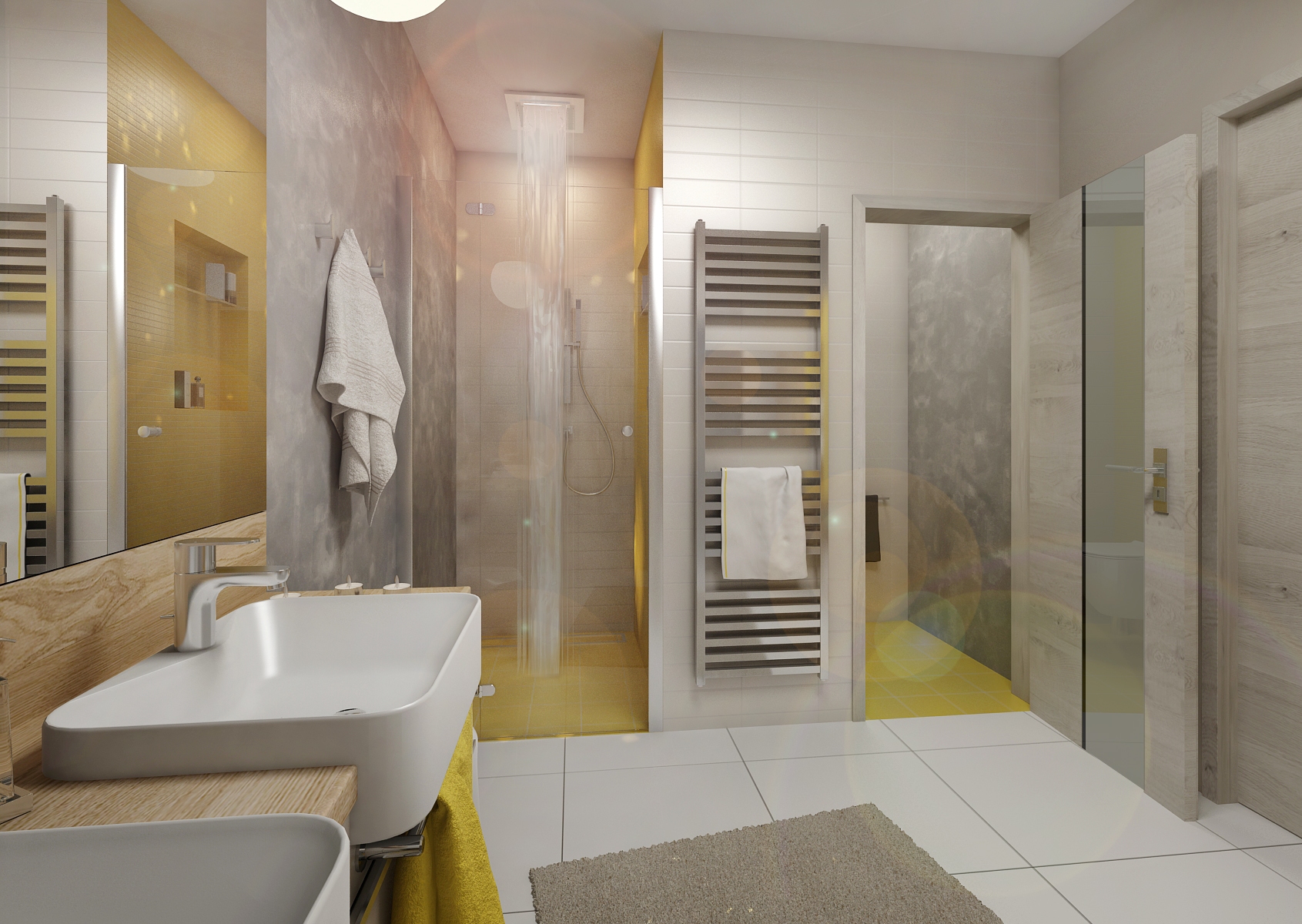 Design of two bathrooms in a family house in gray-white colors with an yellow accent. The floors are in matt white large.format tiles and white is then repeated on tiles of a small rectangular format. Gray is represented in the form of glossy Venetian stucco. Yellow appears in smaller proportions as a cube mosaic and a rectangular tile. An interesting finesse in the parent’s bathroom is a sliding mirror in front of the window.