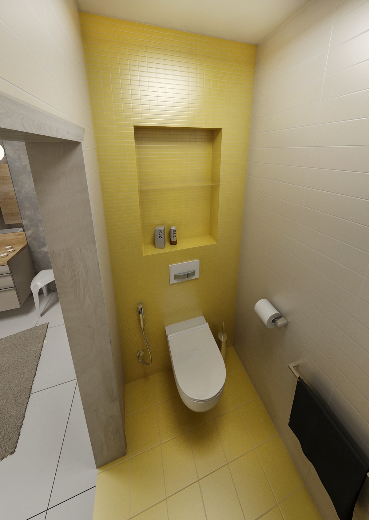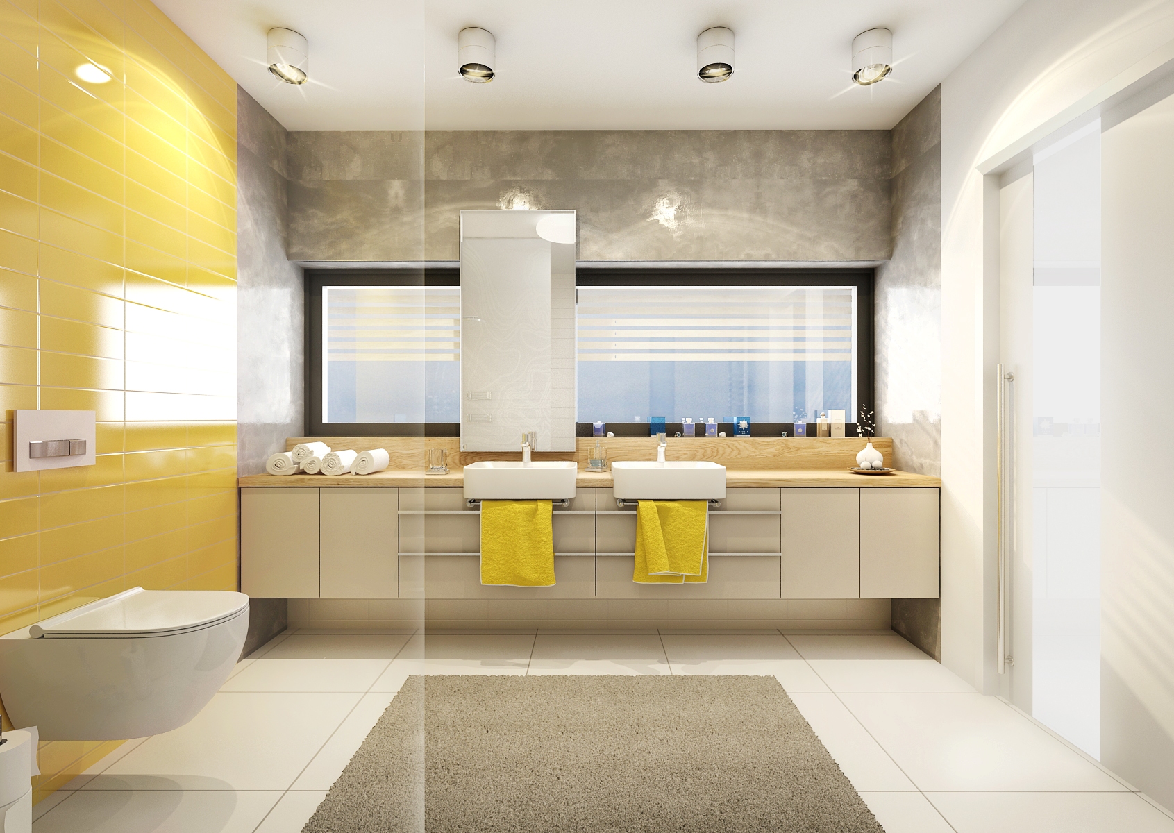 Gray-white bathroom with an yellow accent