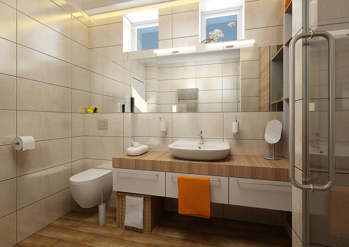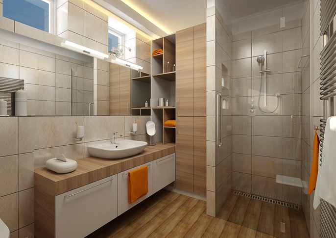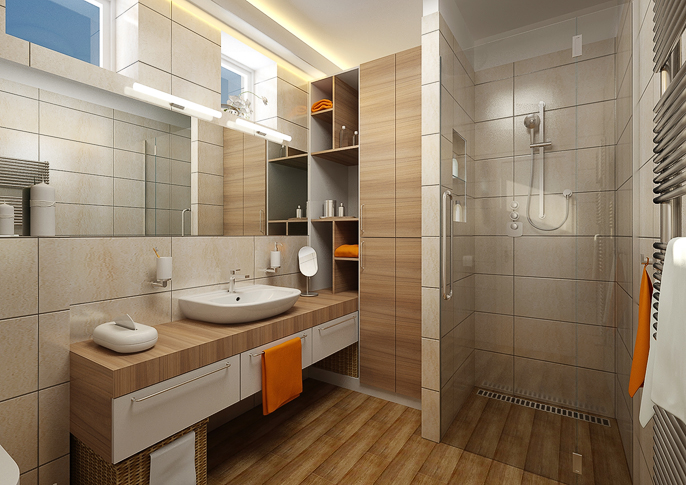 The bathroom in the family house with a shower and tiling with oak wood decor looks modern and natural. Thanks to the light cladding on the walls, the room is sufficiently bright. The bathroom is harmonized with orange accessories.
