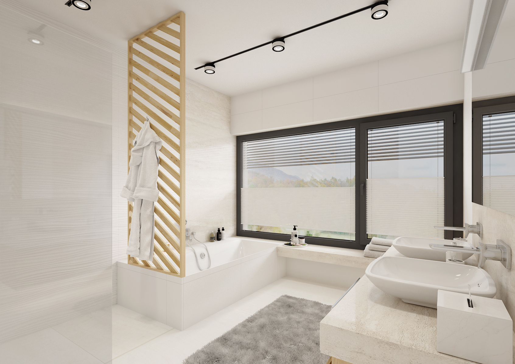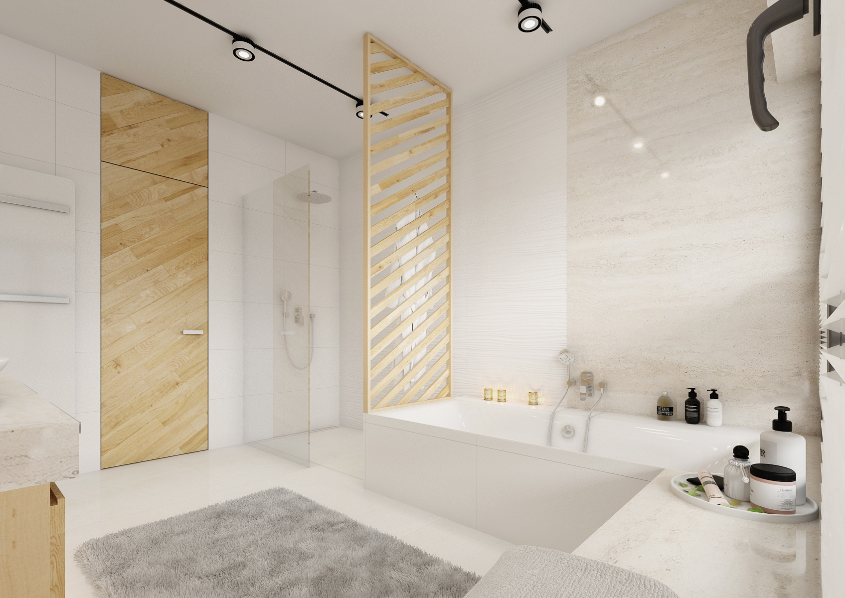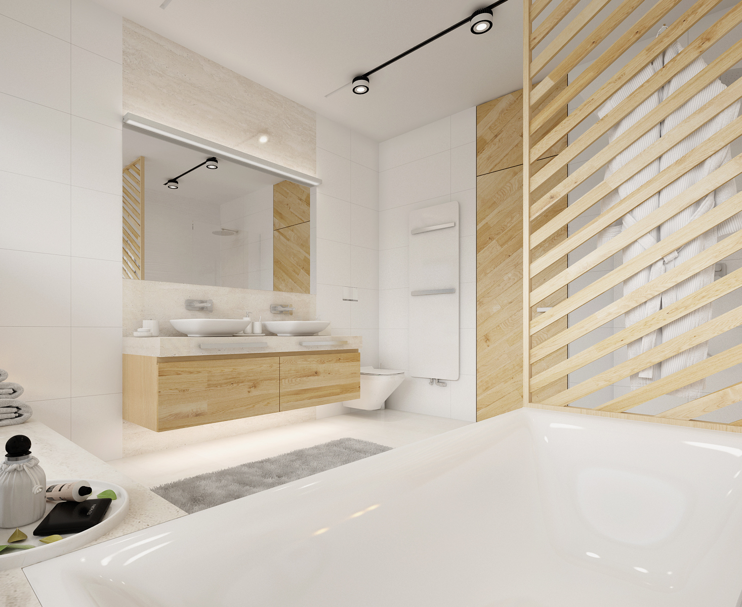The backlighting of the cabinets not only increases the space of the bathroom, but we can use it for dim night lighting. The multifunctional partition at the bathtub, screen and hanger in one, is made of solid wood and treated against moisture suction. Slanted crossbars repeat the pattern on interior doors. Walk-in showers omitted classic bathtubs, drainage gutters sunk into the floor were used. The modern bathroom should not forget the concealed faucets and integrated shower heads.