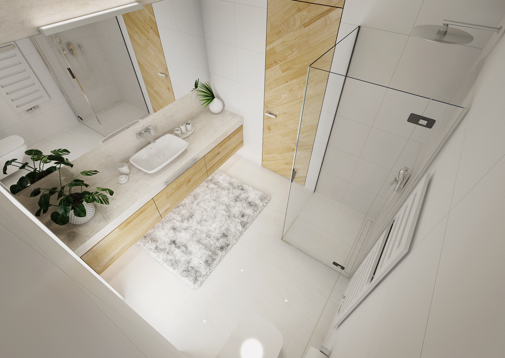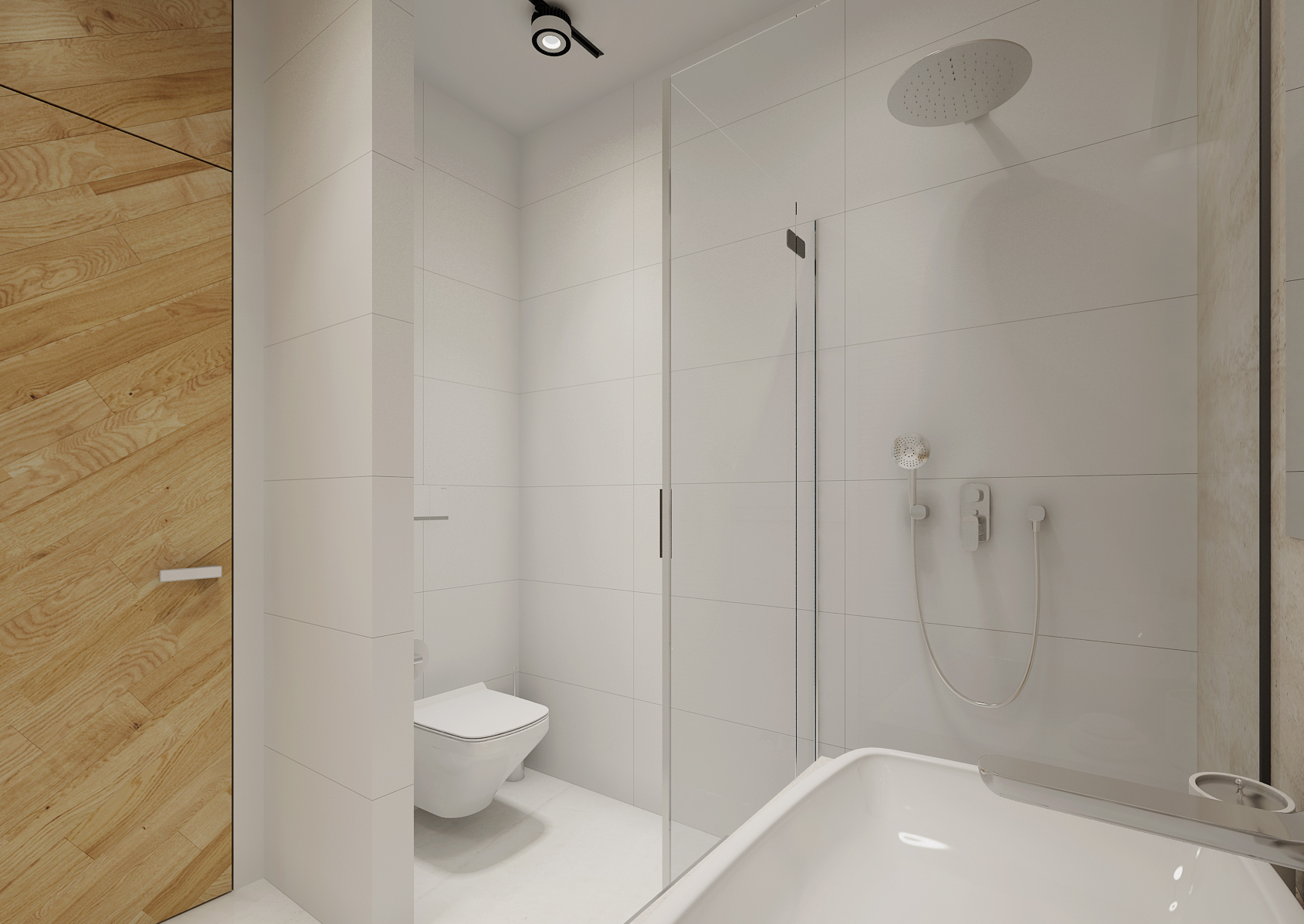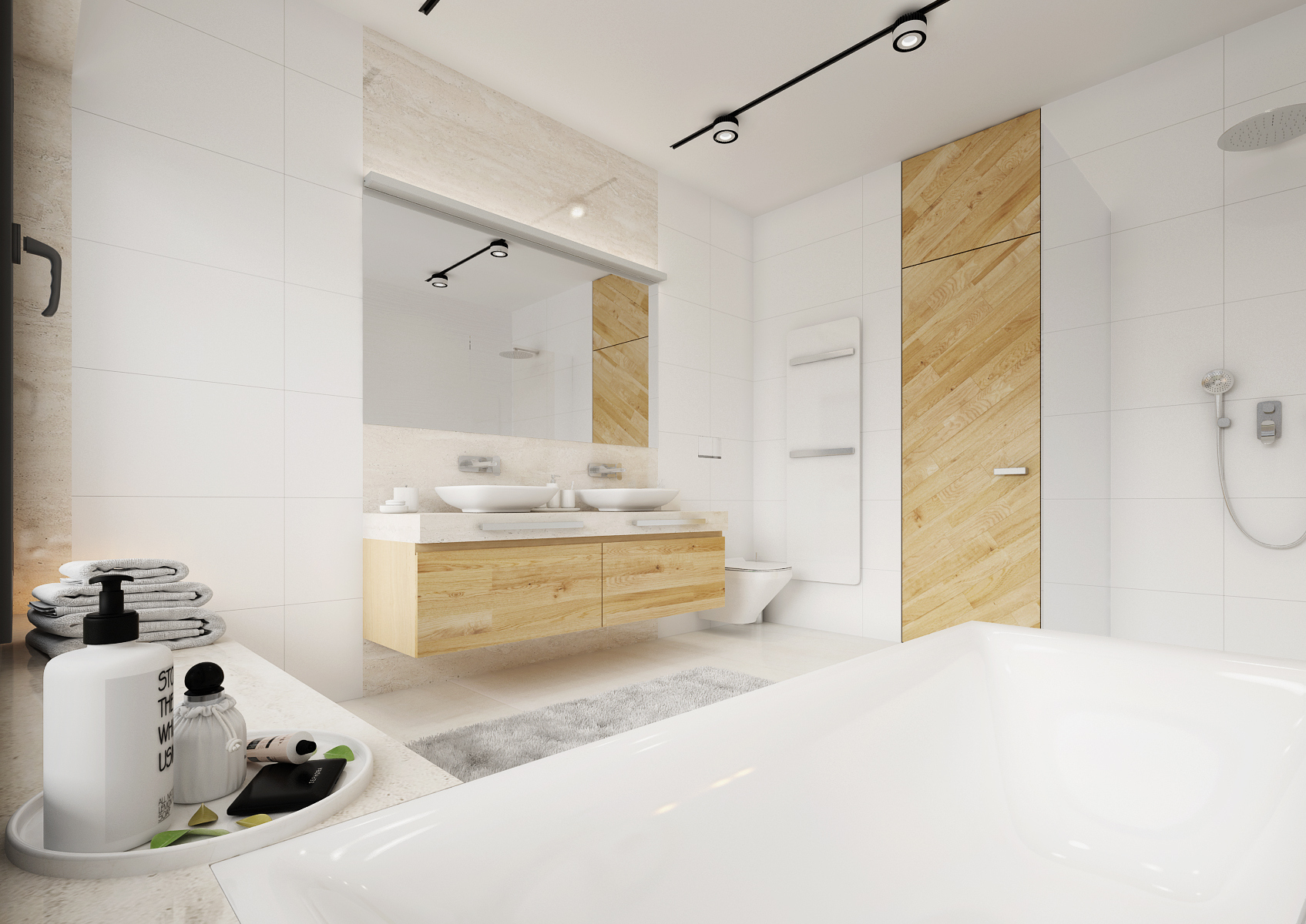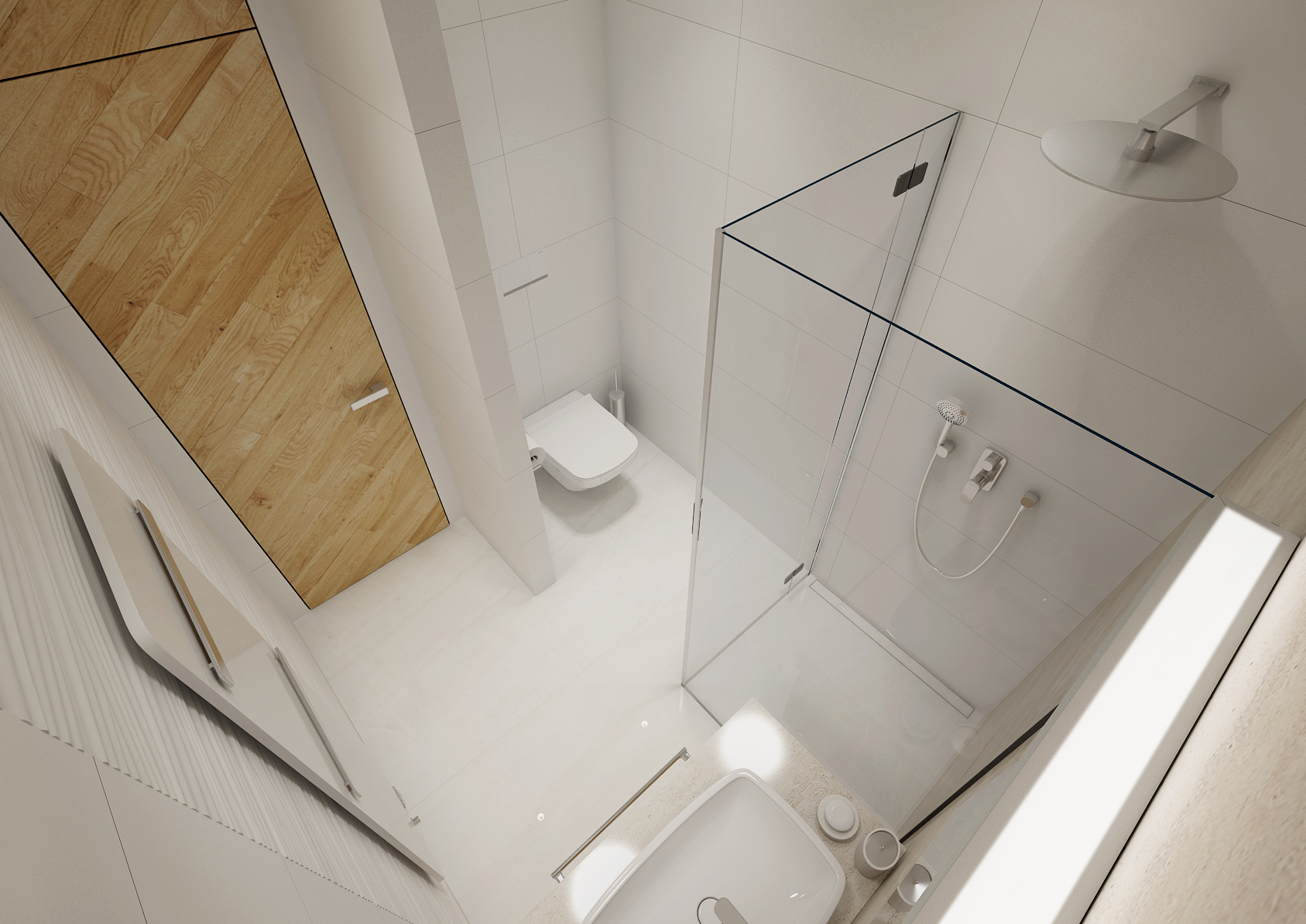 The backlighting of the cabinets not only increases the space of the bathroom, but we can use it for dim night lighting. The multifunctional partition at the bathtub, screen and hanger in one, is made of solid wood and treated against moisture suction. Slanted crossbars repeat the pattern on interior doors. Walk-in showers omitted classic bathtubs, drainage gutters sunk into the floor were used. The modern bathroom should not forget the concealed faucets and integrated shower heads.