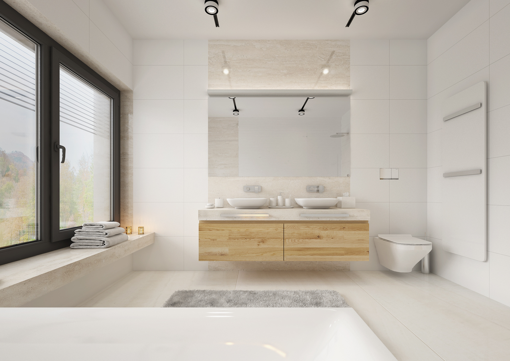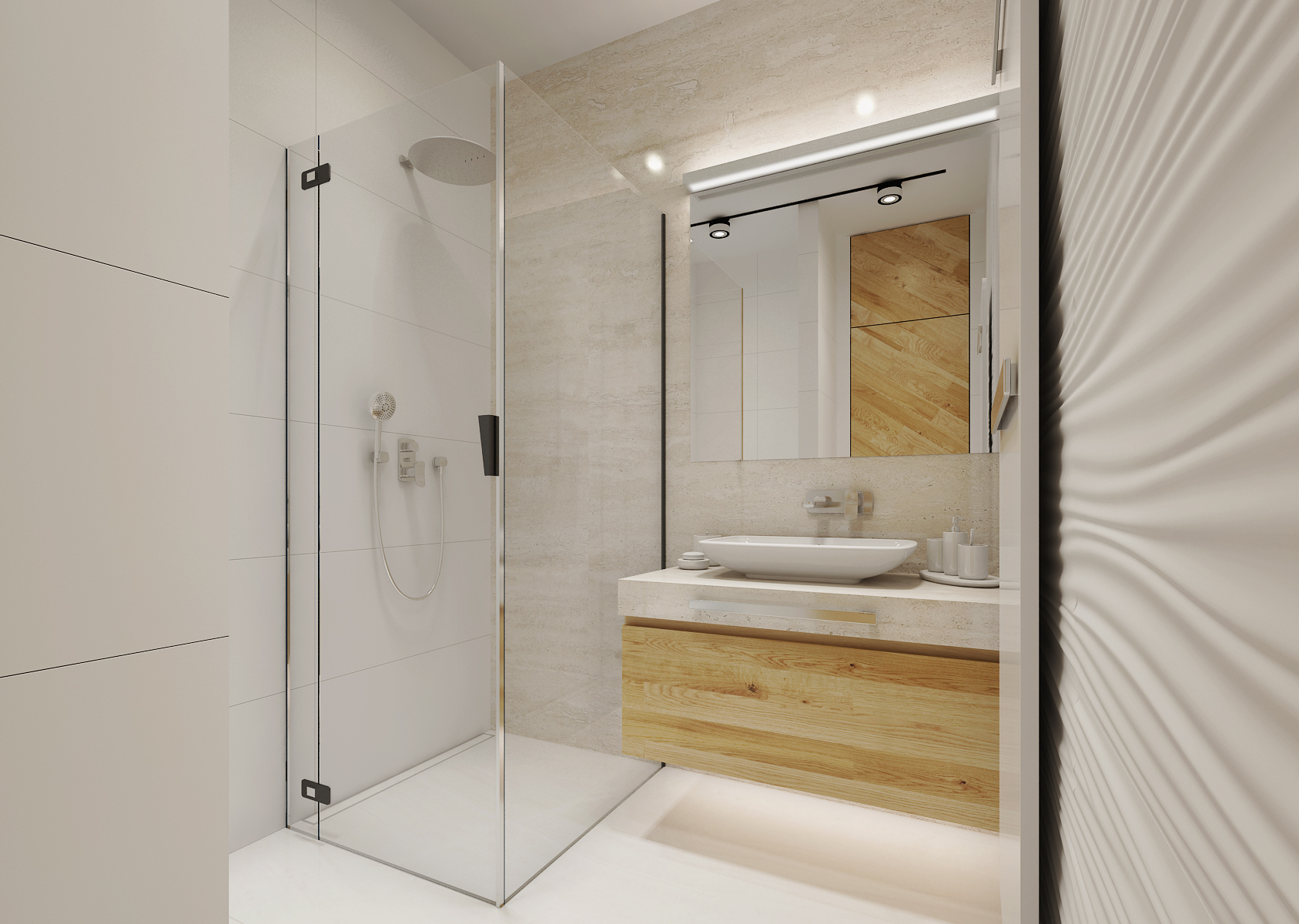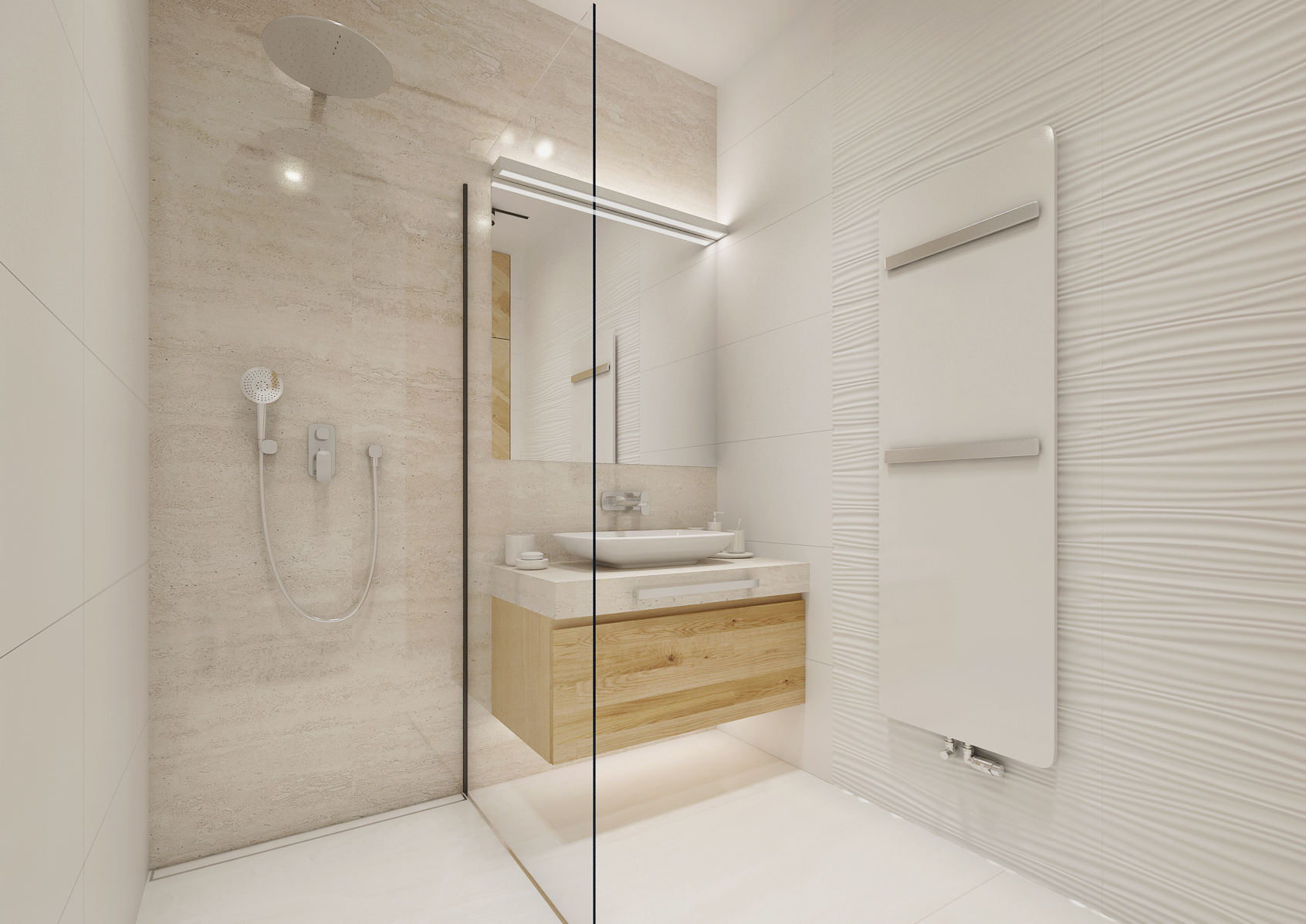 The bathroom in white is certainly not overrated. There are several of them in this house. Large-format tiling and paving in white gloss, smooth surfaces are complemented with 3D plastic ceramics from the supplier www.archtiles.cz and Travertine in the shade of ivory. Natural oak wood decor was used for the furniture.