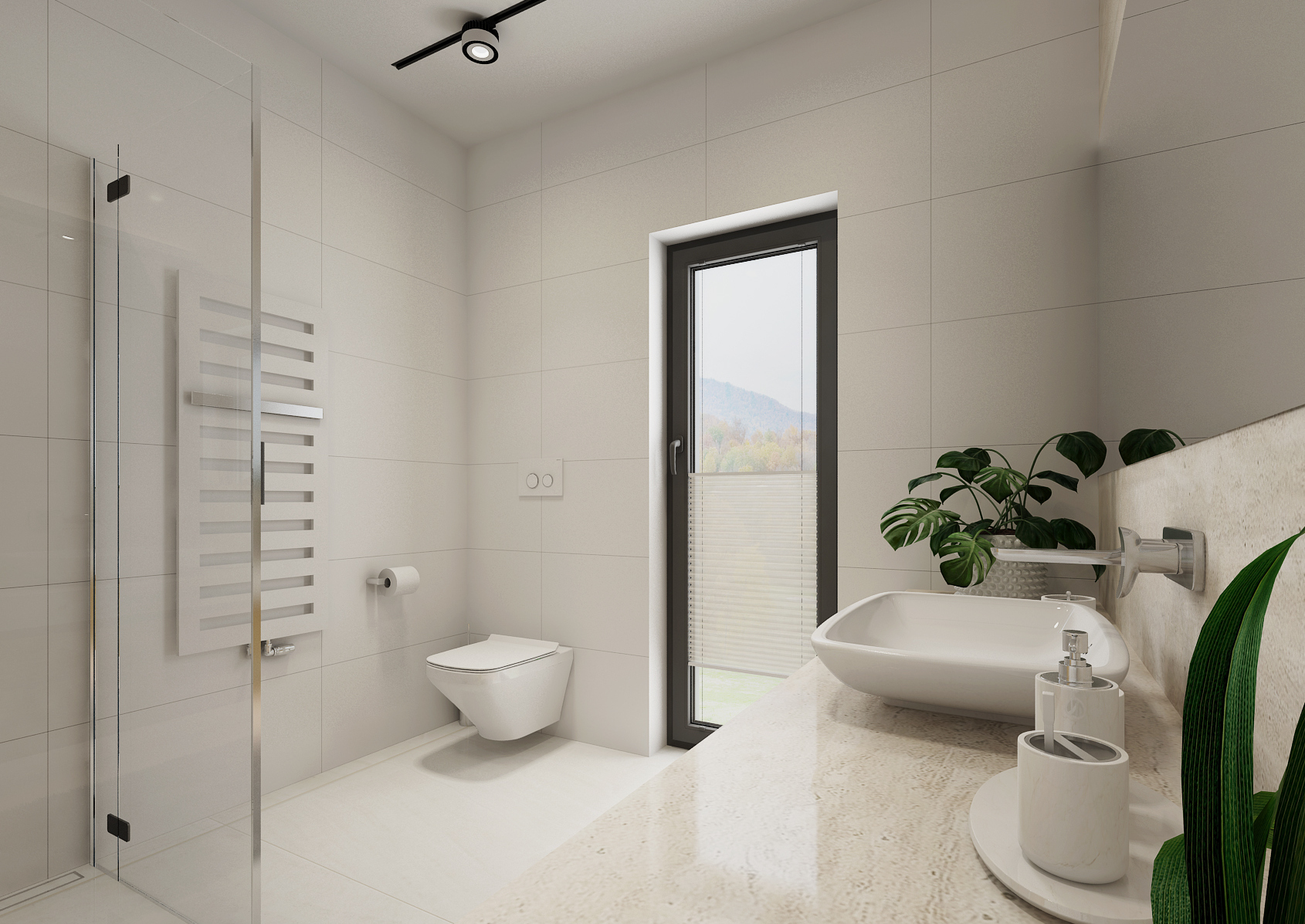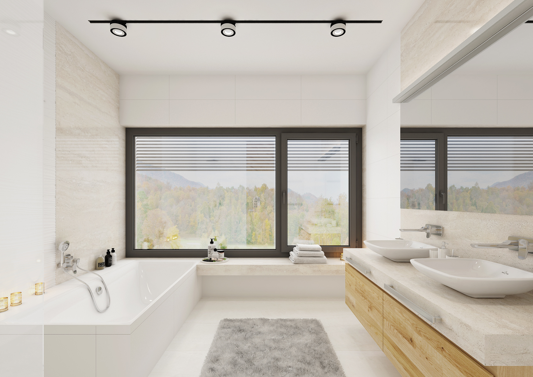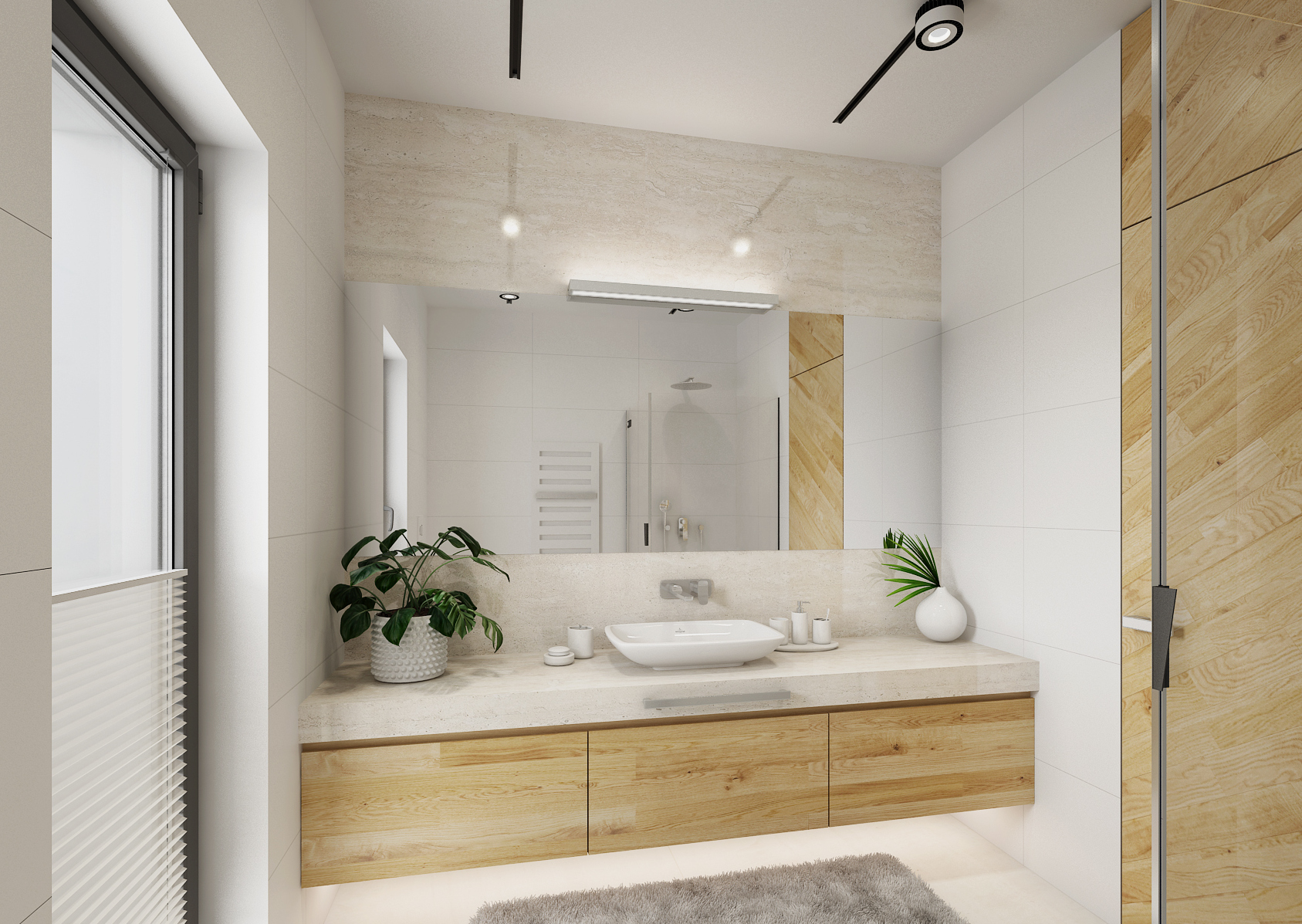 The bathroom in white is certainly not overrated. There are several of them in this house. Large-format tiling and paving in white gloss, smooth surfaces are complemented with 3D plastic ceramics from the supplier www.archtiles.cz and Travertine in the shade of ivory. Natural oak wood decor was used for the furniture.