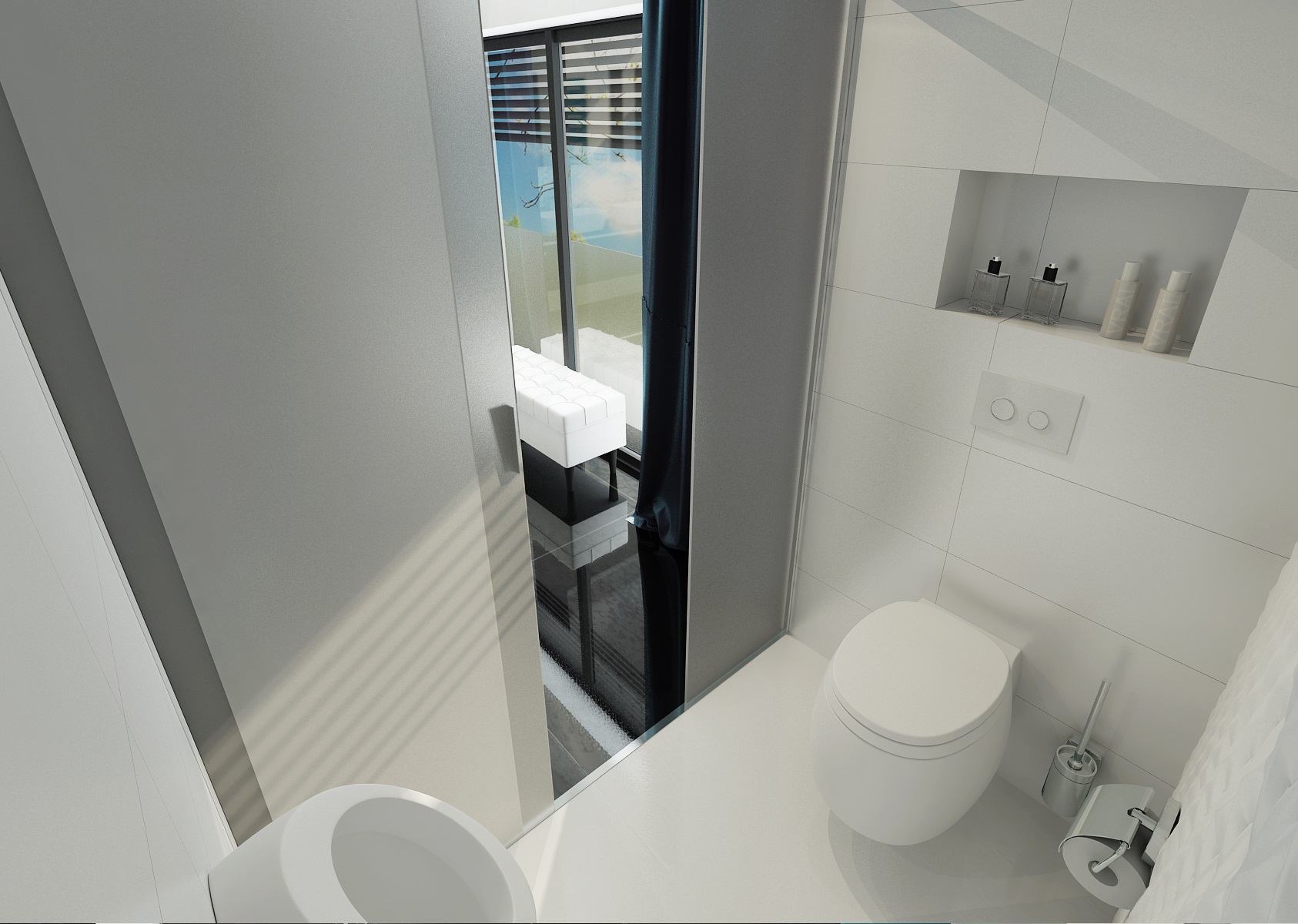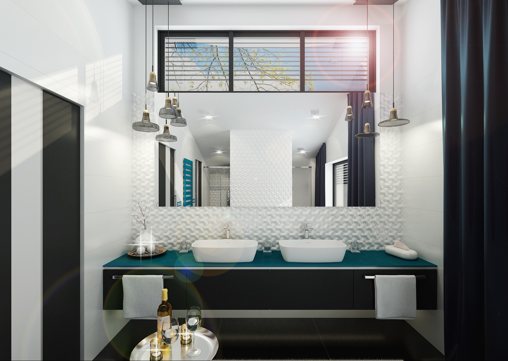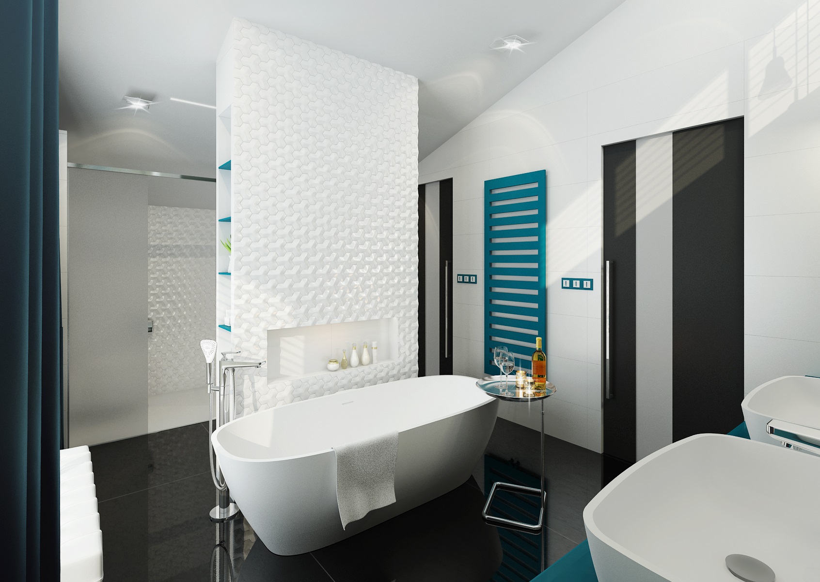 Black and white bathroom with tiles and high-gloss furniture with a strong accent of the dark turquoise color of the ladder radiator and glass tops under the sinks. However, the main element of the bathroom is a free-standing bathtub and a central partition with a 3D mosaic. Unconventionally, the lighting of the mirror at washbasins is also solved, where several types of design lighting have been hung.