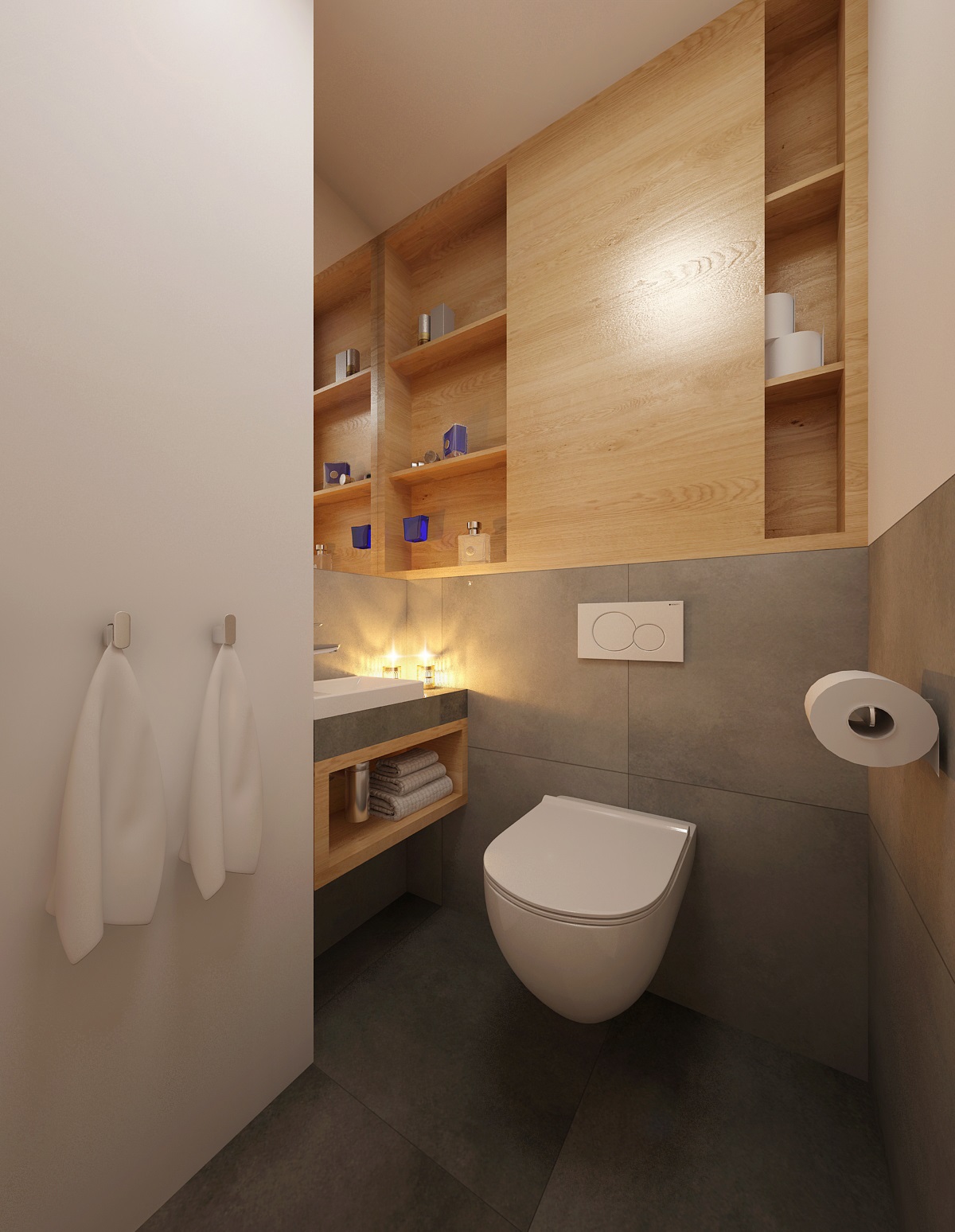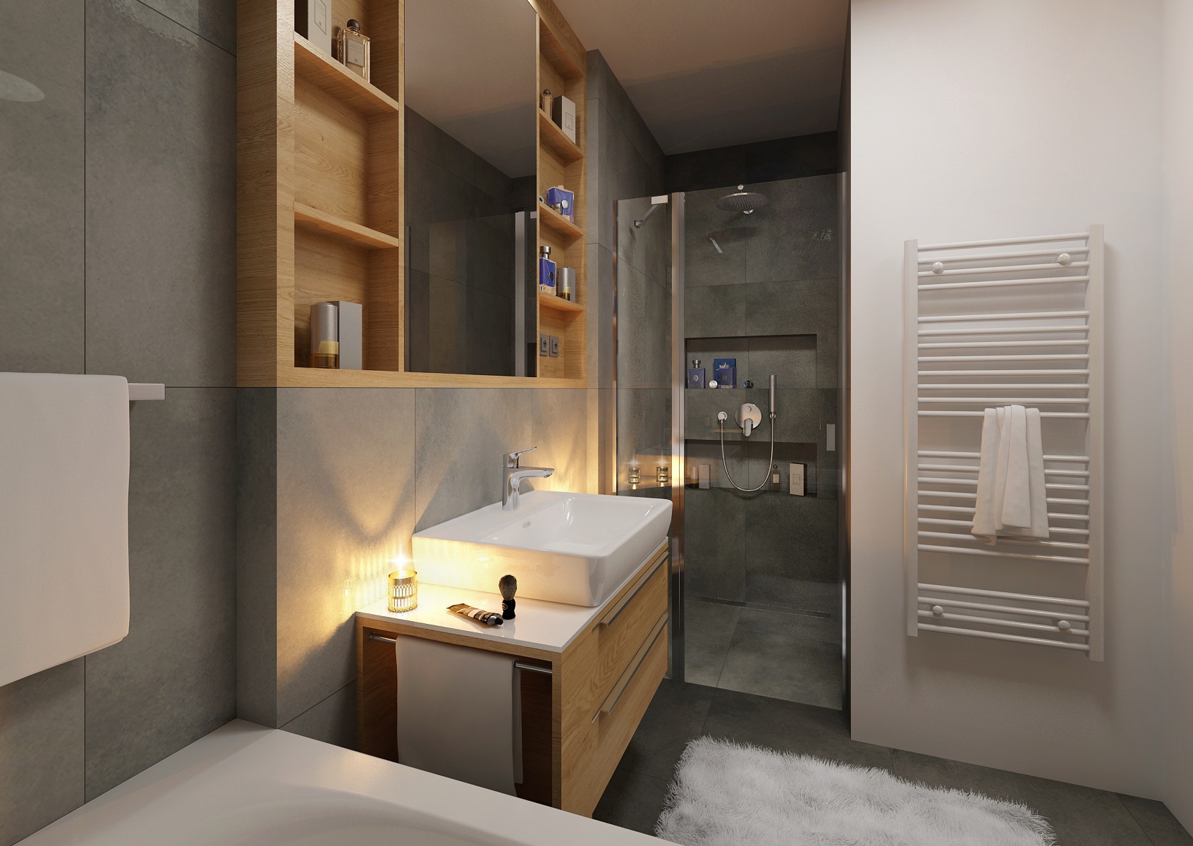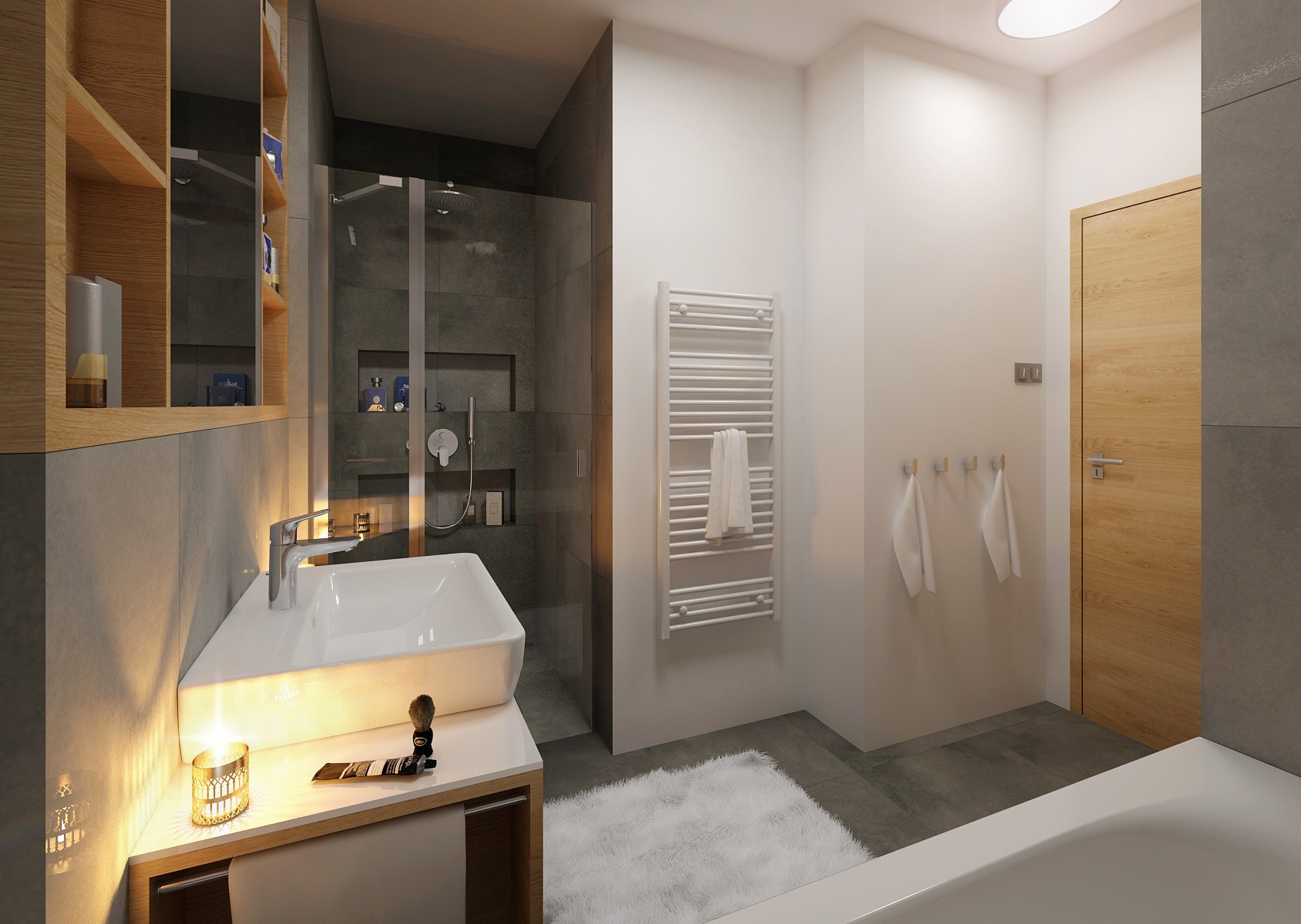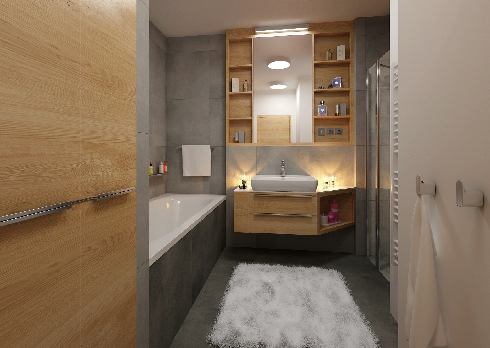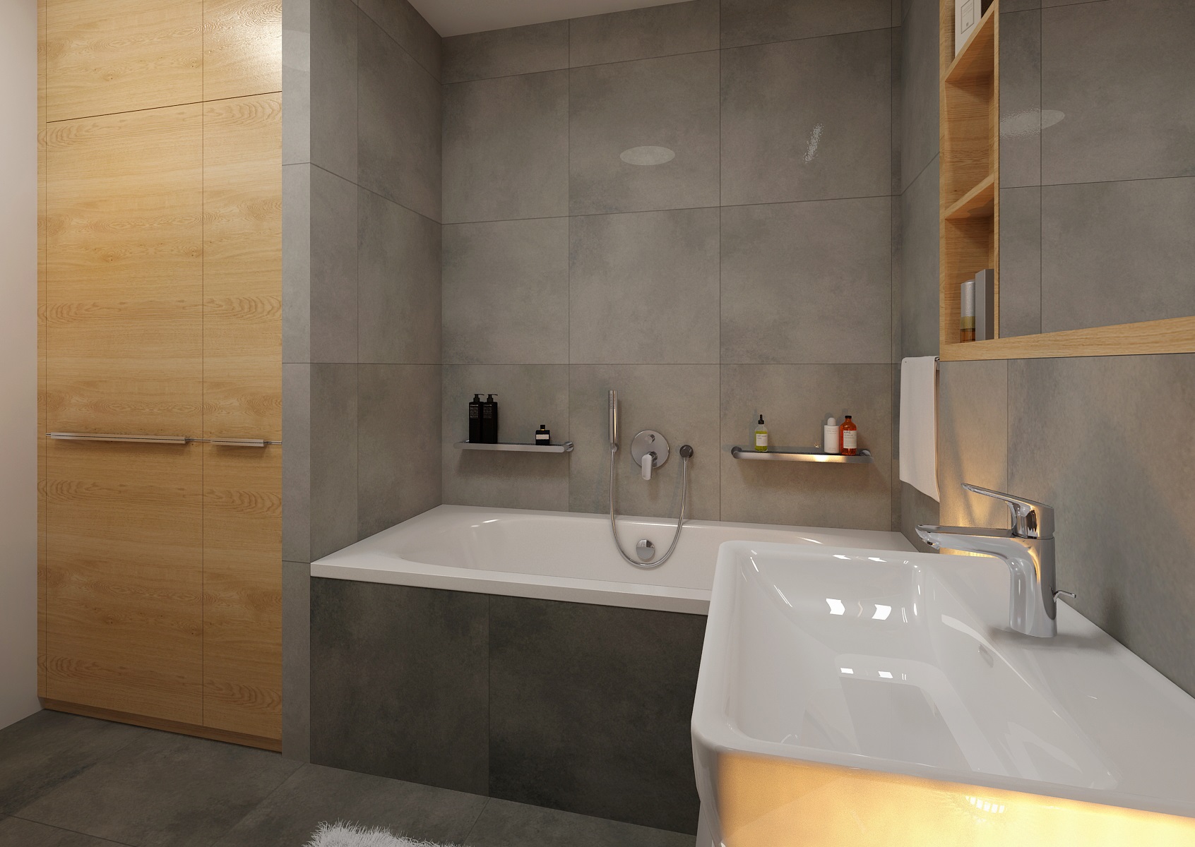 can be renovated with practicality and elegant taste. The combination of gray and wood decor adds a touch of space, here in particular paving and tiling with imitation concrete and natural oak decor on bathroom furniture. Neutral white is represented here by sanitary ware and waterproof wall painting. The space increased at the expense of the hall and the washing machine also fit into the built-in wardrobe.
