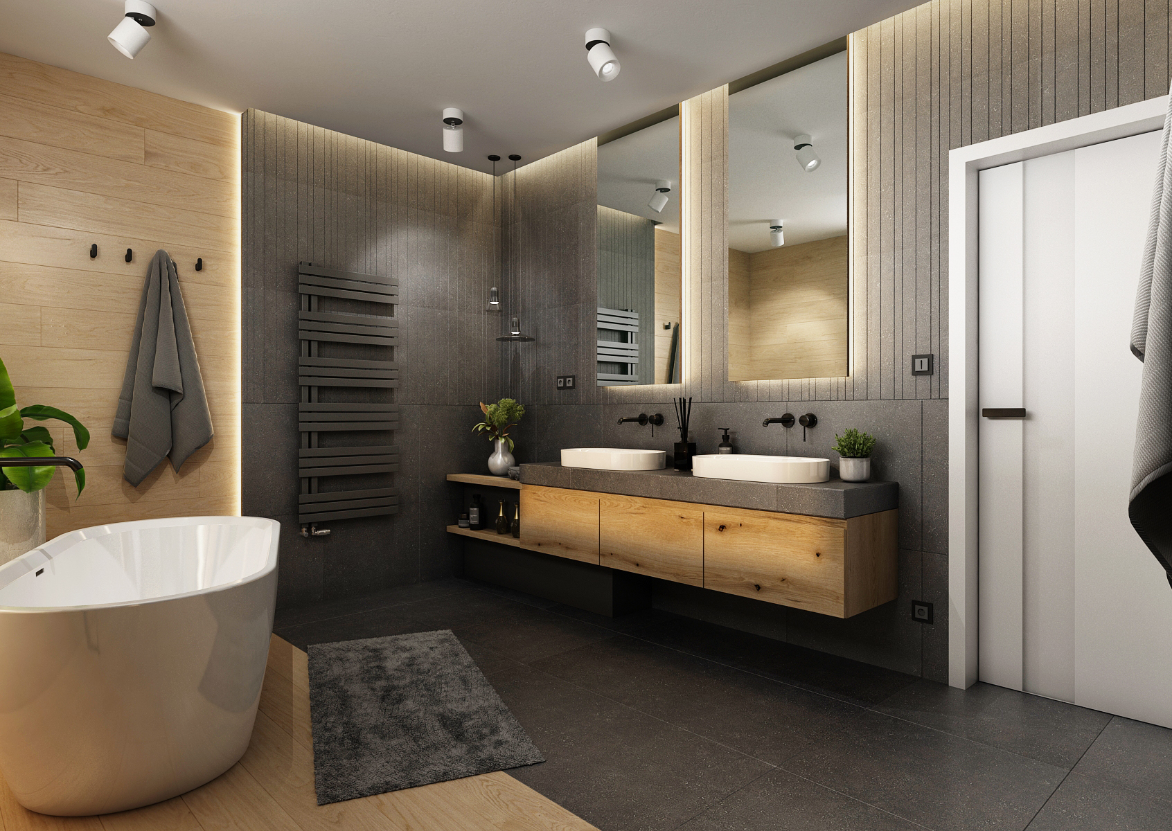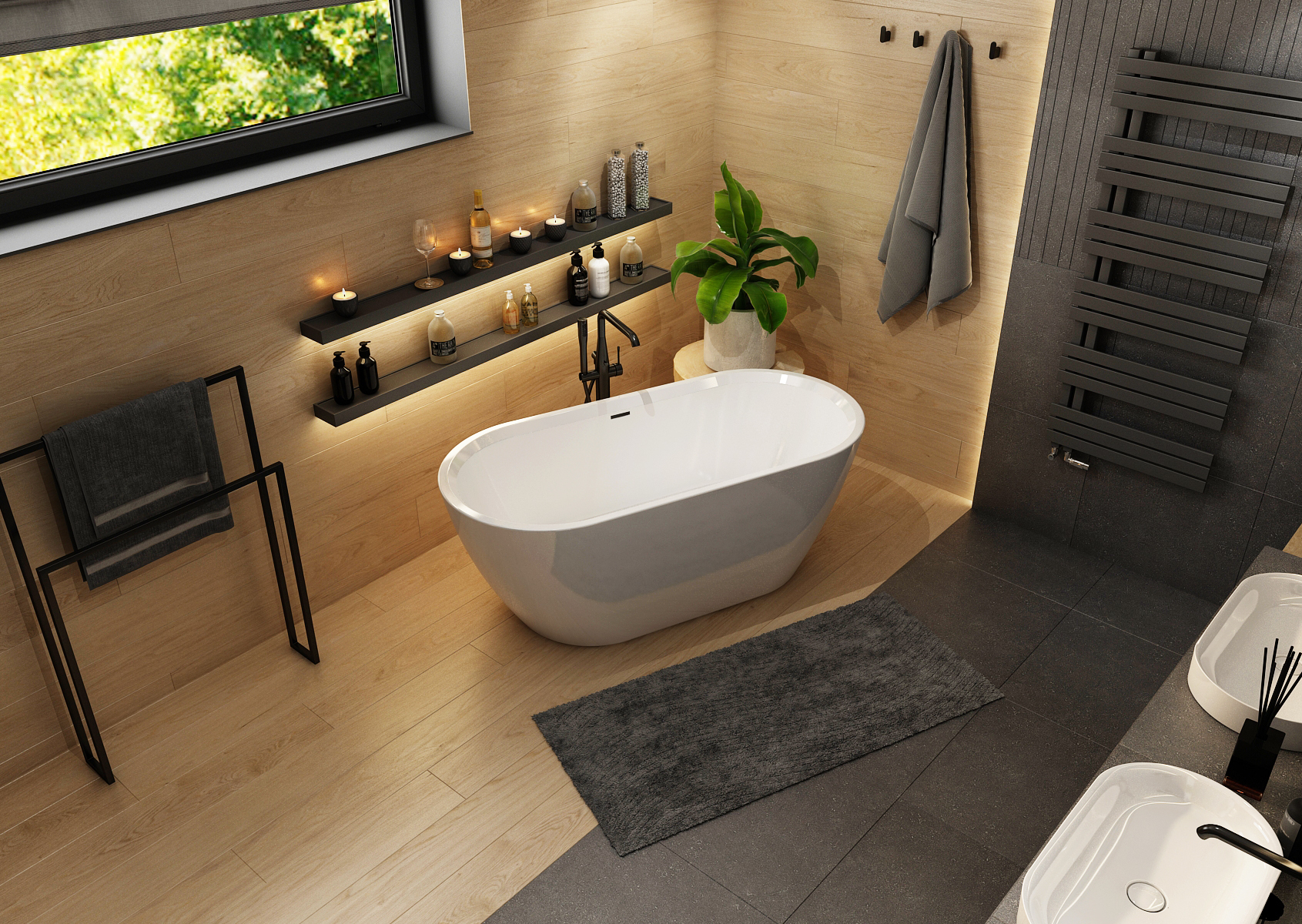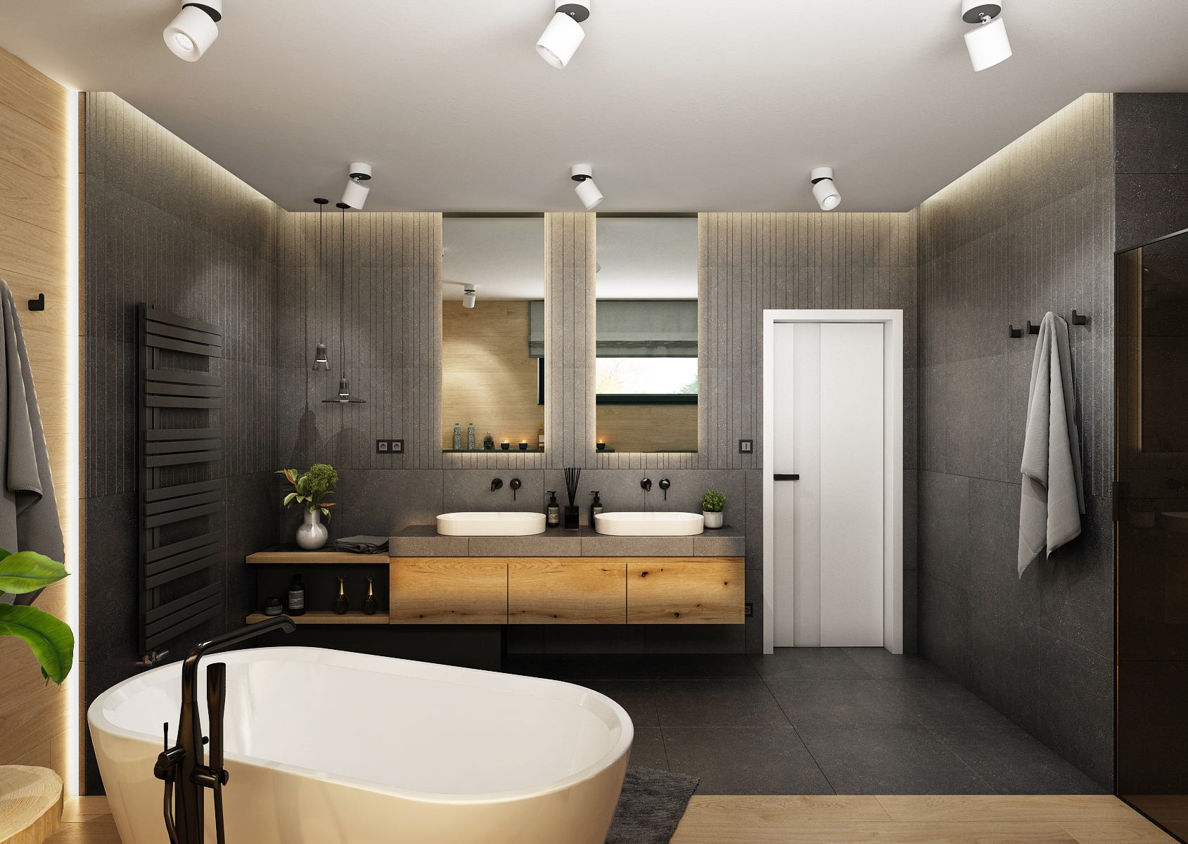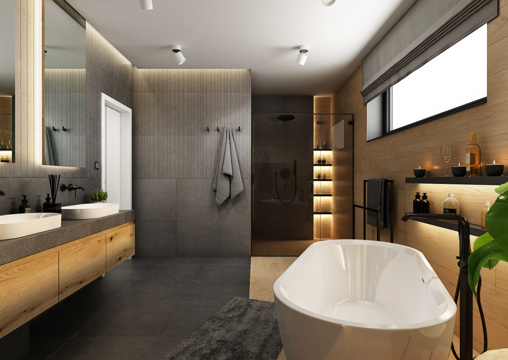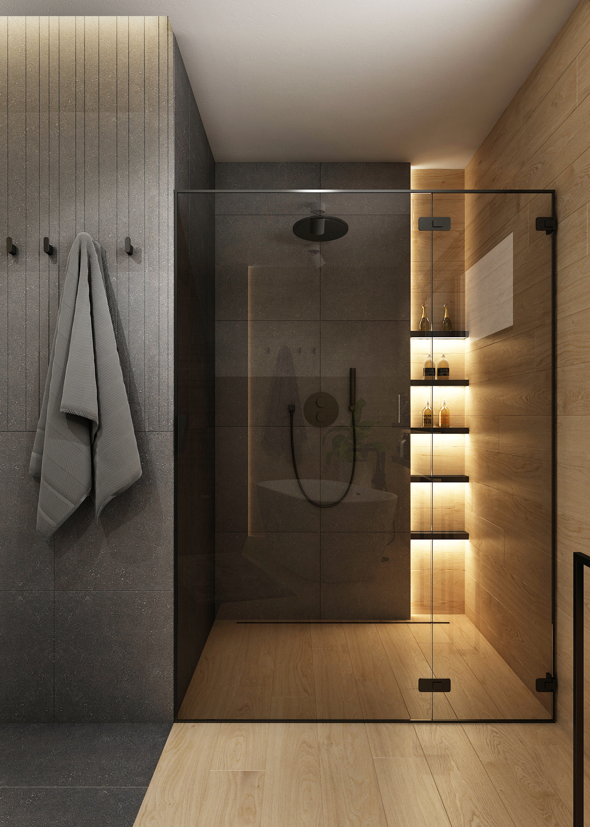 Tiles with an oak motif were used on the light half, which illuminates the space and connects it with nature. Under the narrow window is a solitary bathtub with a black faucet and storage shelves. The walk-in shower in the alcove is complemented by backlit shelves. In addition to ambient lighting, the space is illuminated by ceiling reflectors.
