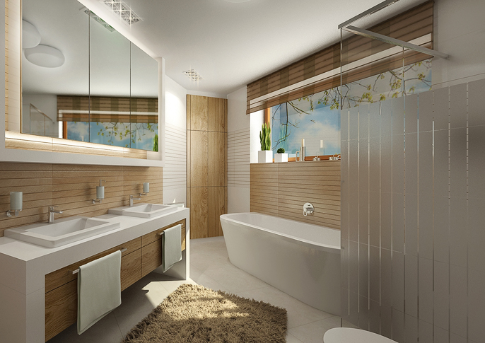 The white bathroom with tiles imitating the decor of oak, which is repeated on the furniture, looks natural and clean. The combination of colors and oak decor together with white tiles creates a pleasant and bright interior. The window gives the room plenty of natural light.