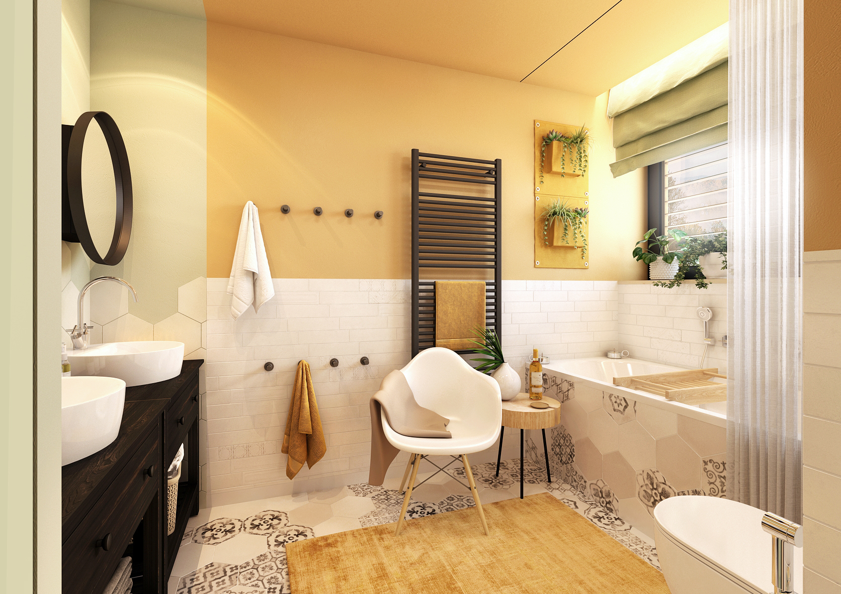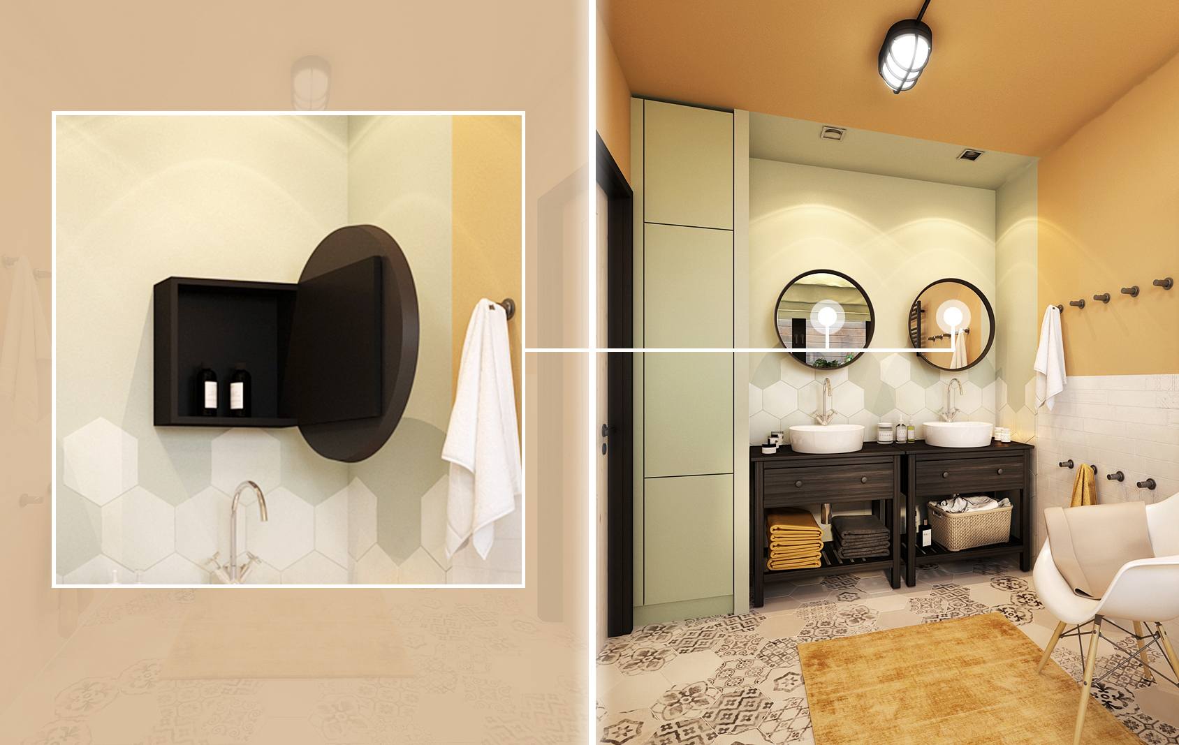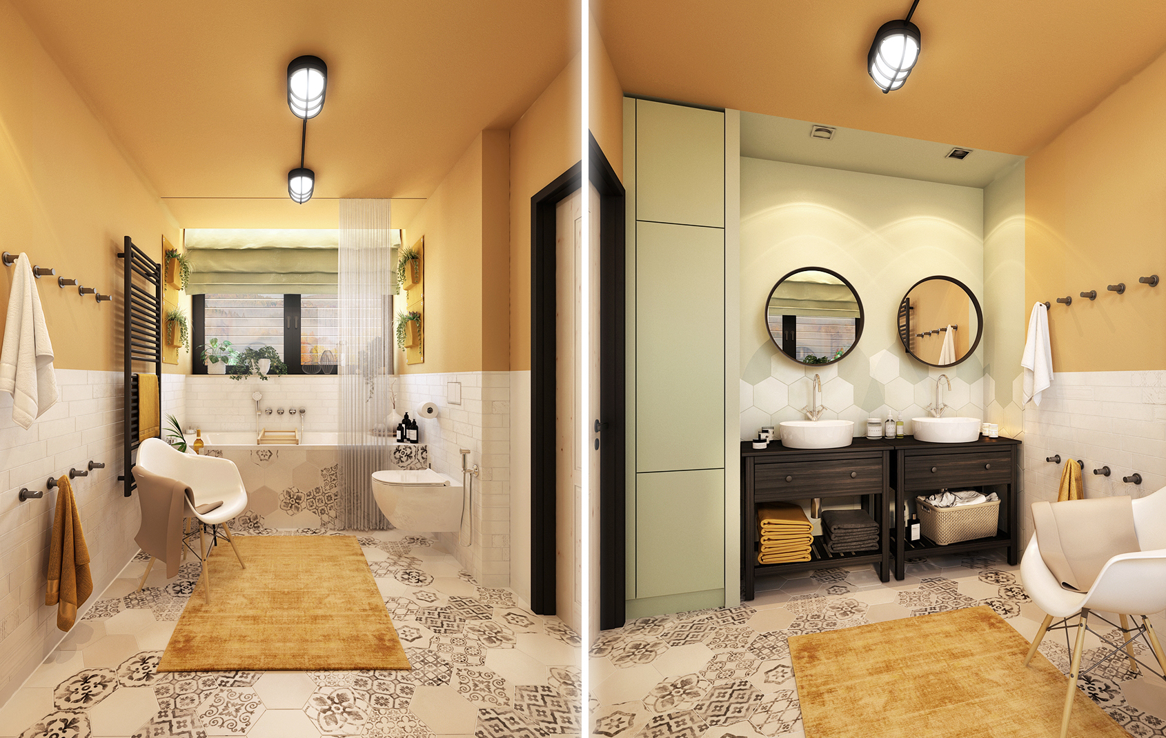 The yellow variant is mainly proud of the patterned mosaic on the hexagonal paving, which continues into the tiling around the bathtub. Black accessories contrast with bright yellow here. The handleless tall cabinet by the mirror serves as sufficient storage space for necessary things. However, if there were not enough of them and even the drawers and shelves under the sinks were not enough, there are also hidden cabinets behind the mirrors that appear when they are opened.