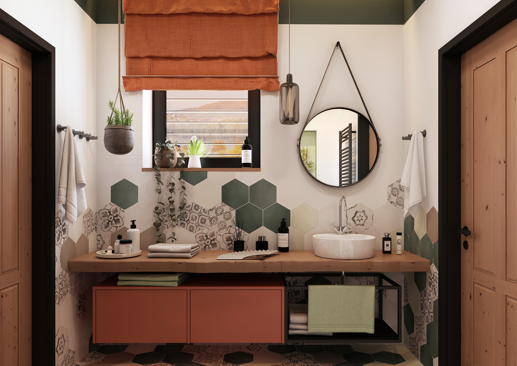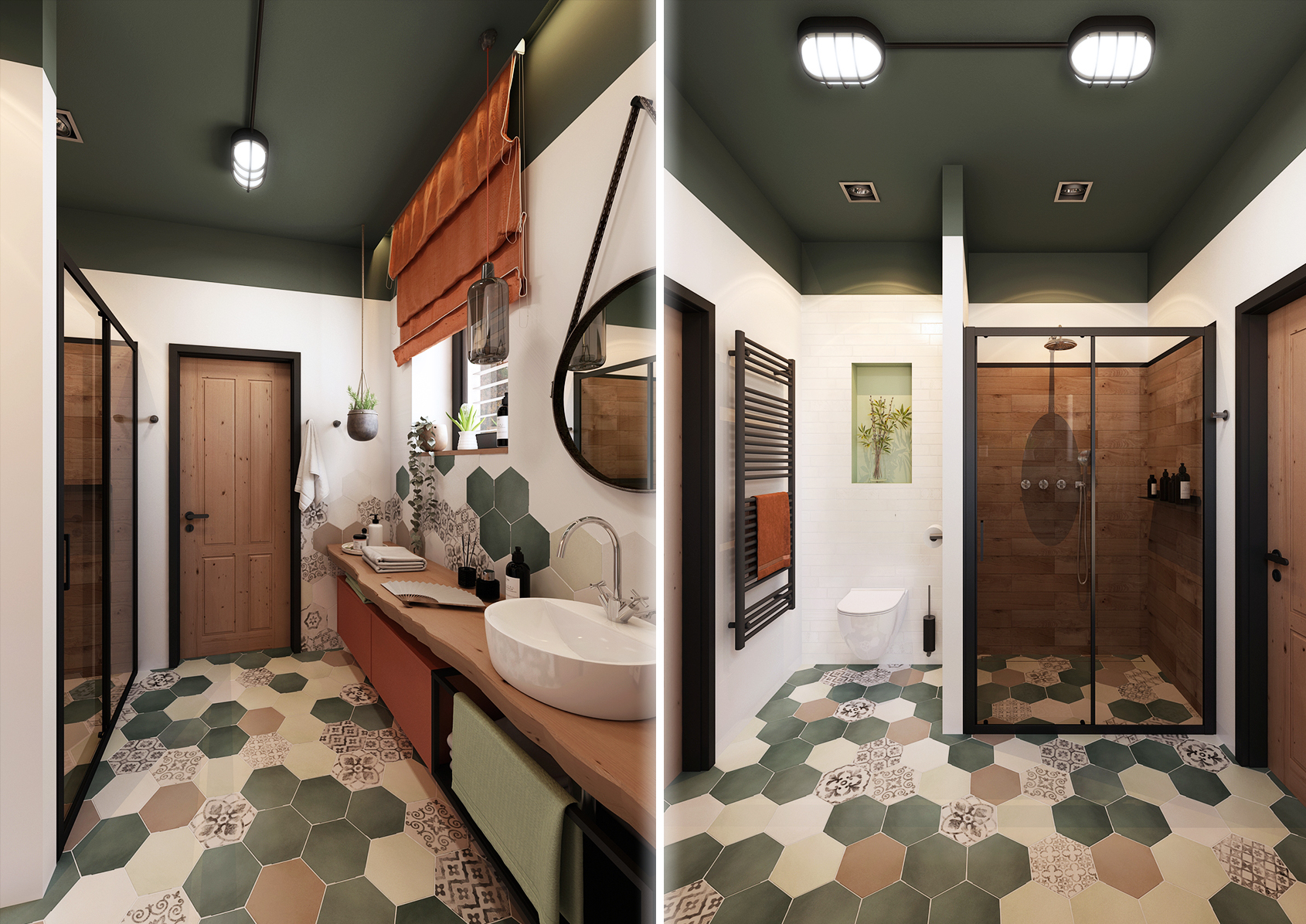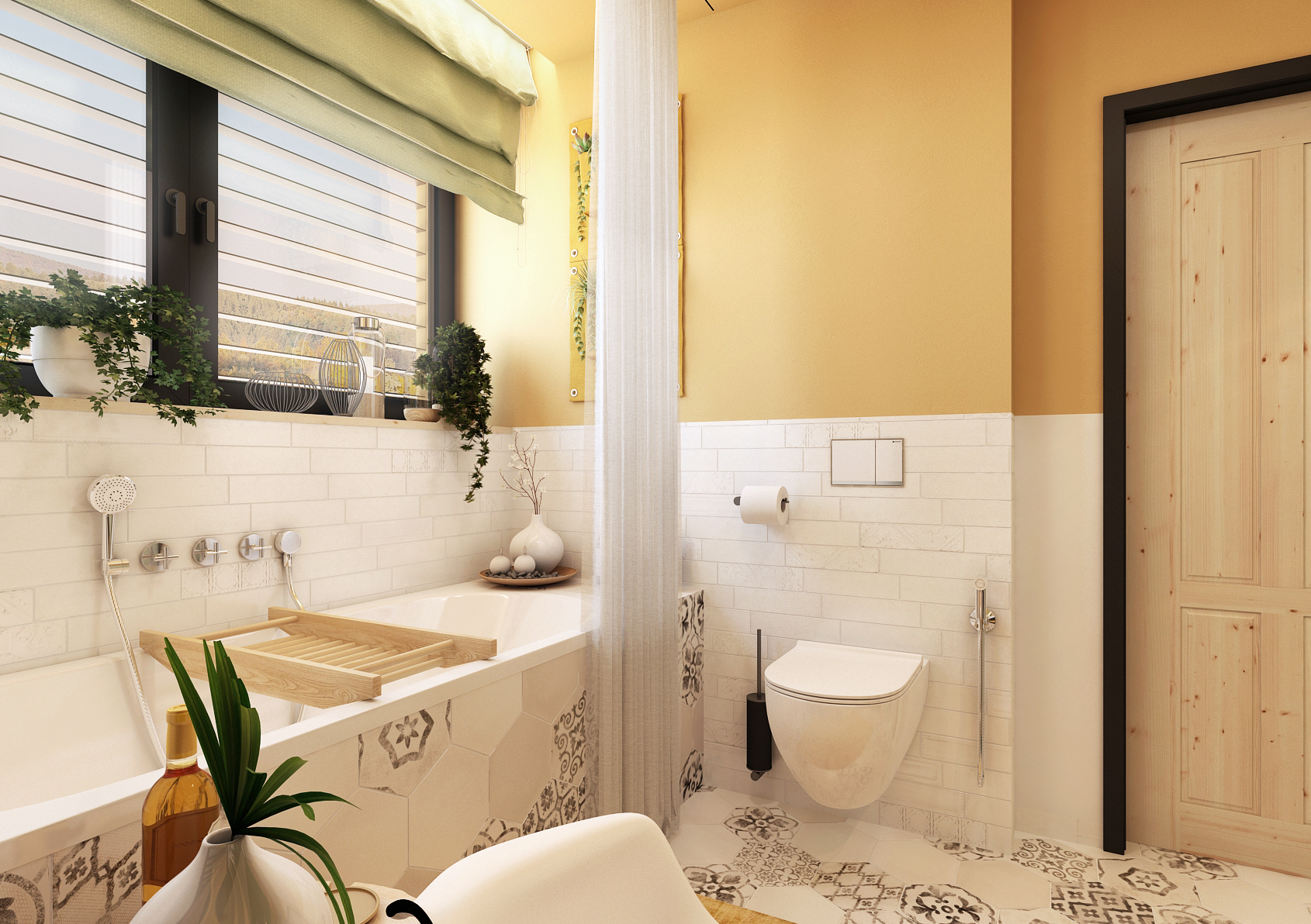 The yellow variant is mainly proud of the patterned mosaic on the hexagonal paving, which continues into the tiling around the bathtub. Black accessories contrast with bright yellow here. The handleless tall cabinet by the mirror serves as sufficient storage space for necessary things. However, if there were not enough of them and even the drawers and shelves under the sinks were not enough, there are also hidden cabinets behind the mirrors that appear when they are opened.
