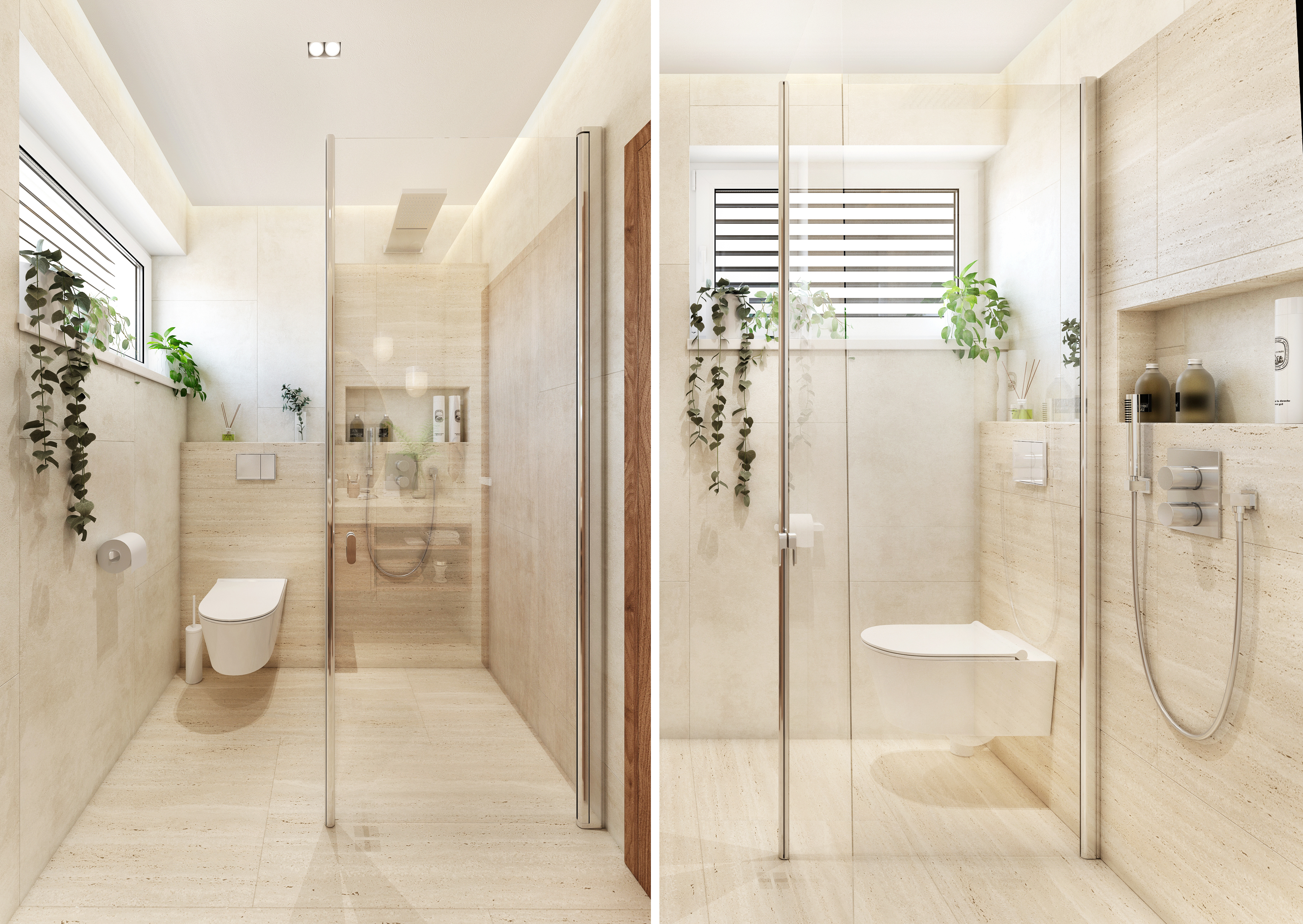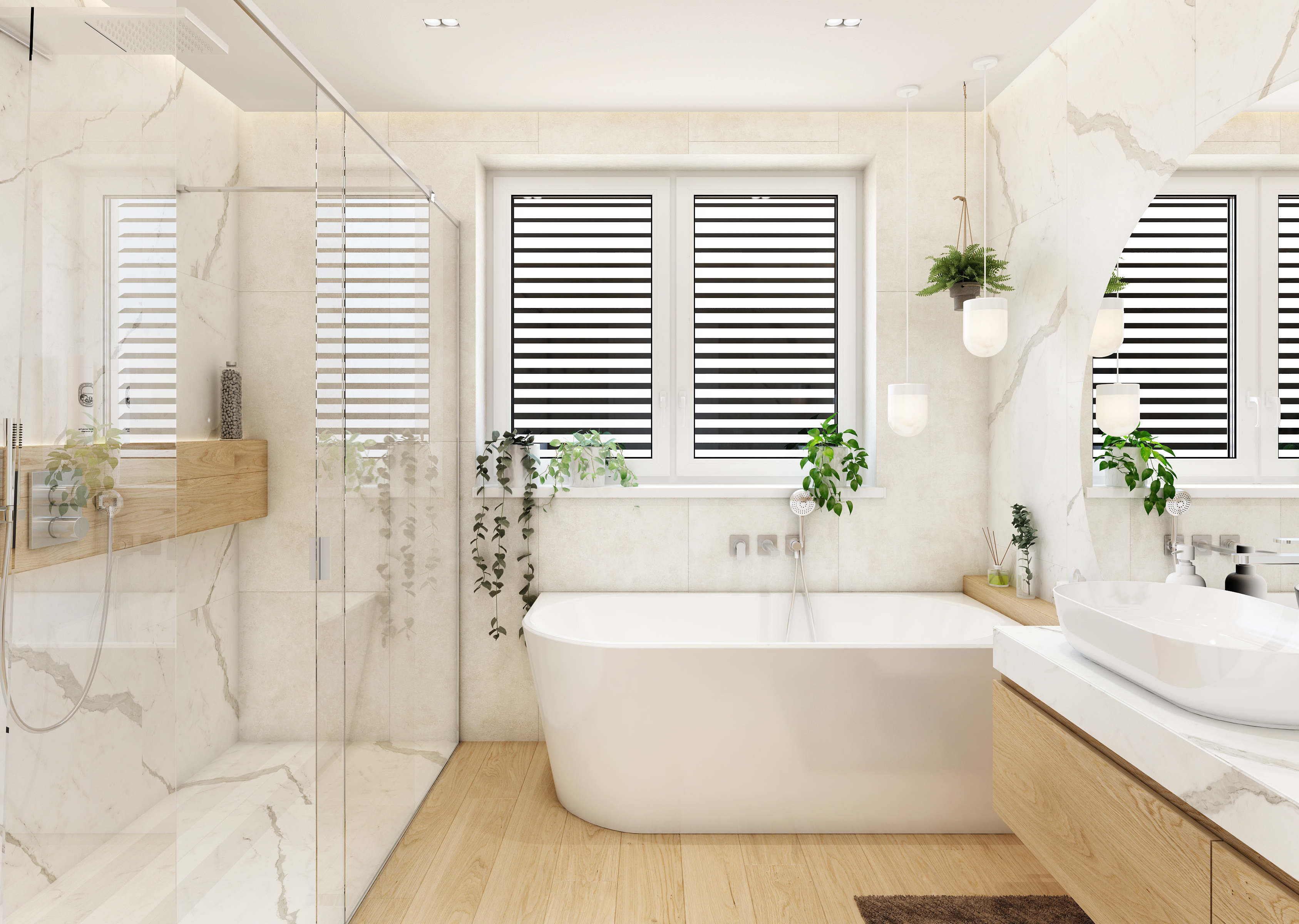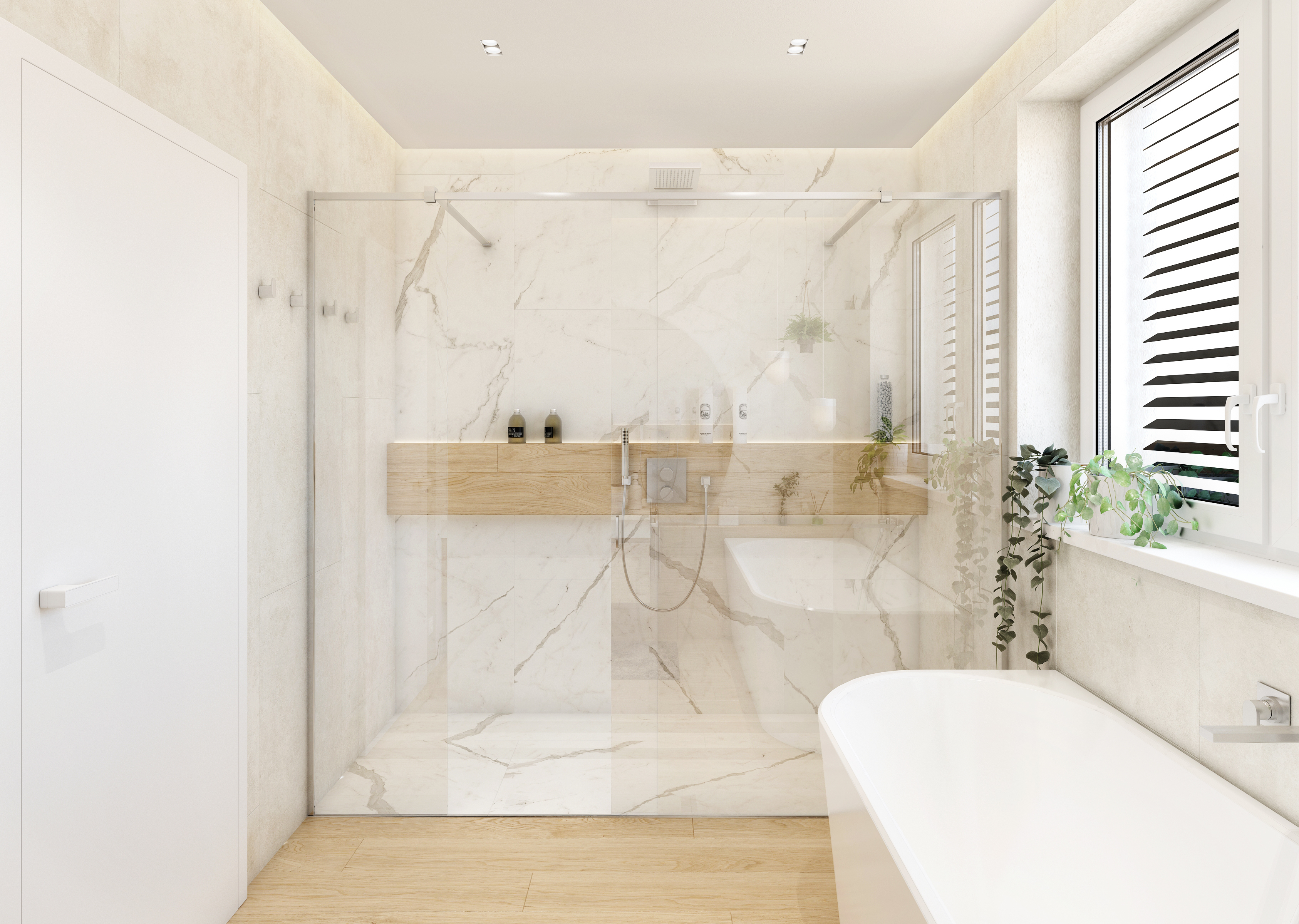 The entire bathroom is decorated with large-format marble tiling, which, together with a spacious walk-in shower and a corner bathtub, creates a completely elegant and simple interior. A longitudinal shower panel with backlight stretches across the entire length of the shower, which can also serve as a place to store necessary things.