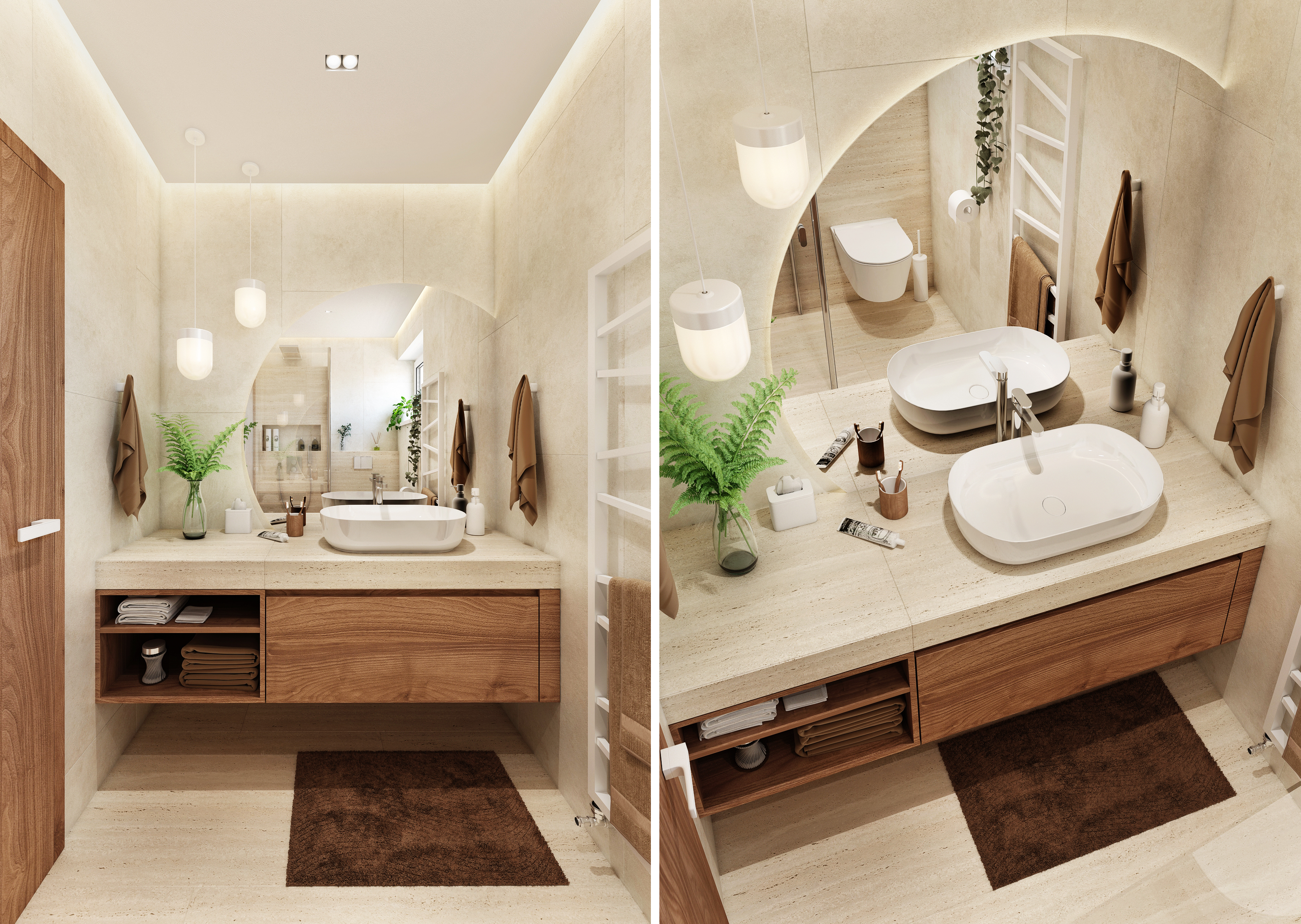 The smaller of the bathrooms is brightened up with brown accessories matching the walnut nozzle on the sink cabinet. The space is illuminated using built-in spotlights and a suspended ceiling.