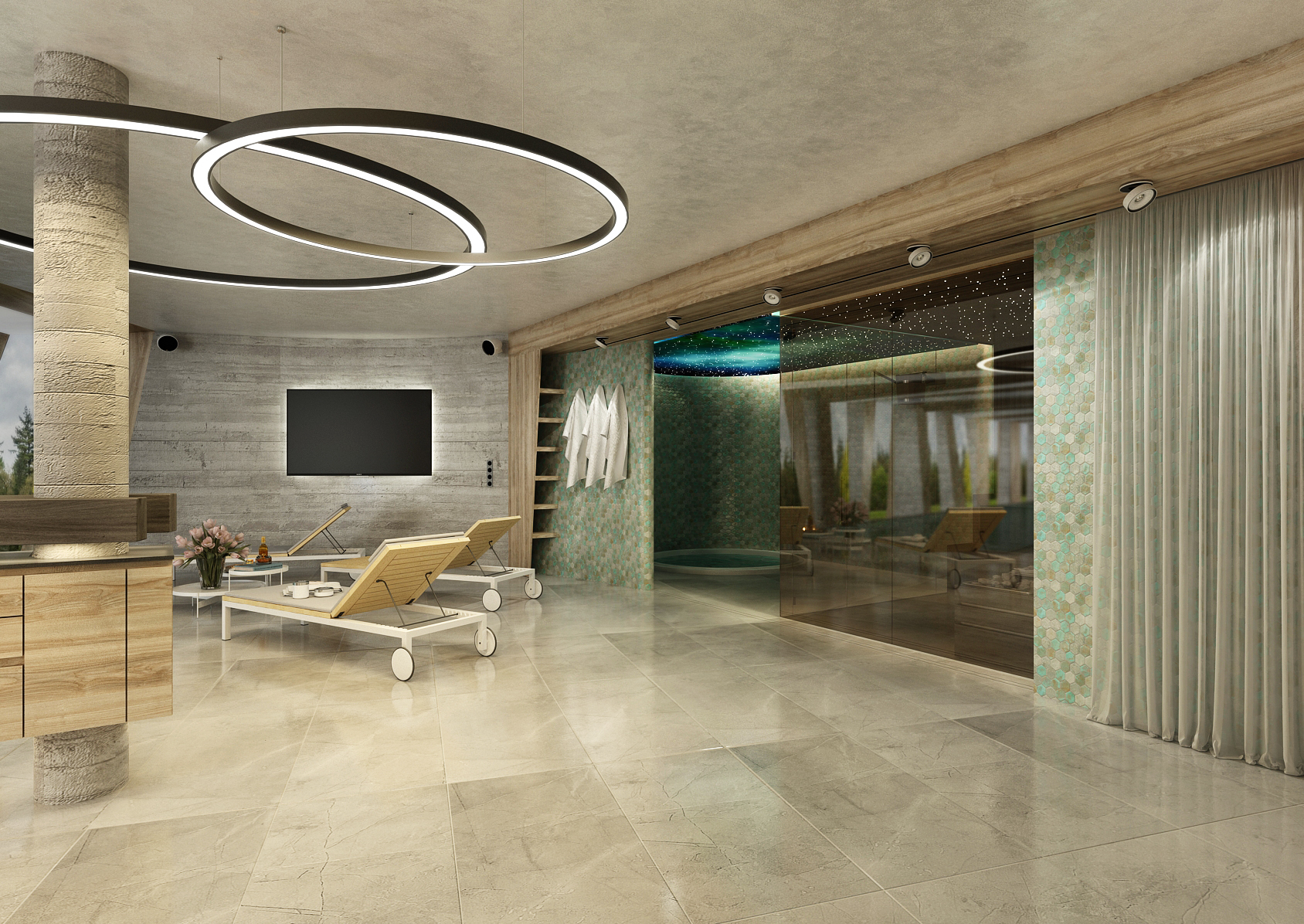The wellness area also includes a hot tub with a shower with a mosaic tile in green tones. A space ceiling with spotlights representing the stars also contributes to relaxation.