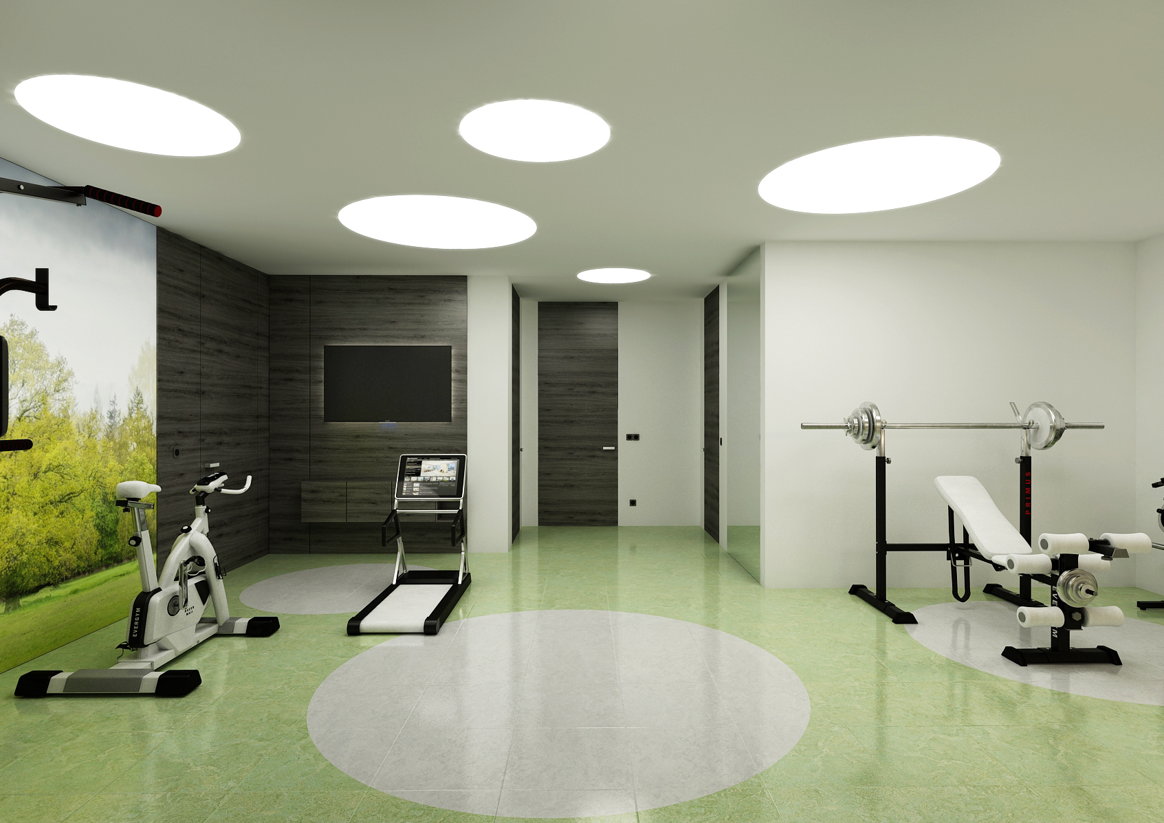 The gym also includes a spacious bathroom with a walk-in shower and green accessories that add a little natural touch to the white interior. Parts of the bathroom are embellished with tiles that resemble bubbles.