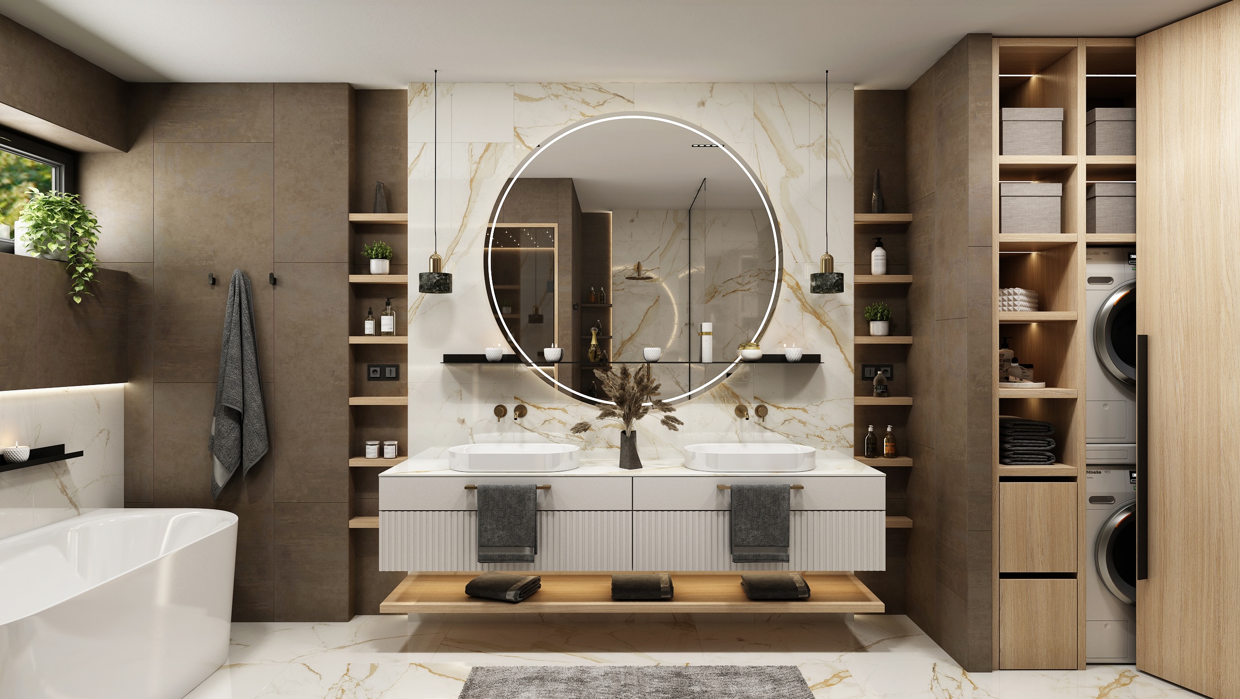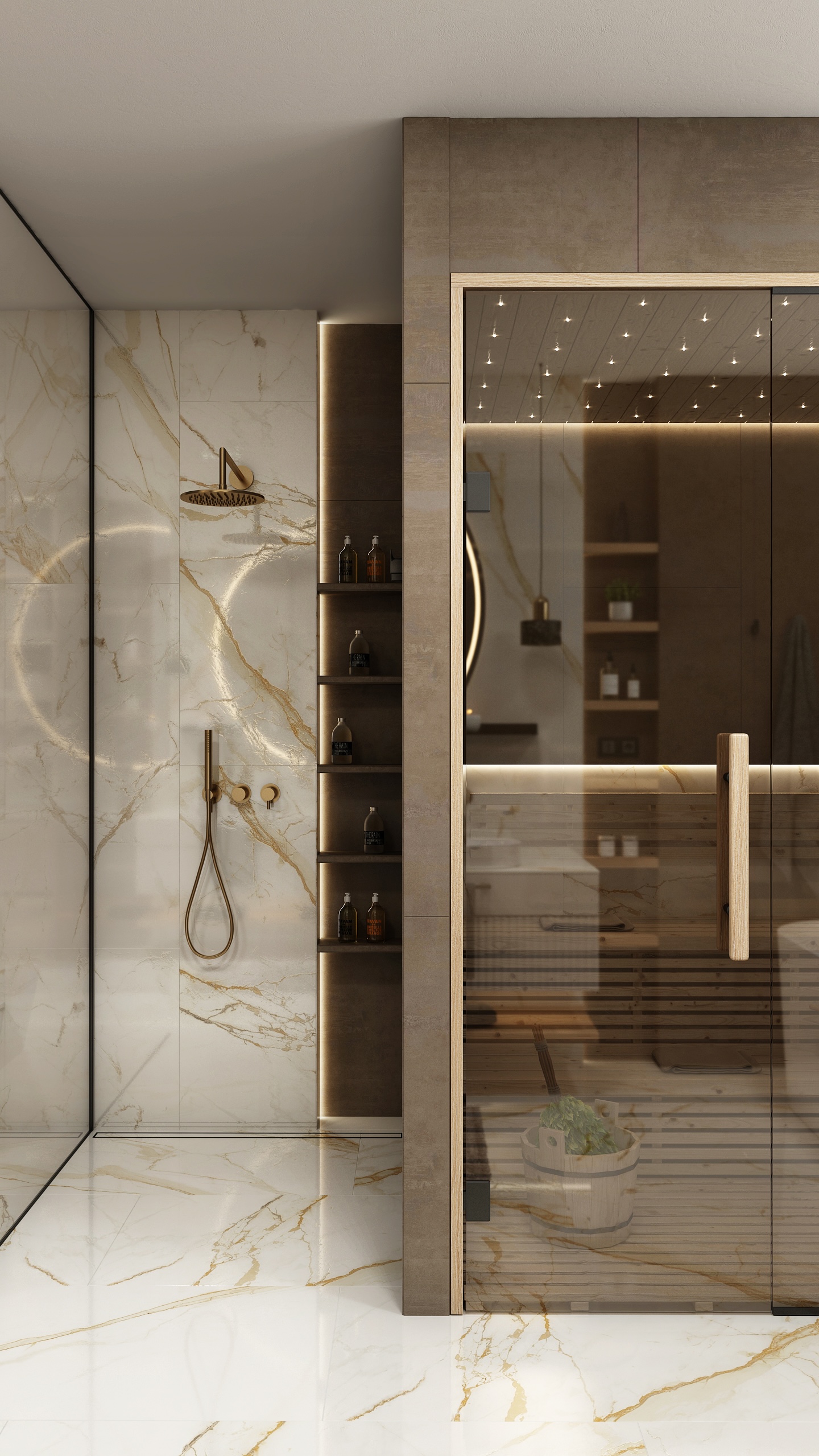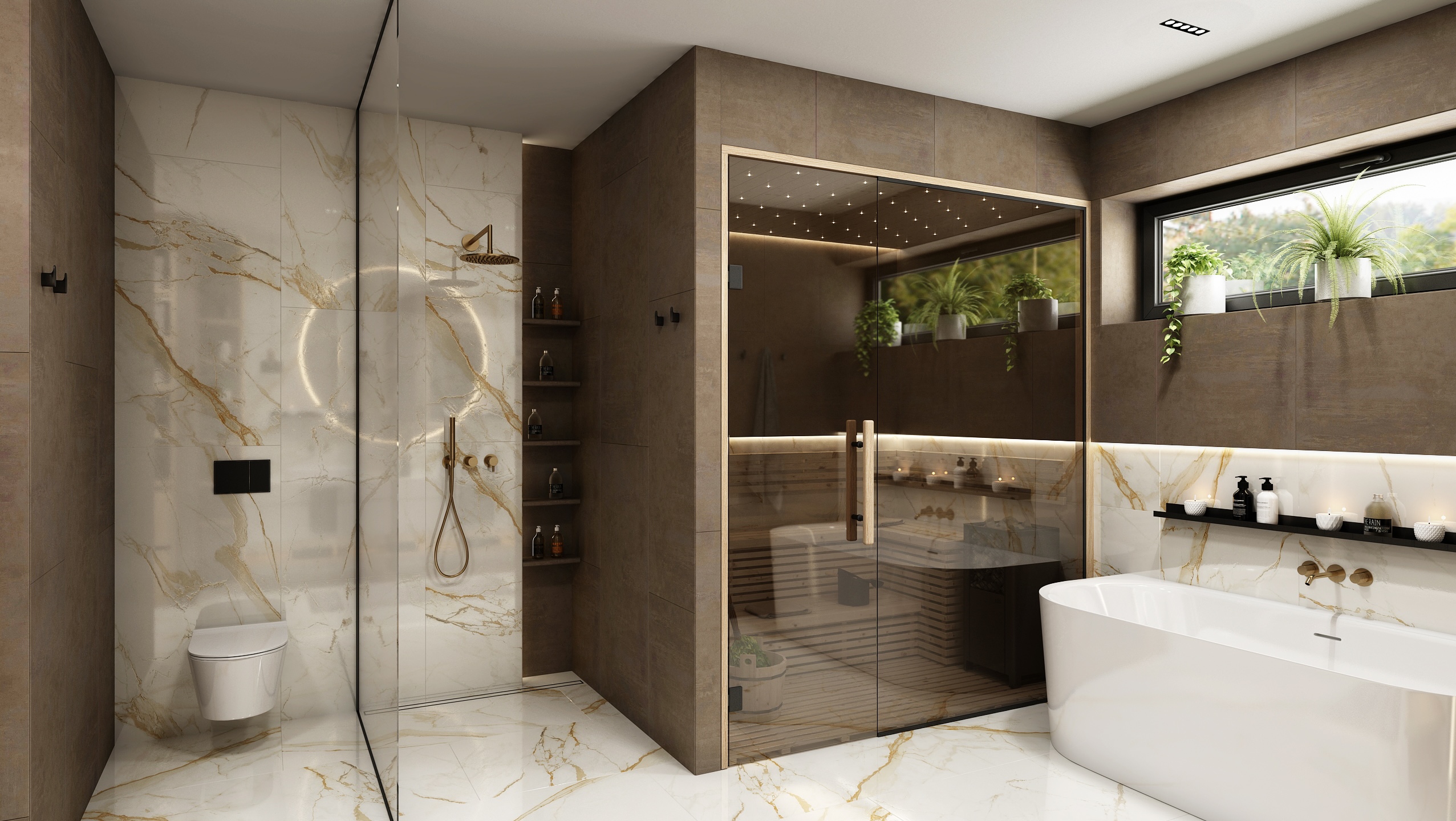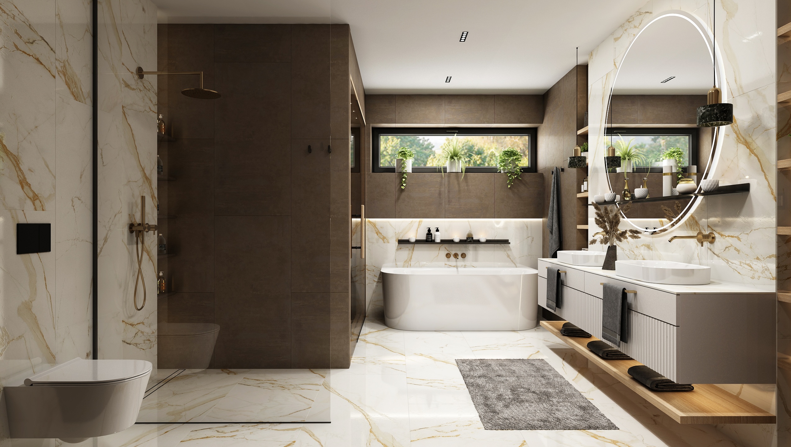 The interior of the bathroom is made up of an elegant combination of light marble with golden veins and darker ceramic tiles.