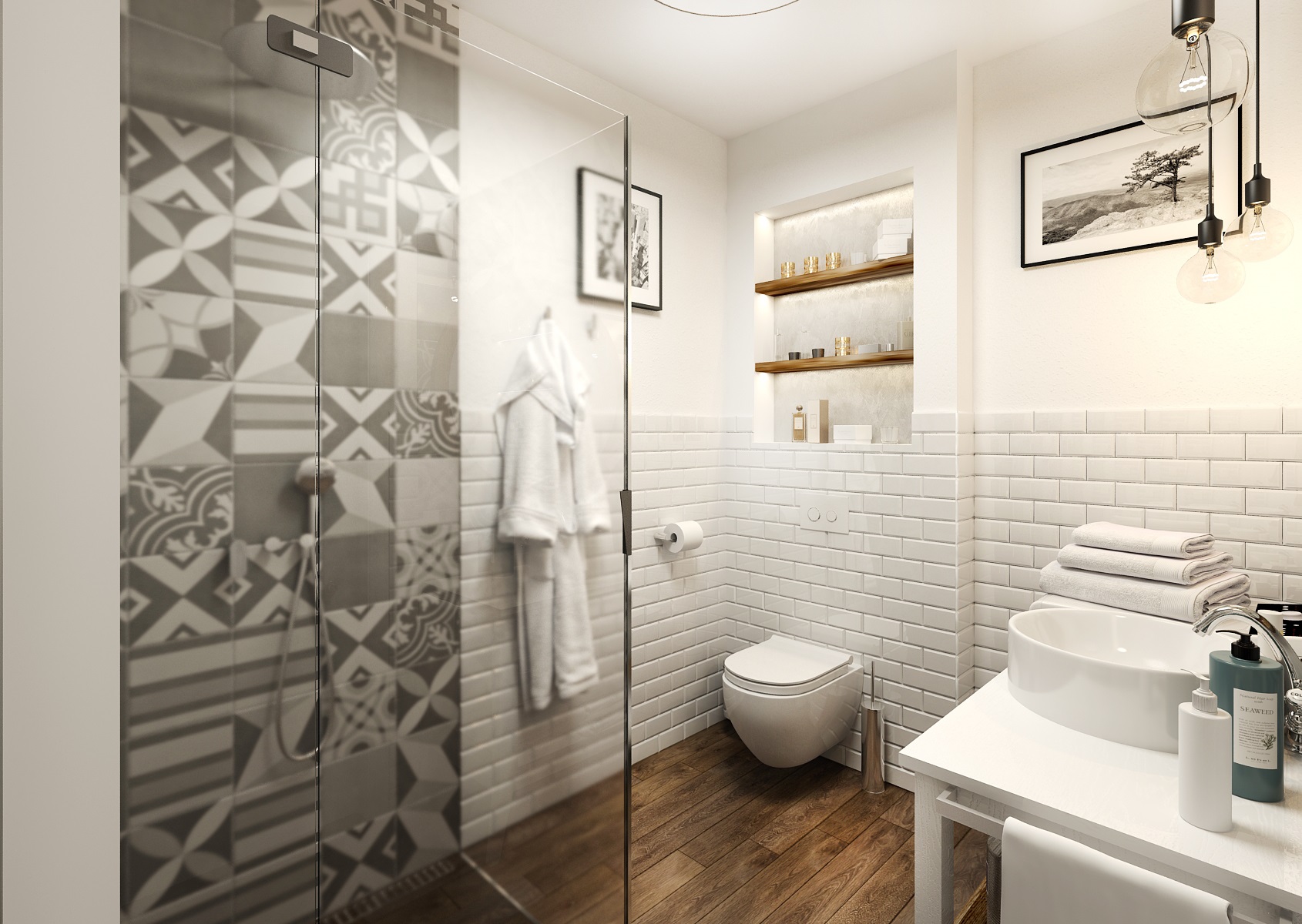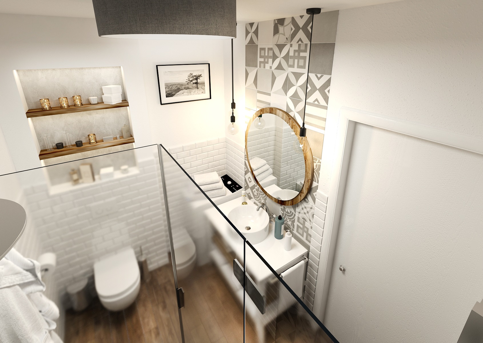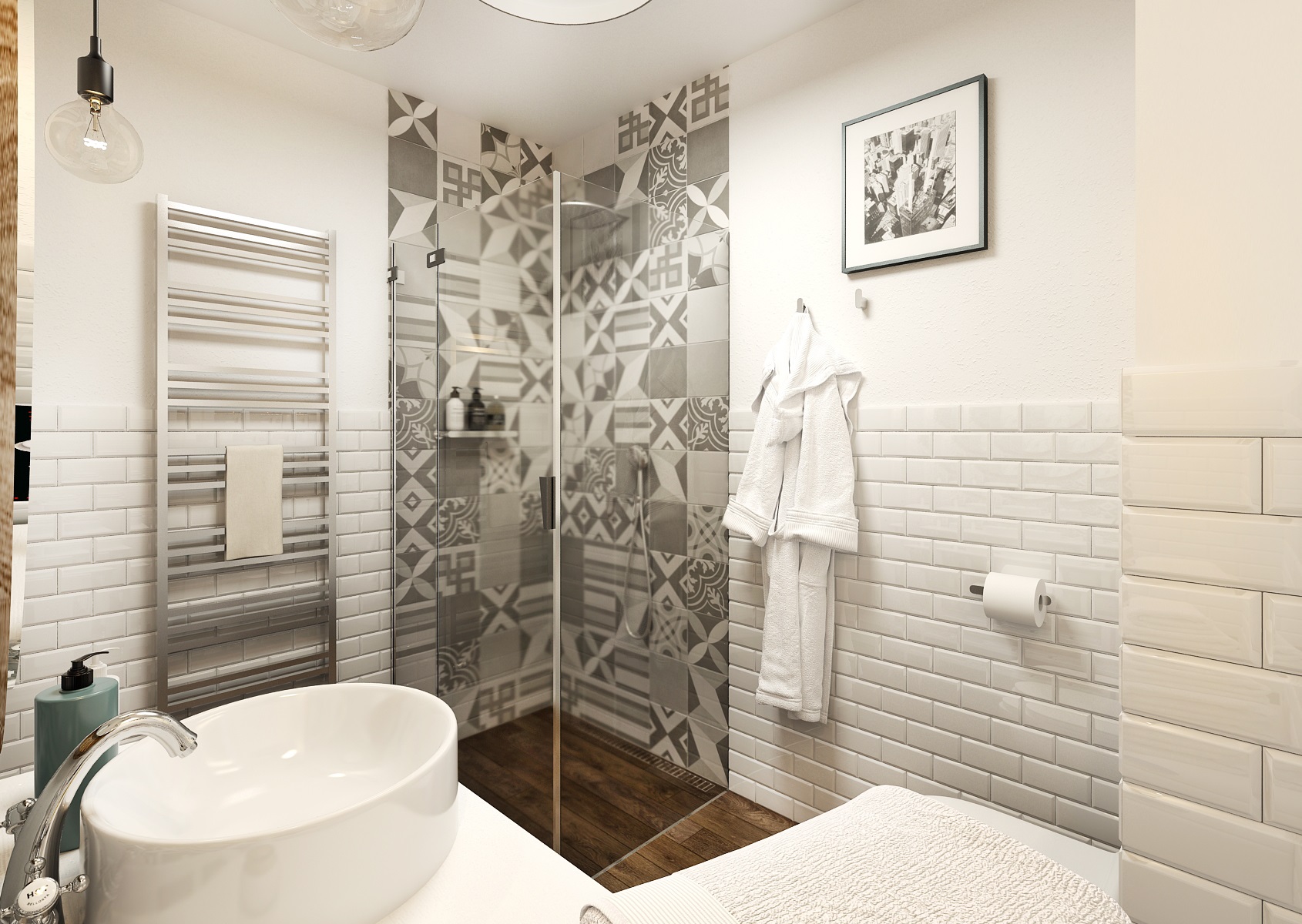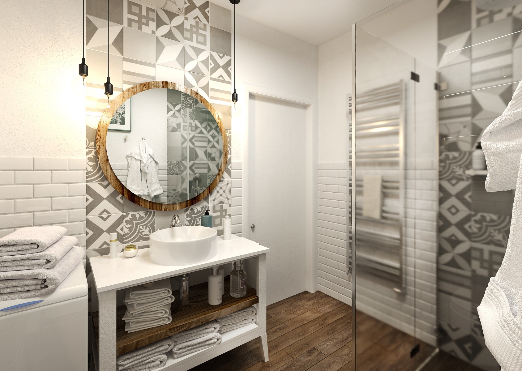 Small but stylish bathroom with retro tiles Recer Twenties - black and white graphic symbols used in the shower and behind the mirror, which harmonize with the white rectangular tiles with veneer and floor tiles in imitation of smoky oak. Wooden shelves and a wooden mirror base plate are a nice addition.